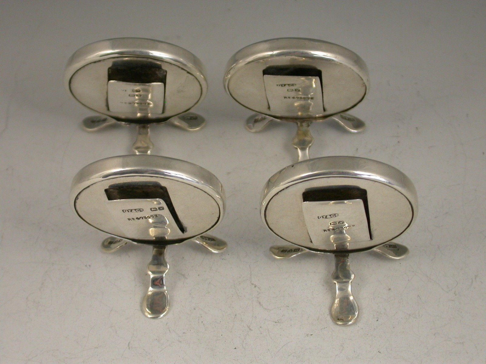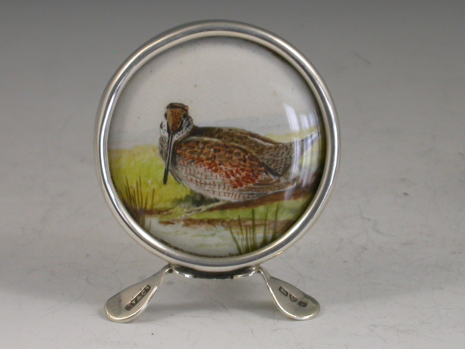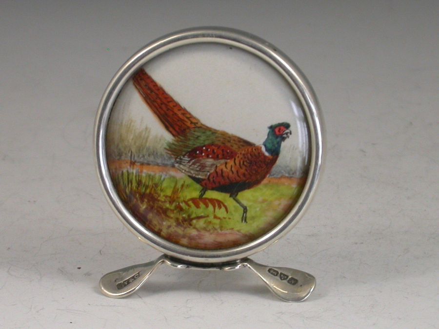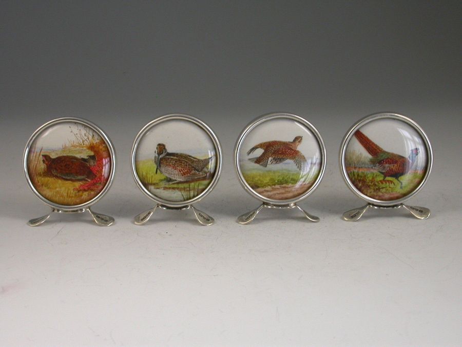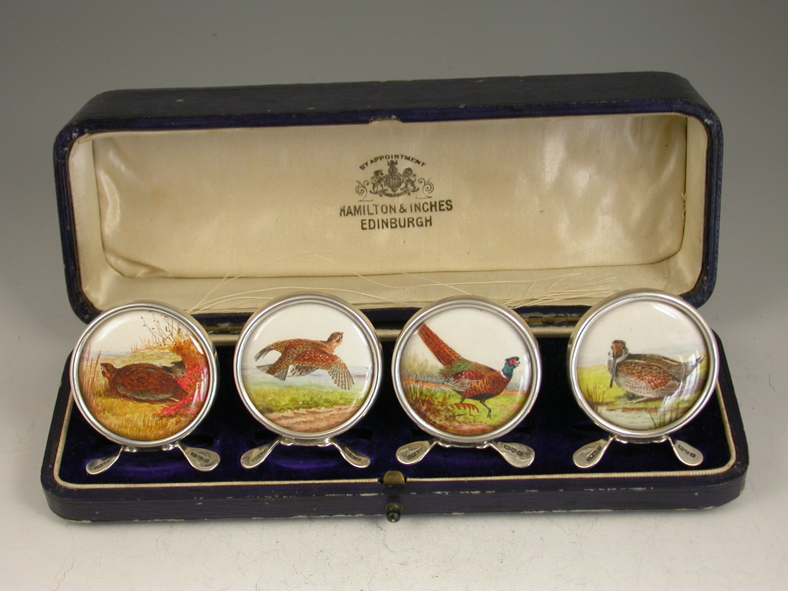 A cased set of four Edwardian silver Menu Holders of circular form standing on three splayed feet, each inset with a painted enamel disc depicting various game birds. A Cock Pheasant, a Woodcock, an English Partridge and a Grouse.