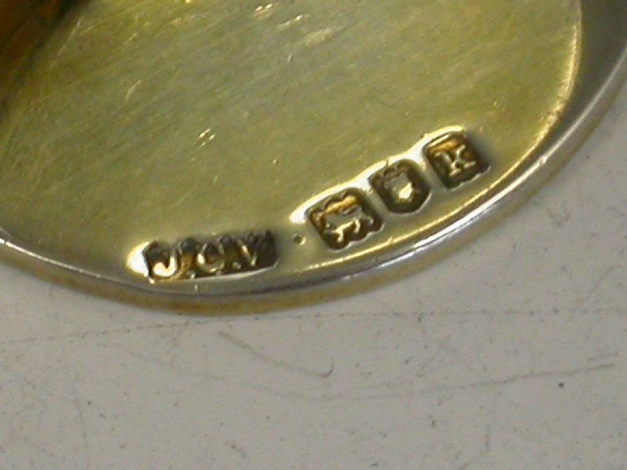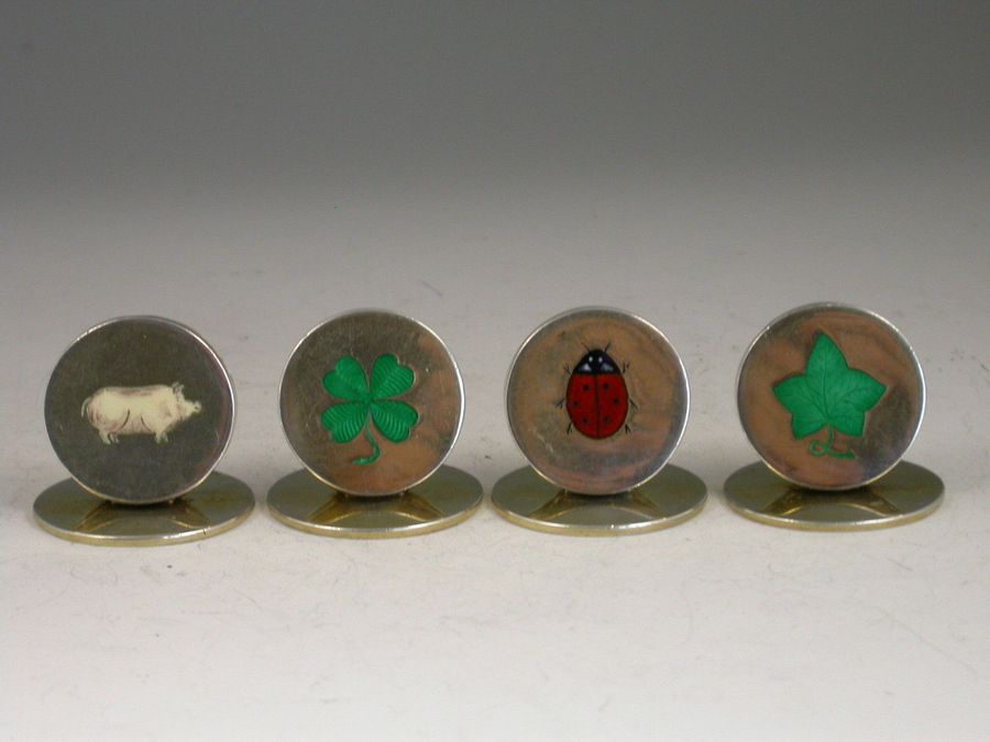 A good cased set of four Edwardian silver gilt Menu Holders, of circular disc form each enameled with a lucky symbol depicting a white pig, a ladybird, a four leaf clover and an ivy leaf.