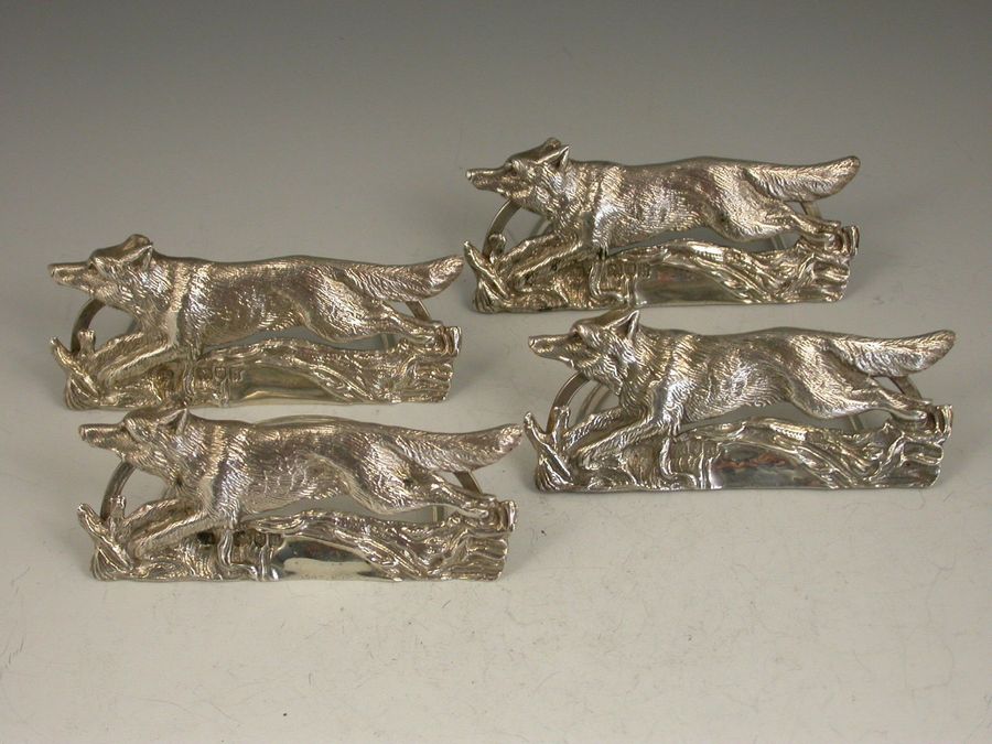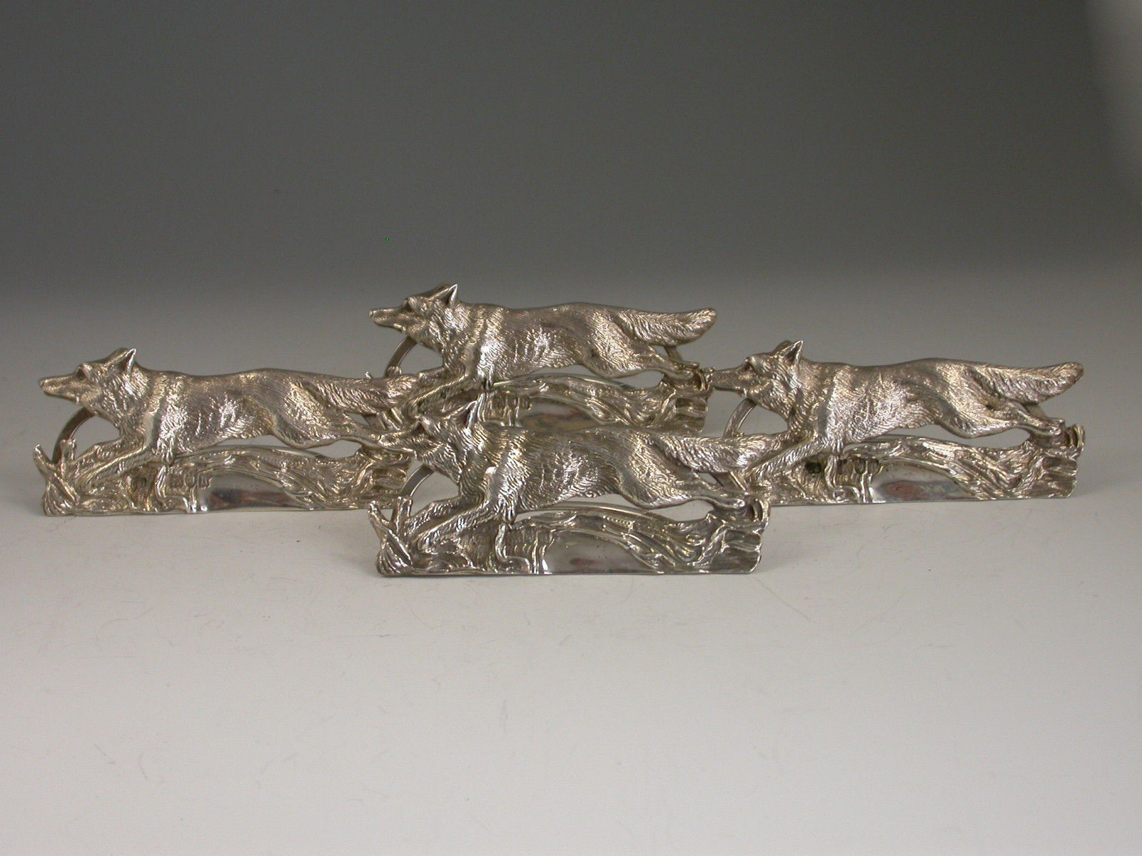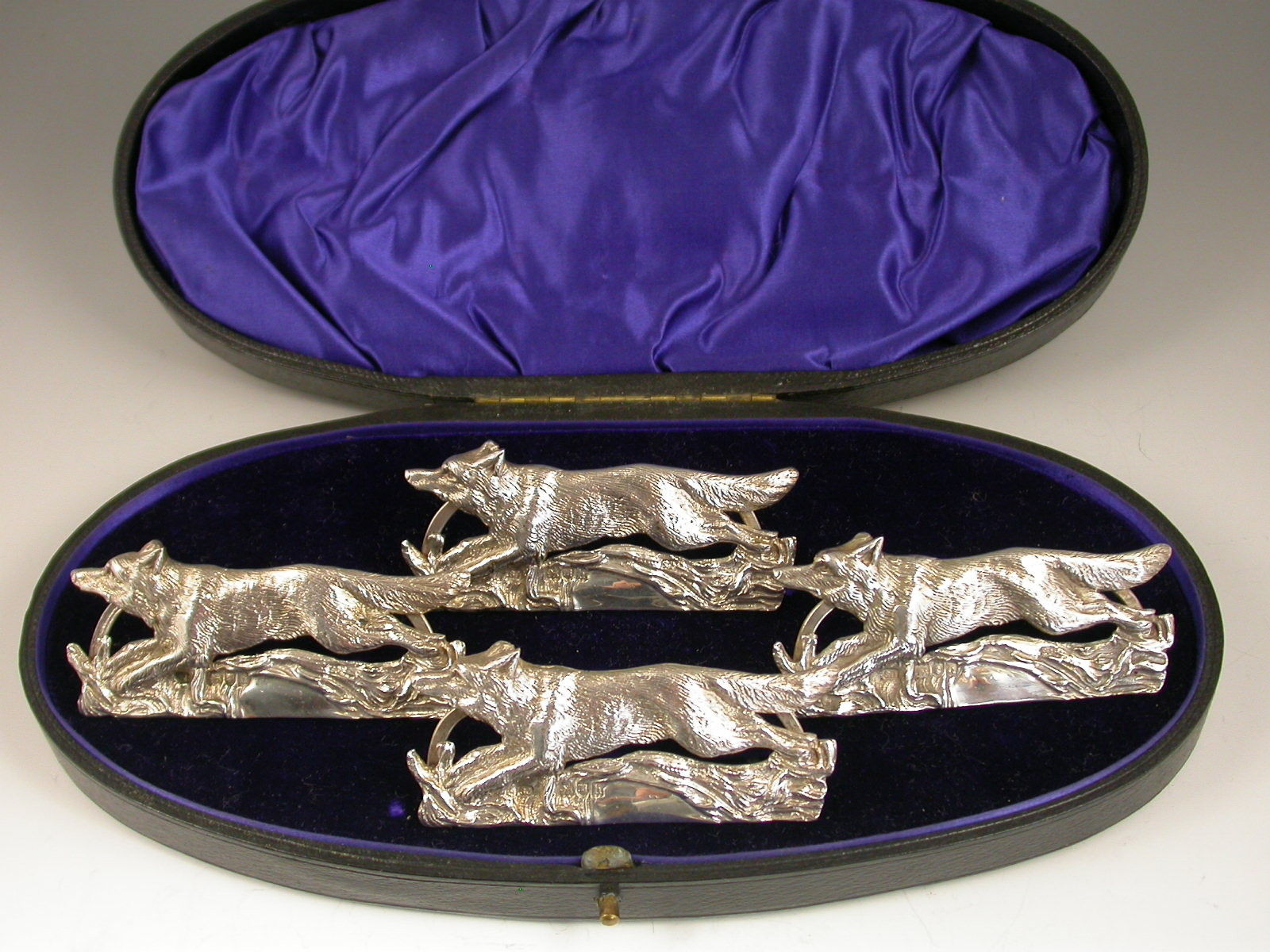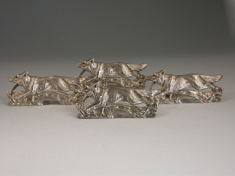 Cased Set 4 Edwardian Silver Running Foxes Menu Holders