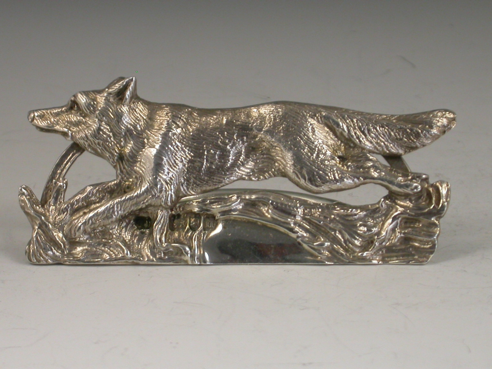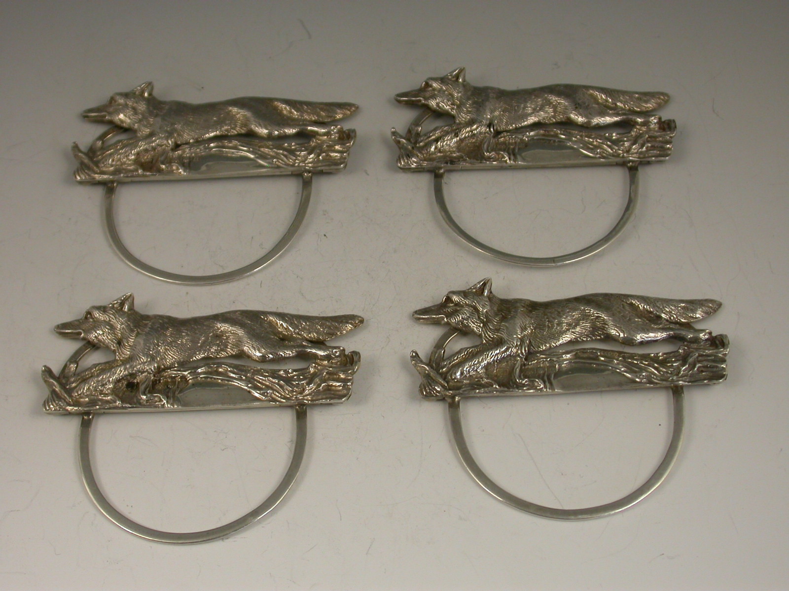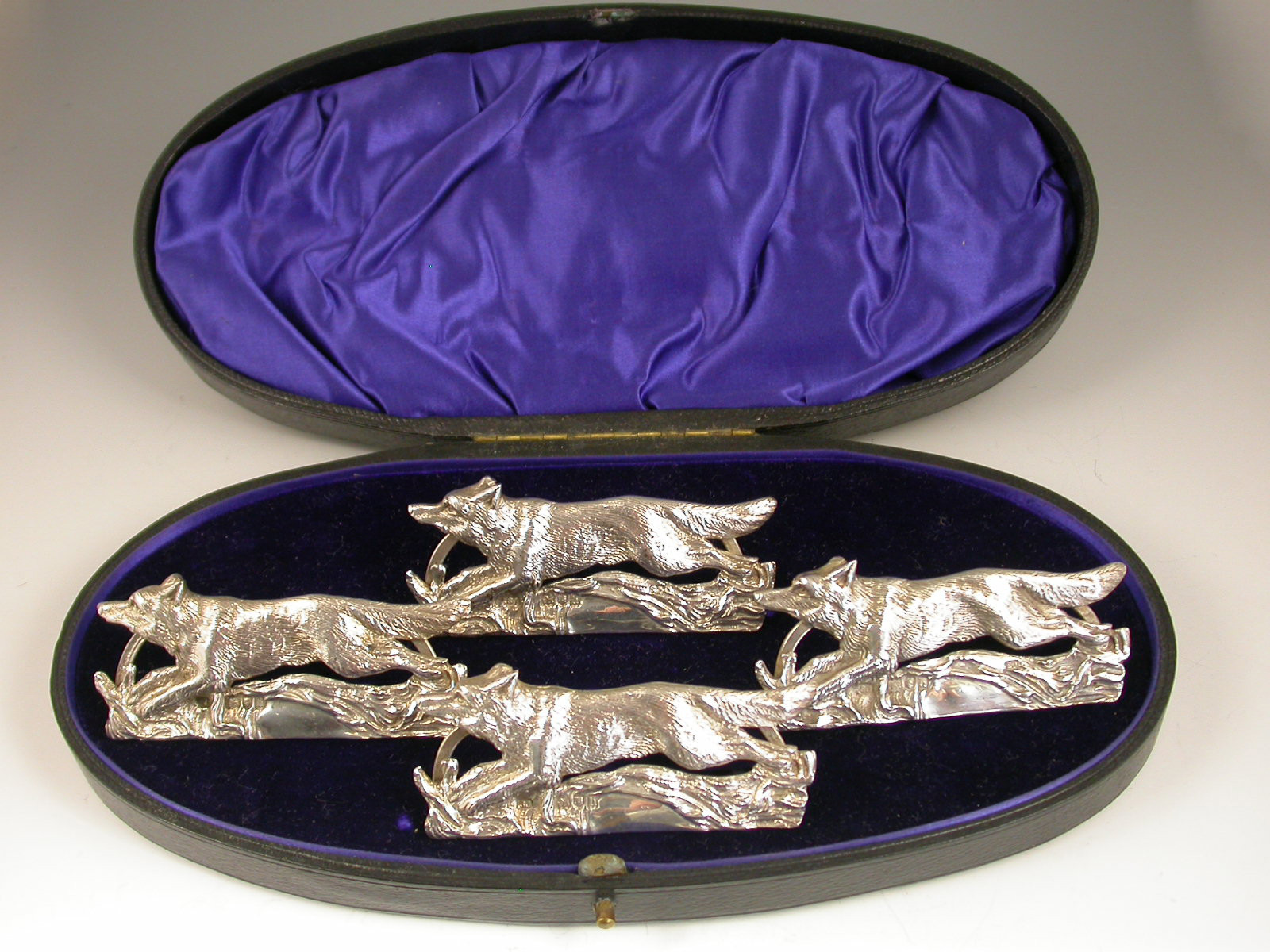 A fine quality cased set of four cast silver Menu Holders made in the form of running foxes, on 'D' shaped hinged bases. Complete with original silk and velvet lined leather case.