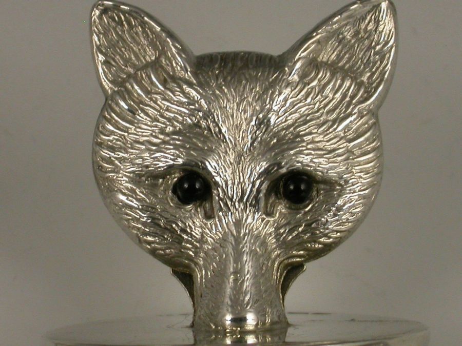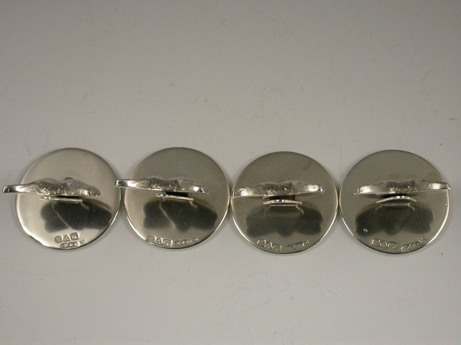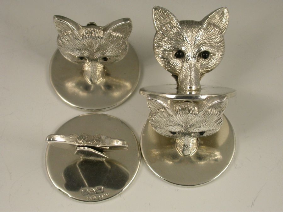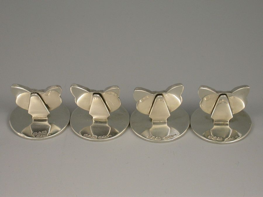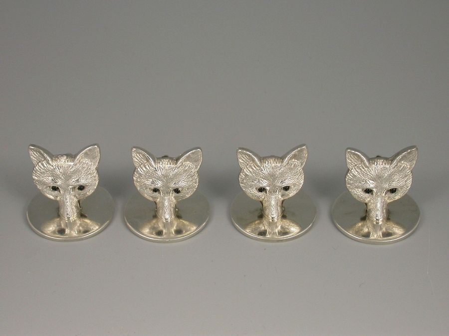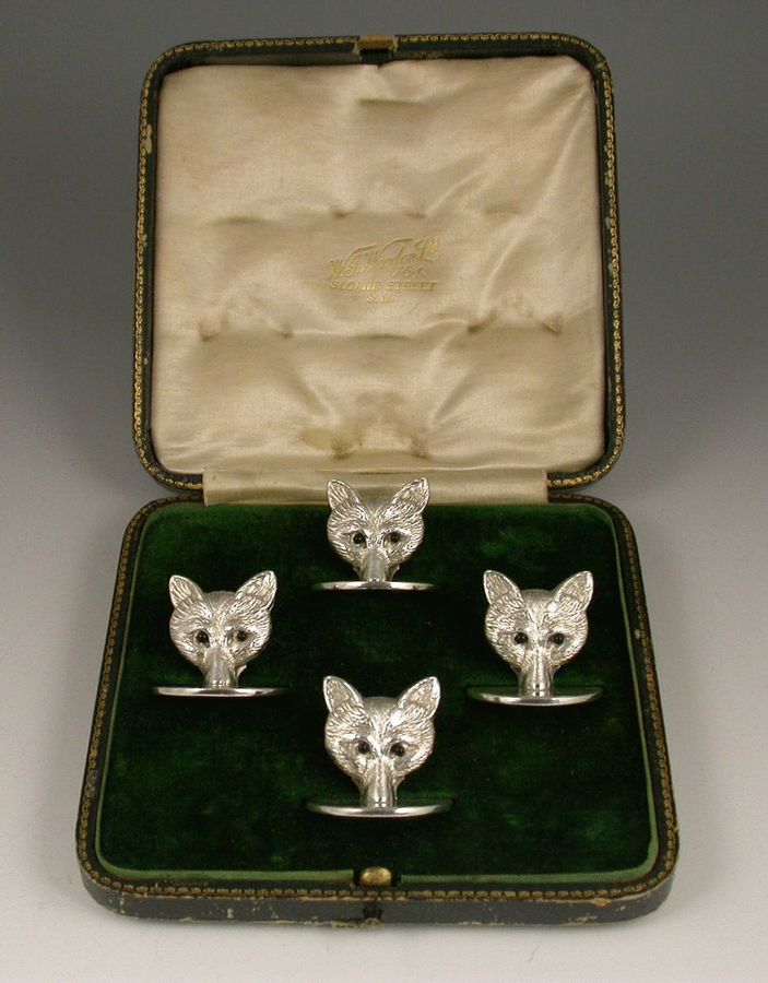 A very fine set of four cast silver Menu Holders formed as Foxes Heads, set with circular black glass eyes, on plain circular bases. Complete with original silk and velvet lined green leather case.