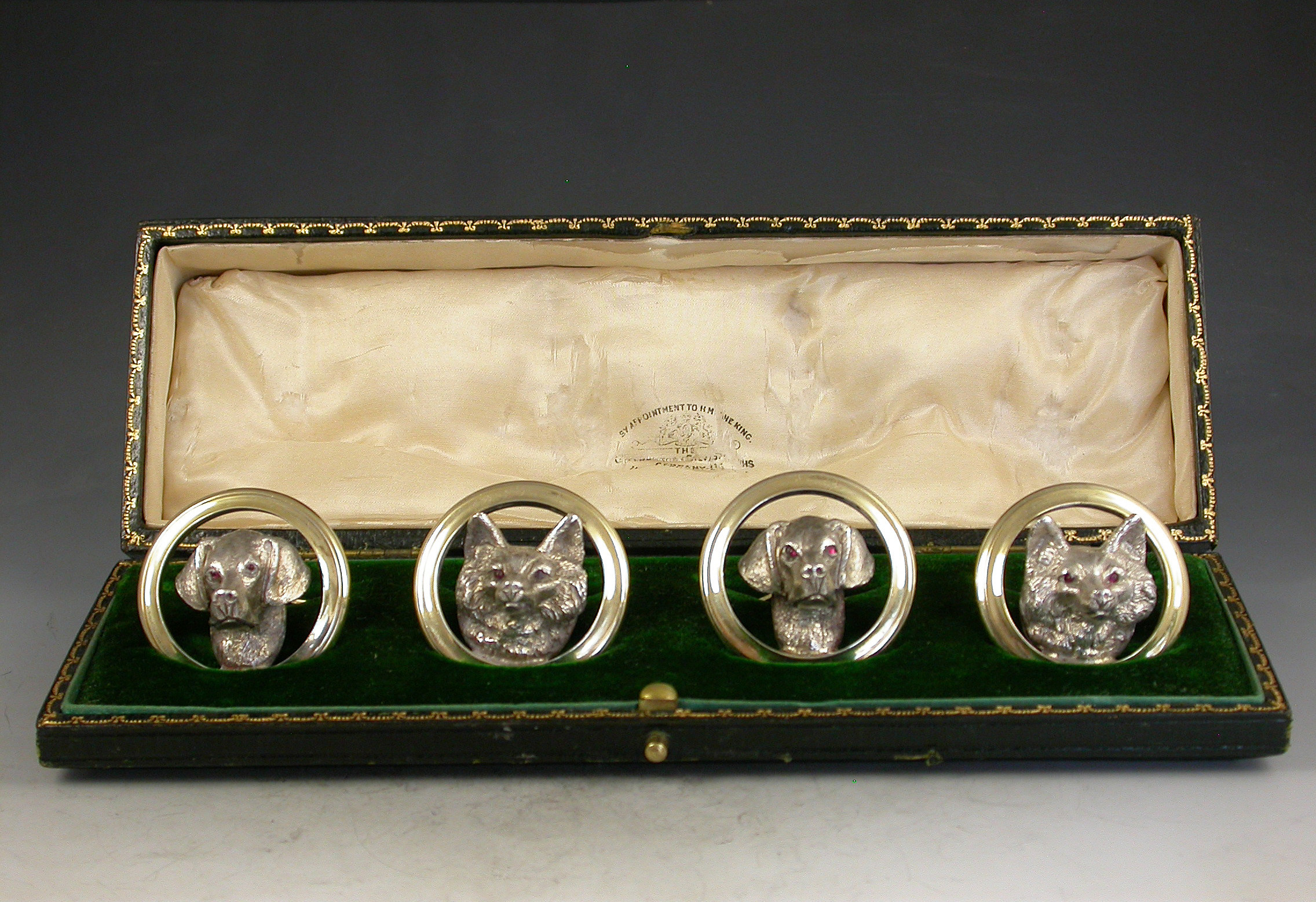 A superb quality cased set of four George V novelty silver and gilt Menu Holders, two cast as fox heads and two cast as hounds heads, within circular gilded frames with hinged stands. Complete with ruby glass eyes and original fitted green leather case.