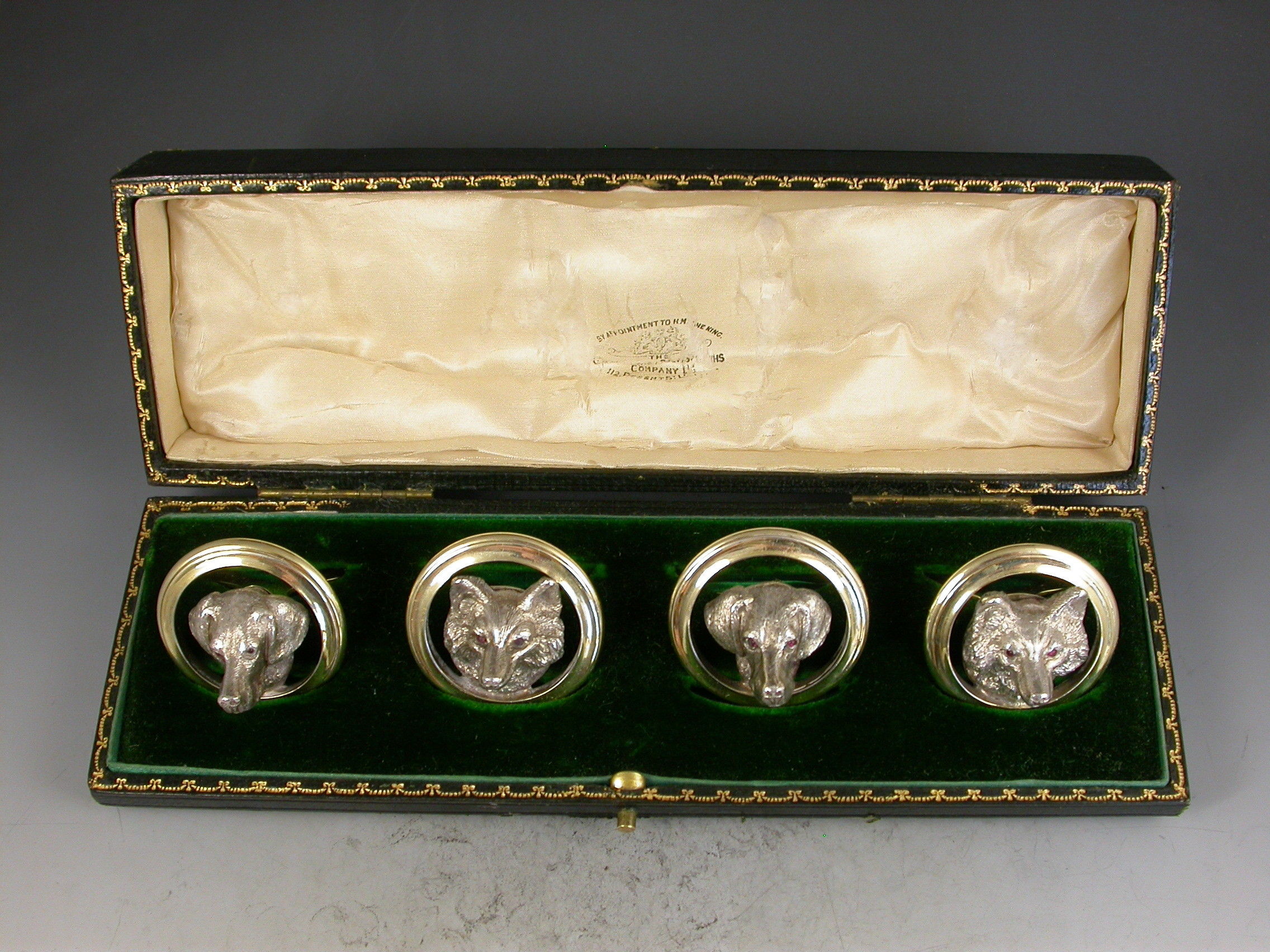 A superb quality cased set of four George V novelty silver and gilt Menu Holders, two cast as fox heads and two cast as hounds heads, within circular gilded frames with hinged stands. Complete with ruby glass eyes and original fitted green leather case.