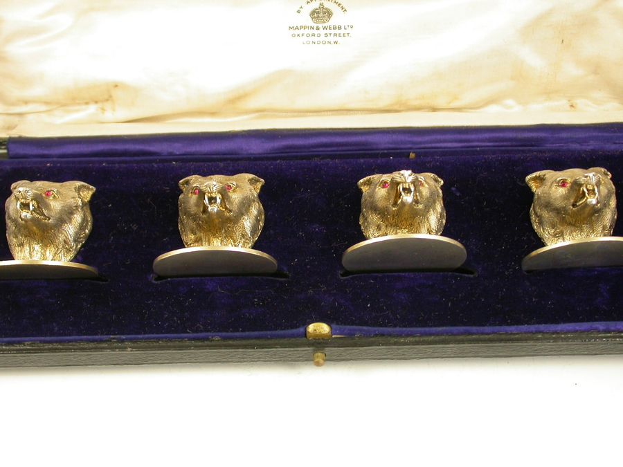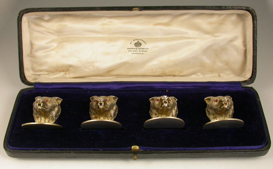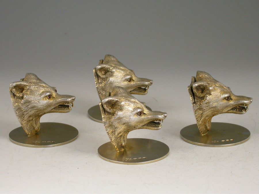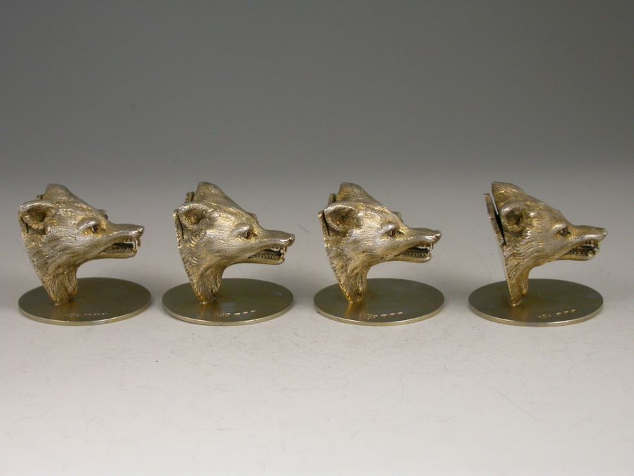 Cased Set 4 George V Cast Silver Gilt Fox Head Menu Holders