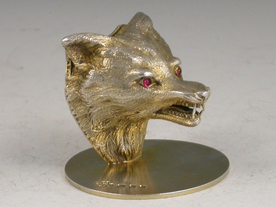 A very fine quality cased set of four George V cast silver gilt Menu Holders, made in the form of Foxes Heads with ruby glass eyes, on circular bases. Complete with associated silk and velvet lined leather case.