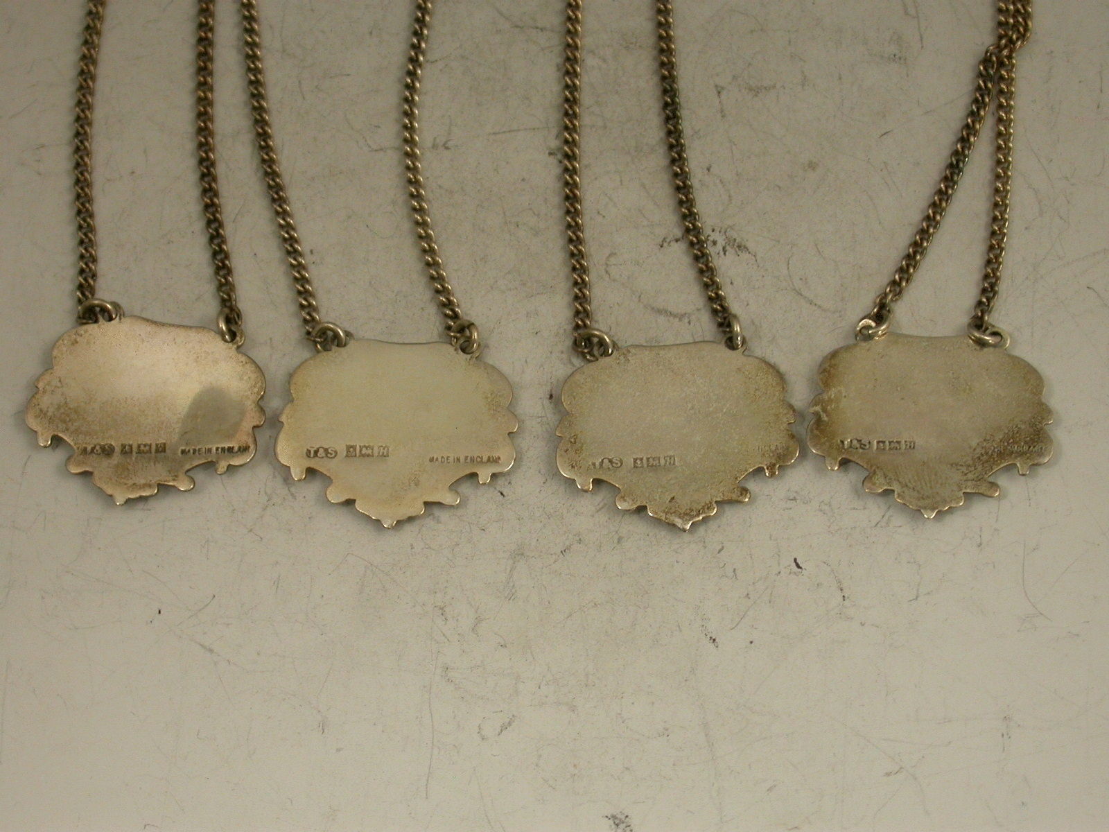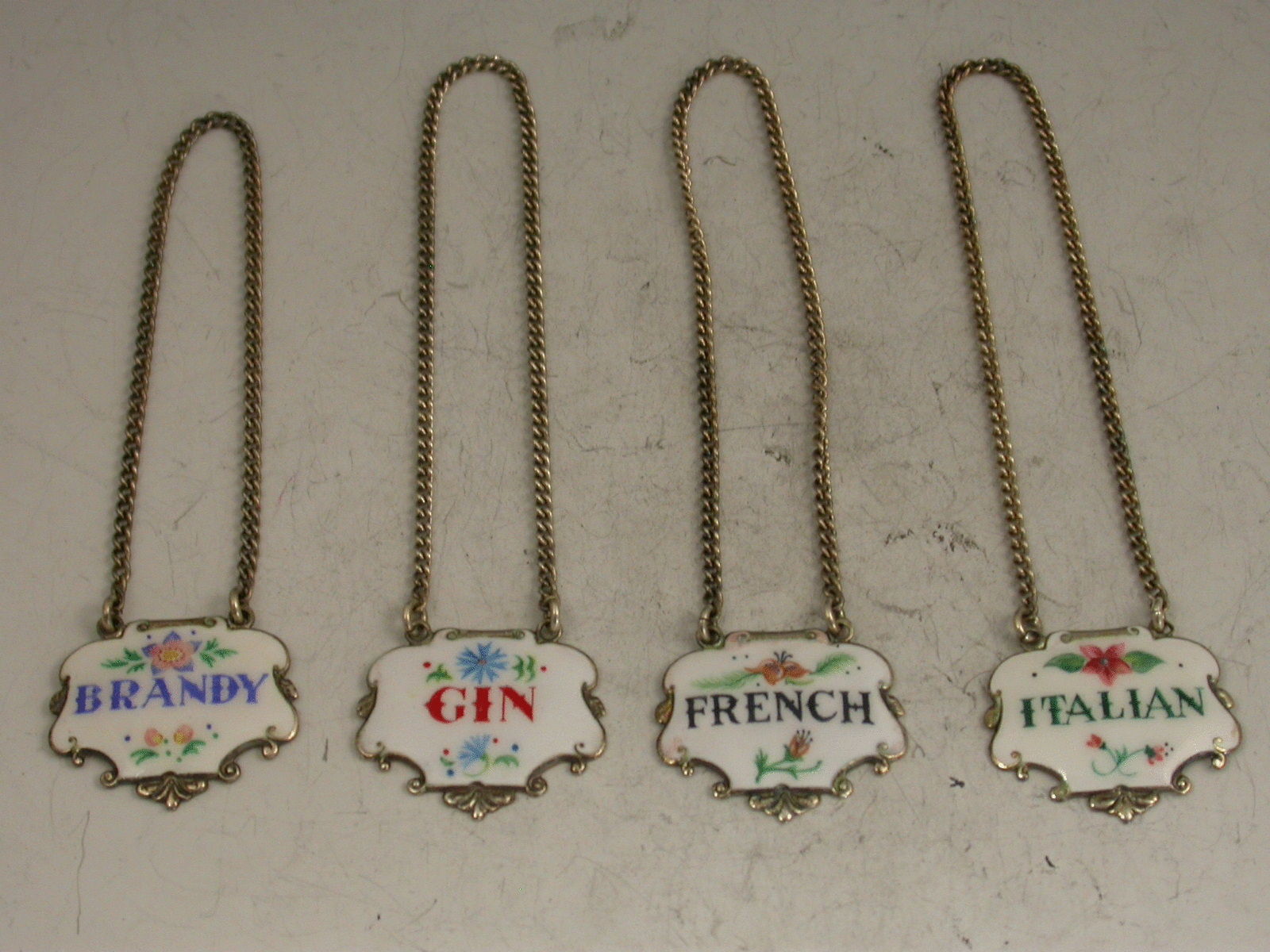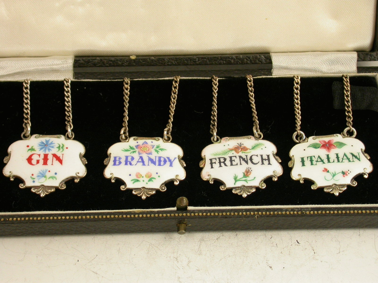 a good quality cased set of four mid 20th century cast silver and hand painted enamel Wine Labels, of cartouche shape with scrolled borders, titled for Brandy, Gin, French and Italian. Complete with associated leather case.