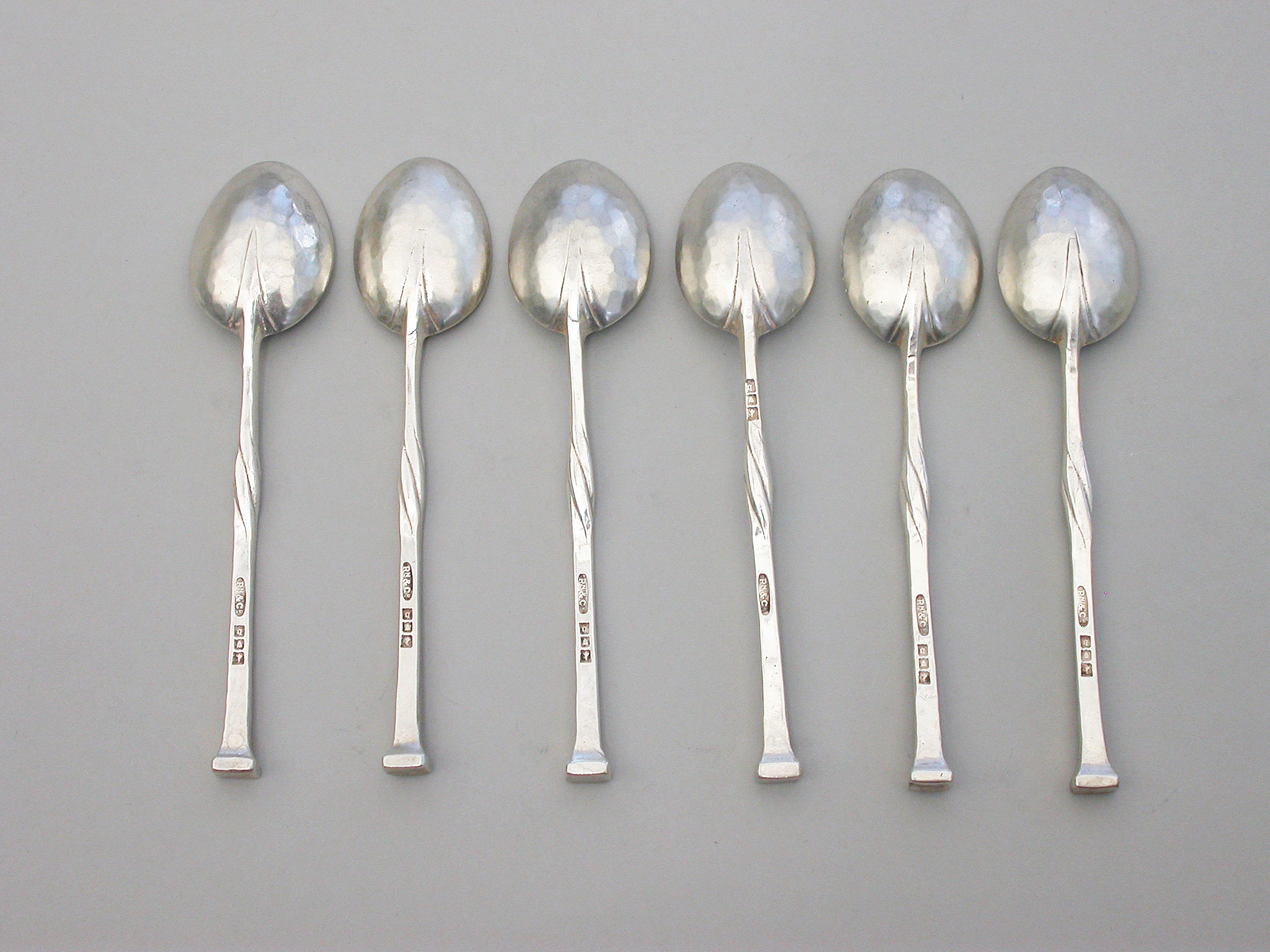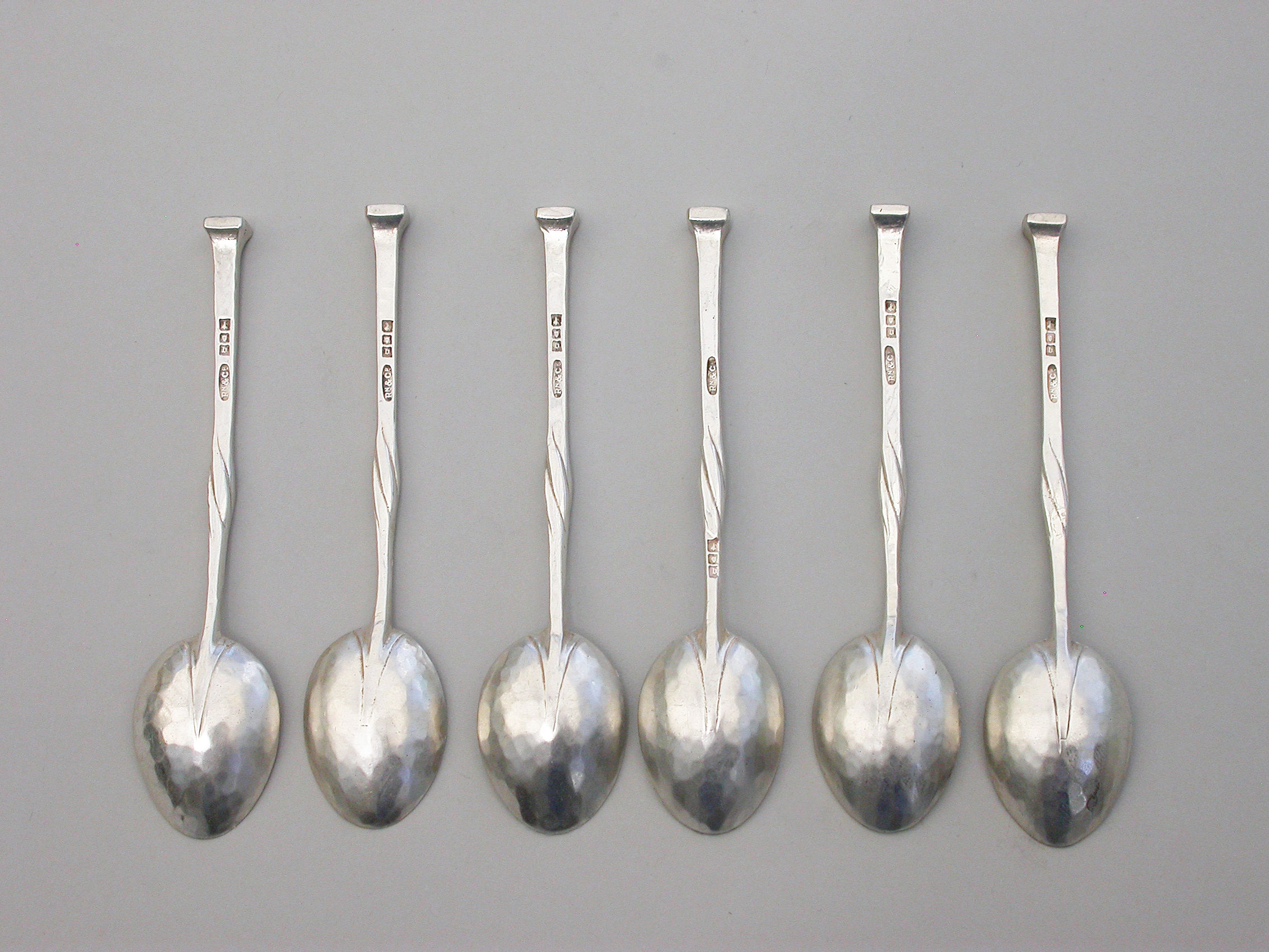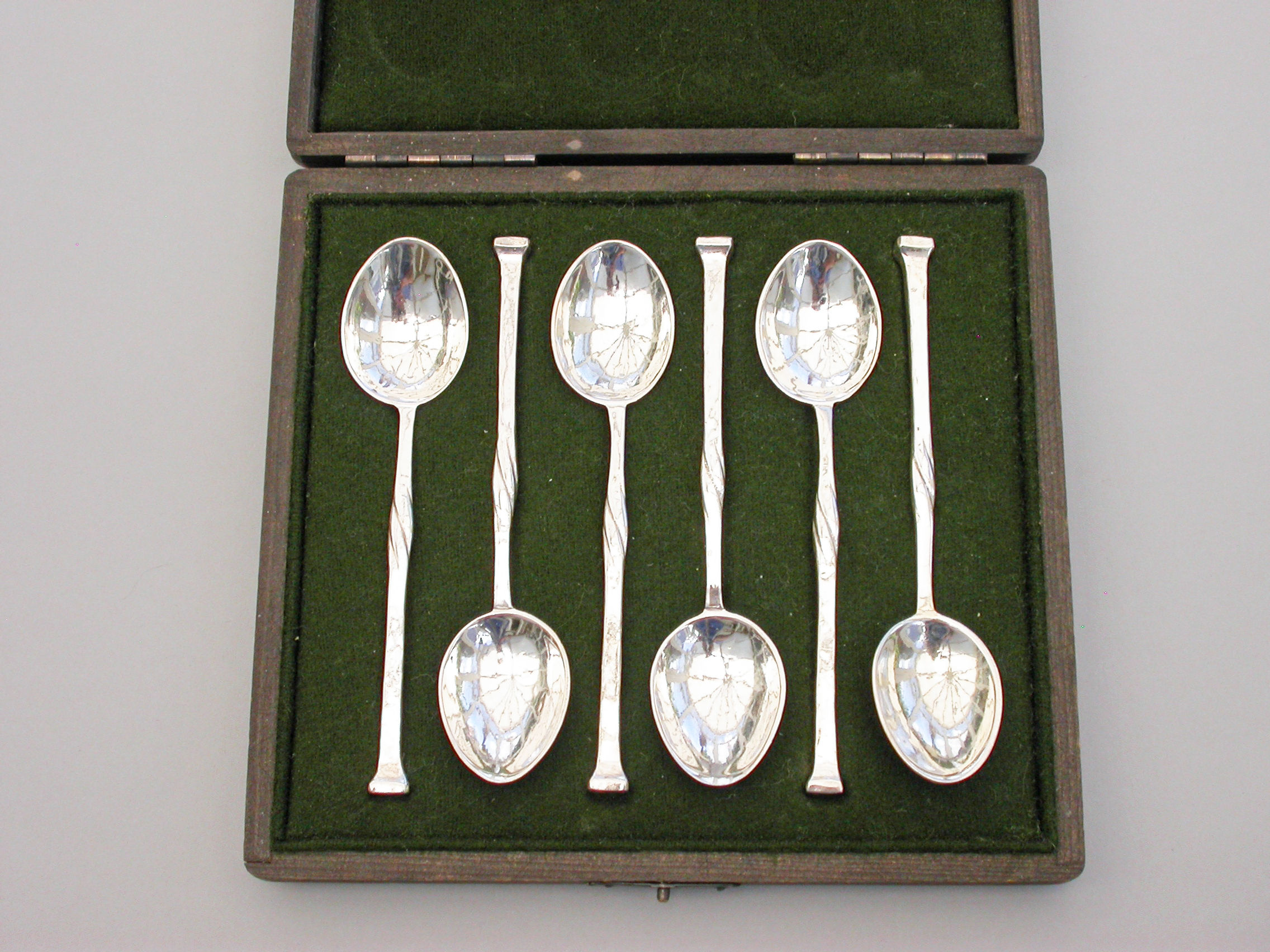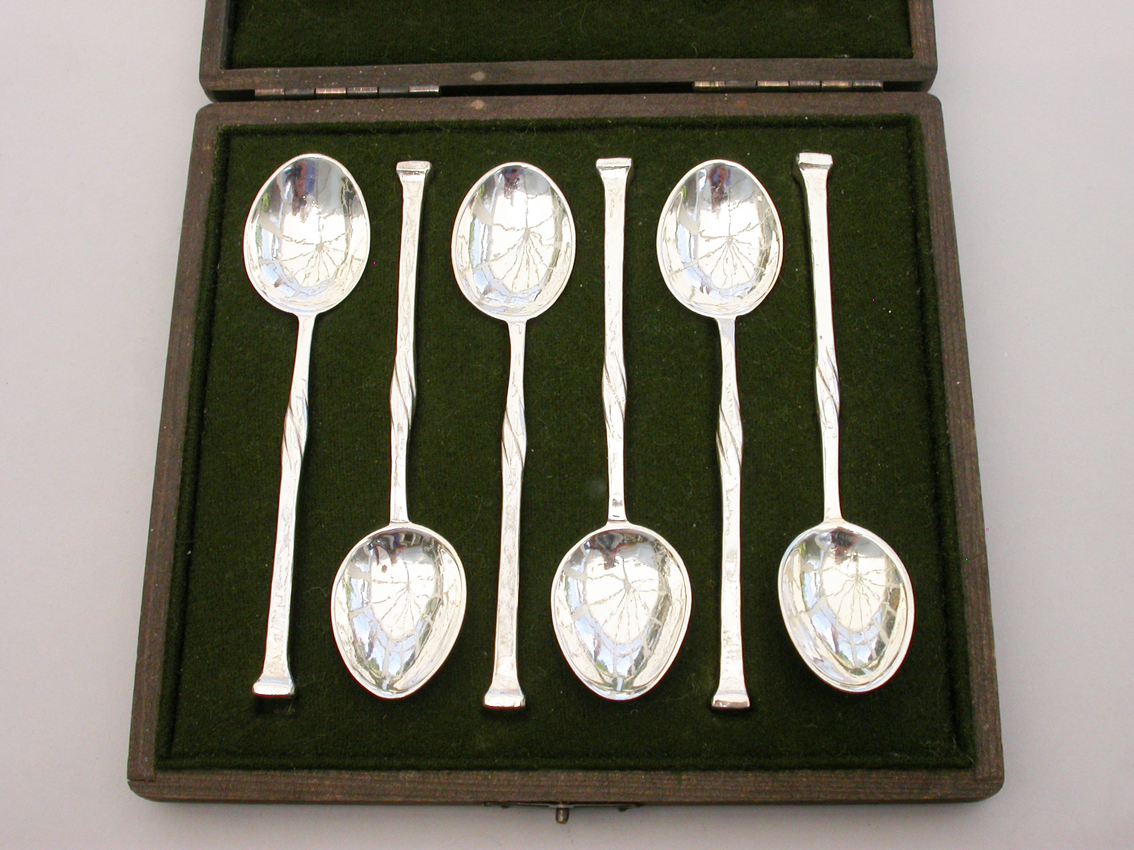 A good set of six early 20th century hammered silver Coffee Spoons made in the Arts & Crafts style with twisted tapering stems and nail head finials. Complete with fitted wooden case.