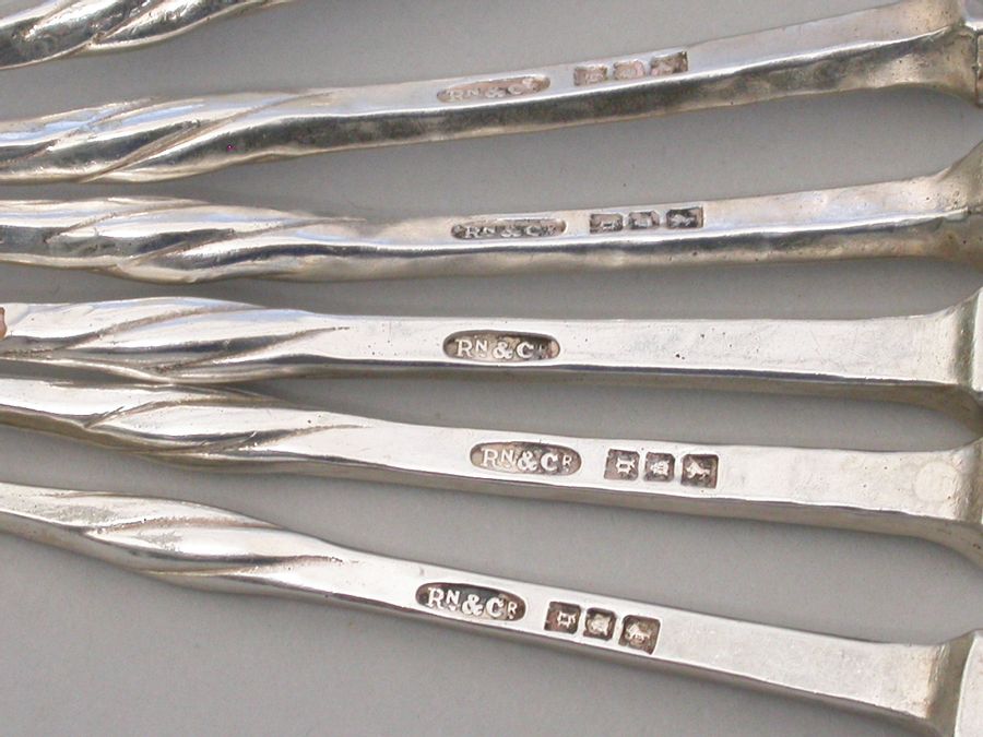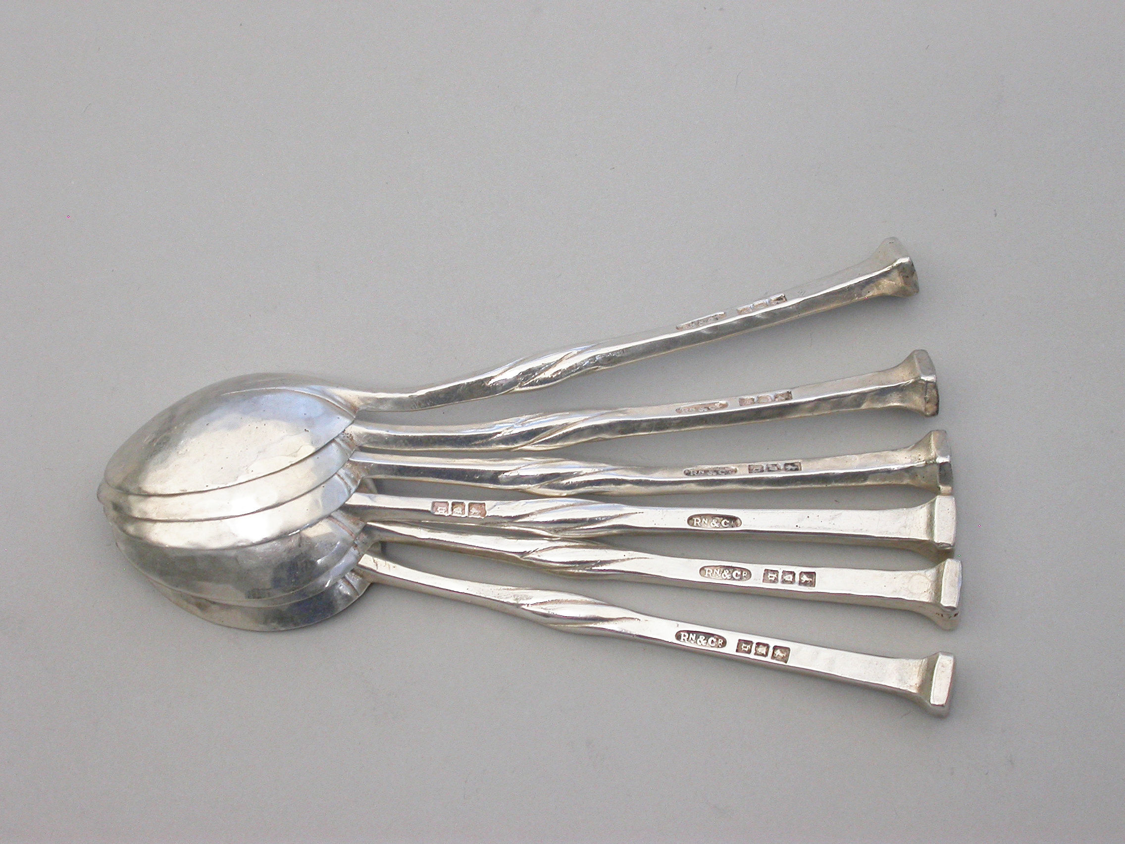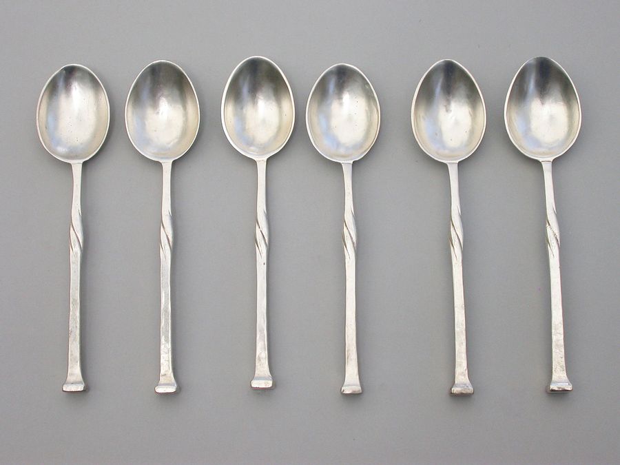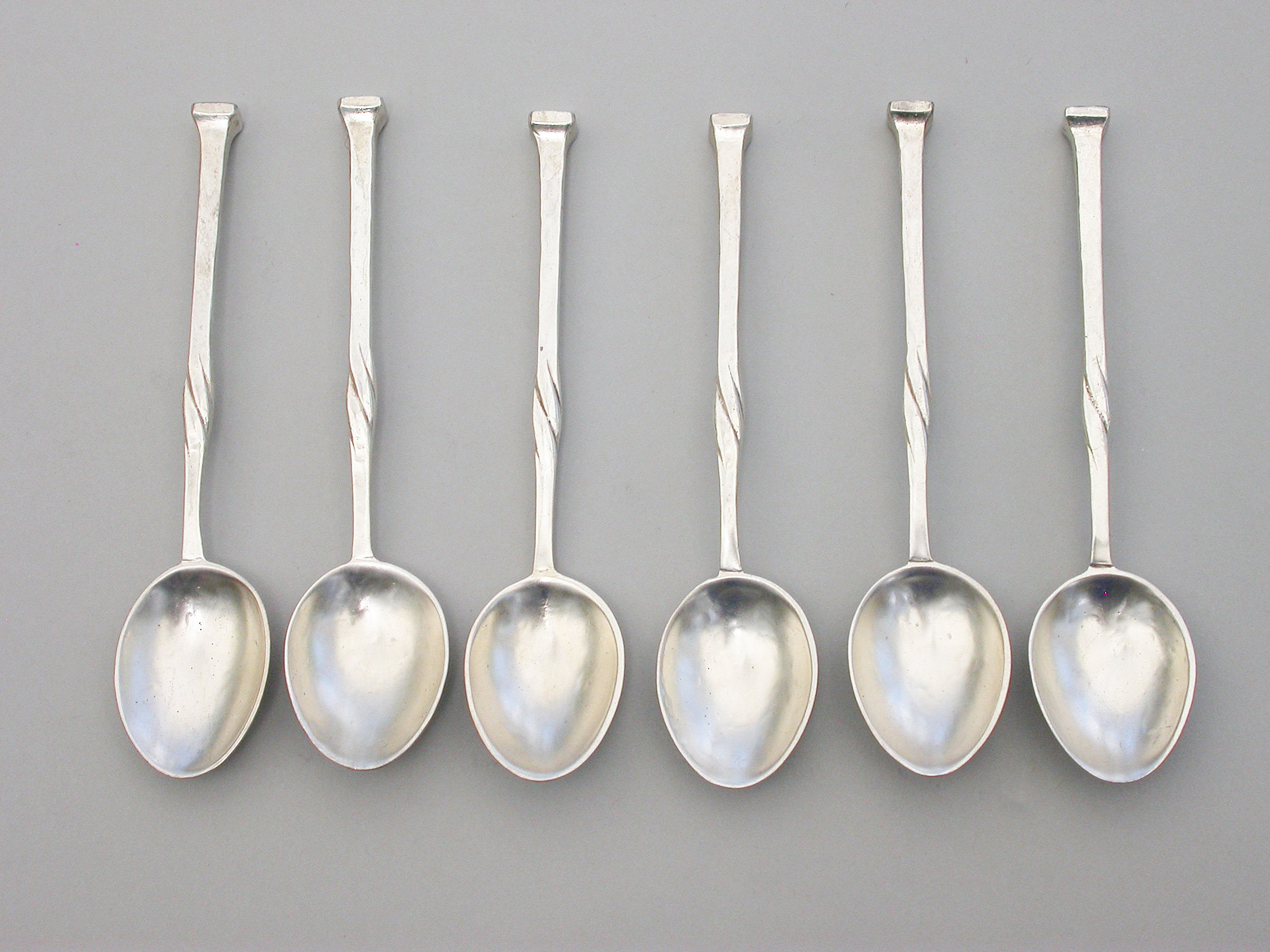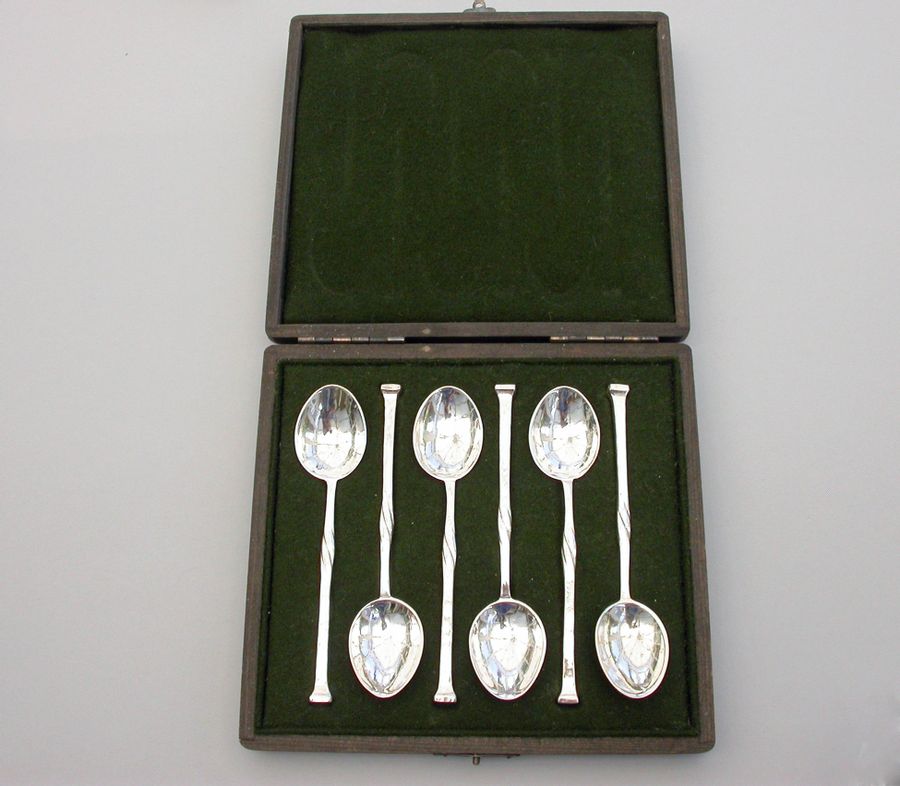 A good set of six early 20th century hammered silver Coffee Spoons made in the Arts & Crafts style with twisted tapering stems and nail head finials. Complete with fitted wooden case.