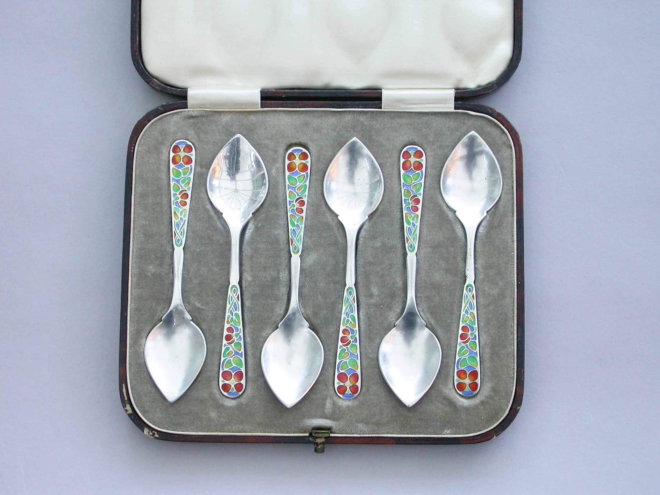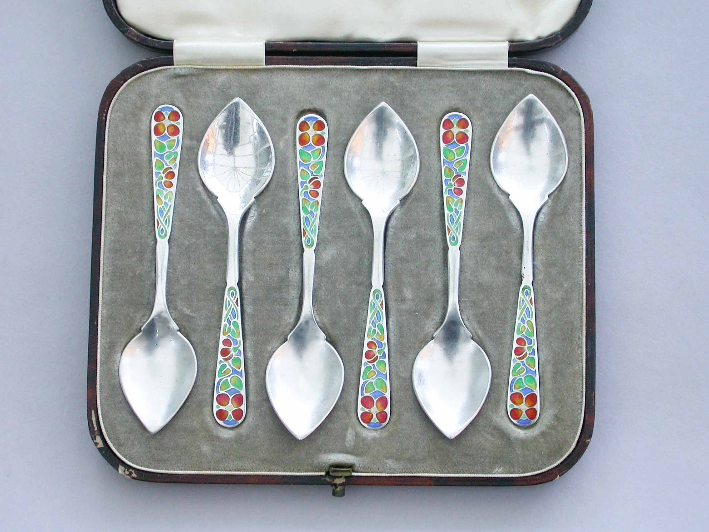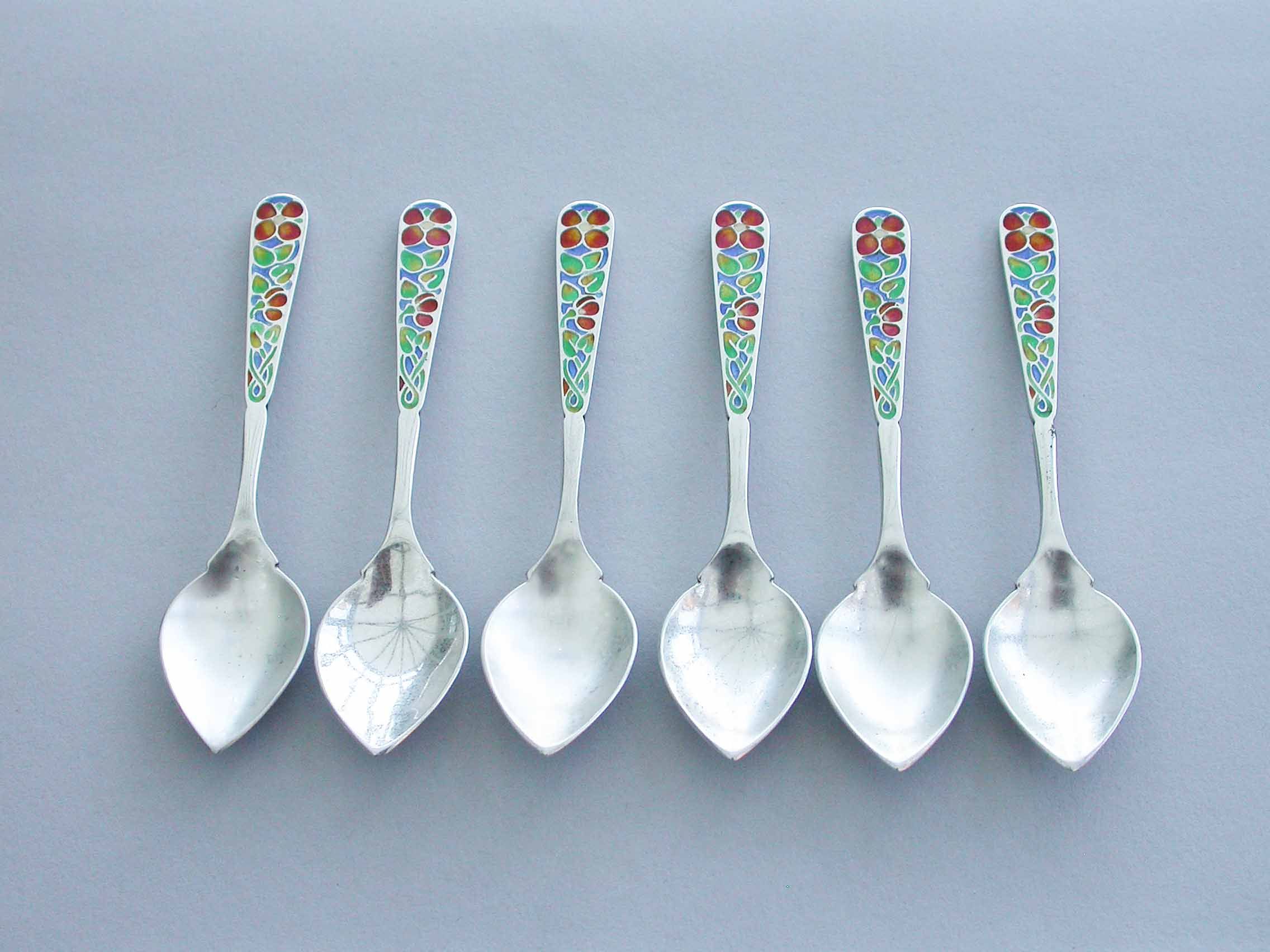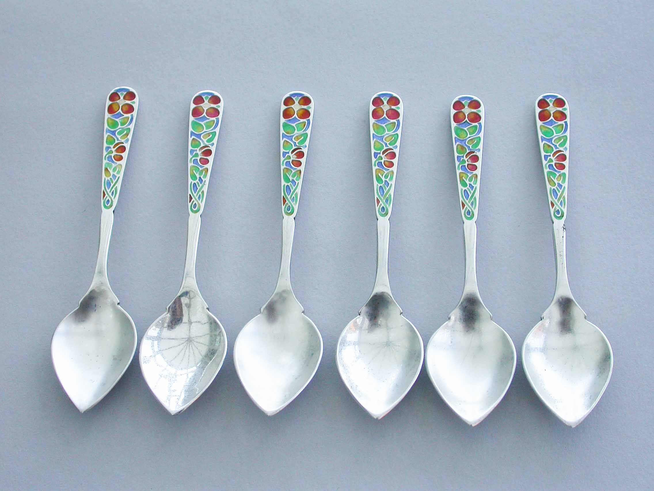 A good set of six early 20th century Arts & Crafts silver Demitasse Spoons with pointed hammered bowls and the handles enamelled with multi-coloured flowers. Complete with original fitted case.