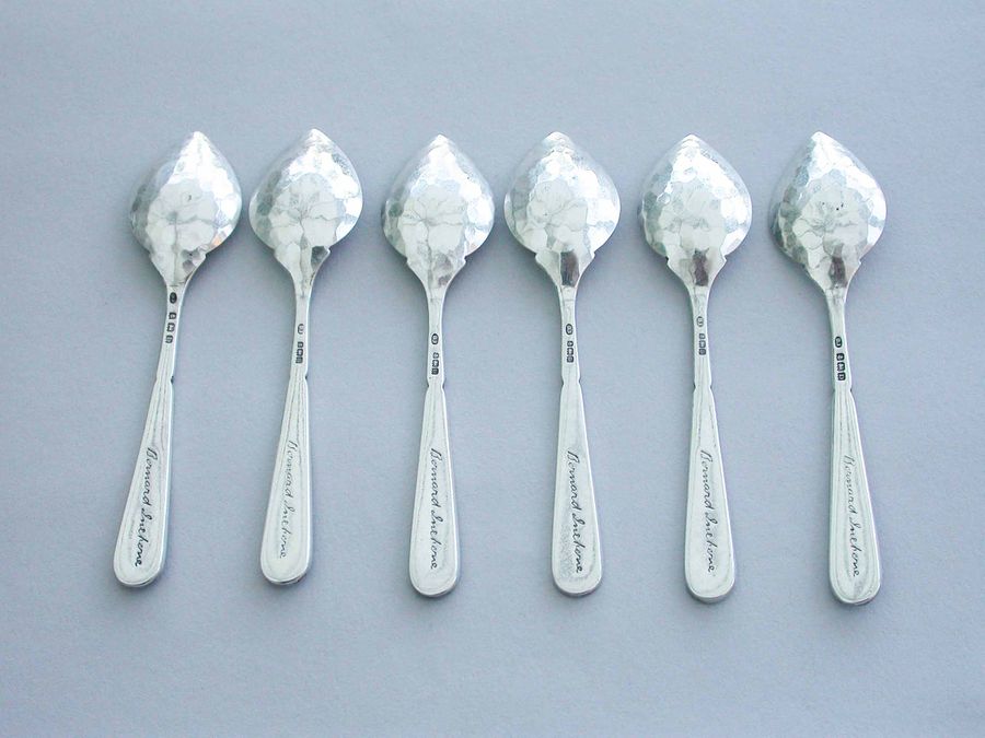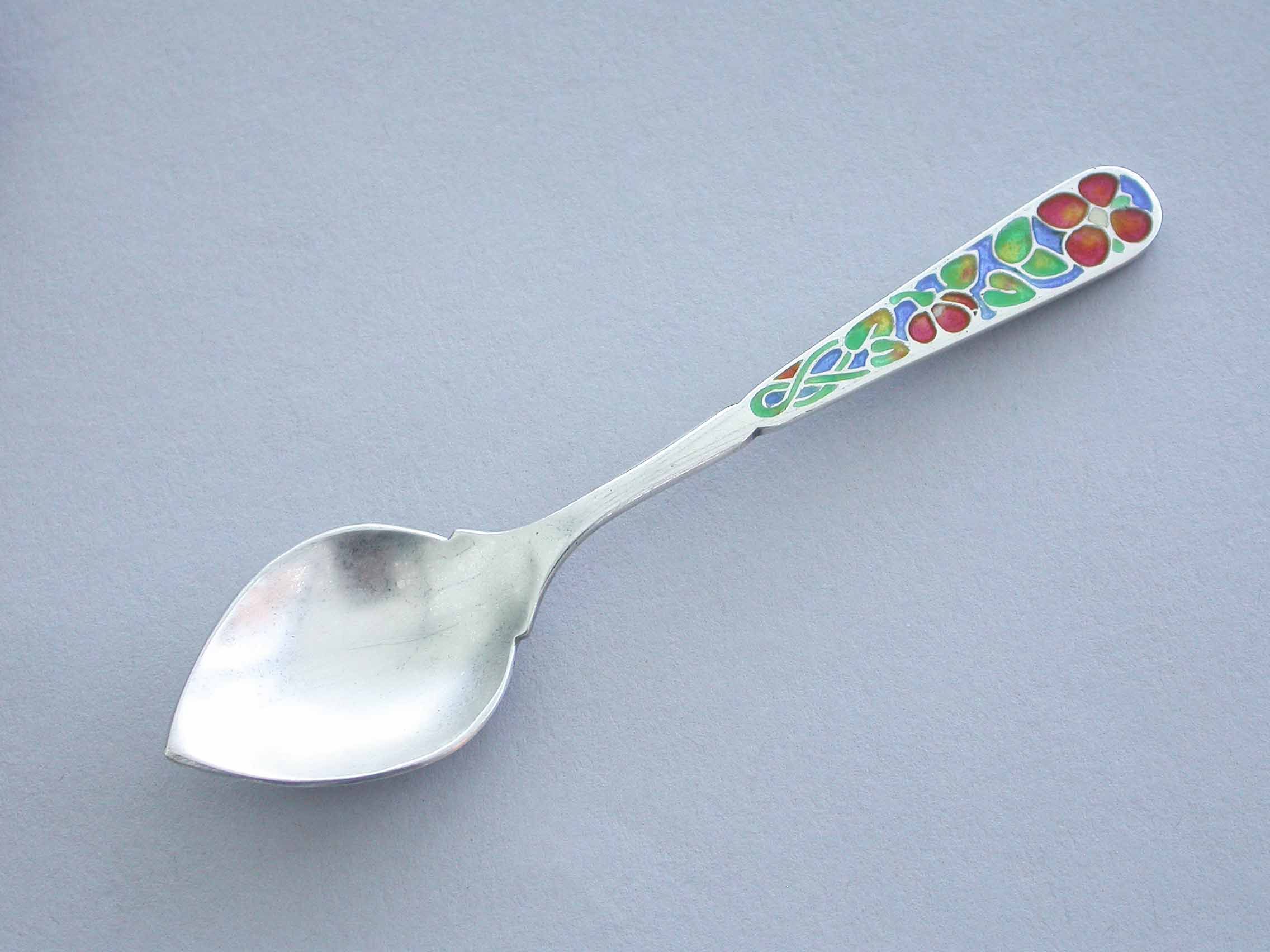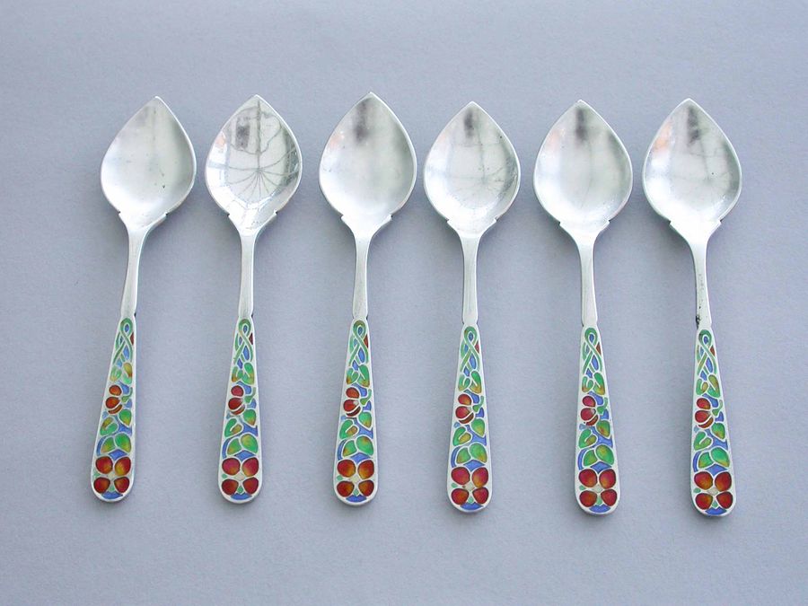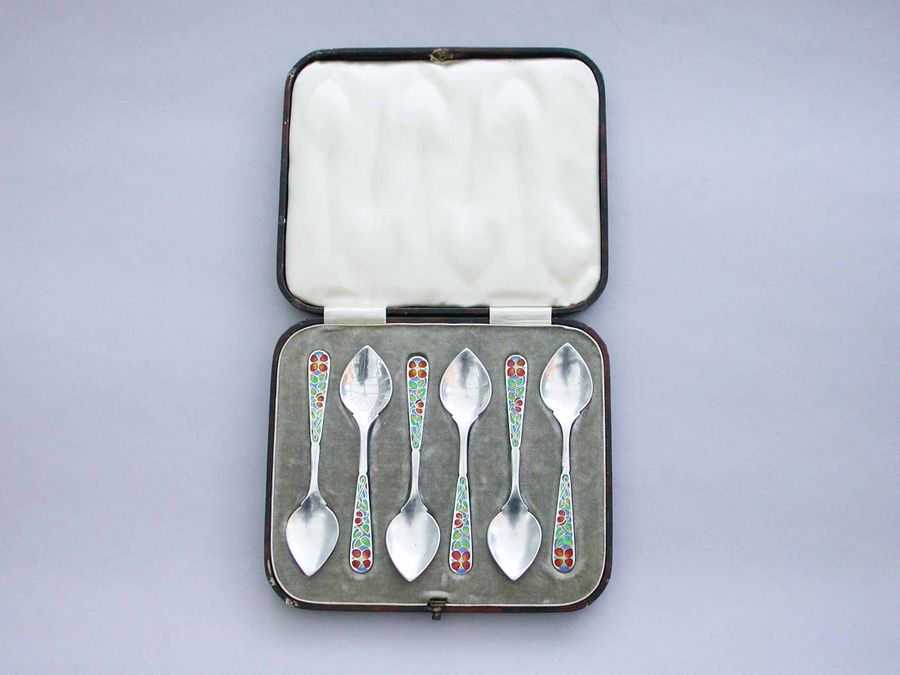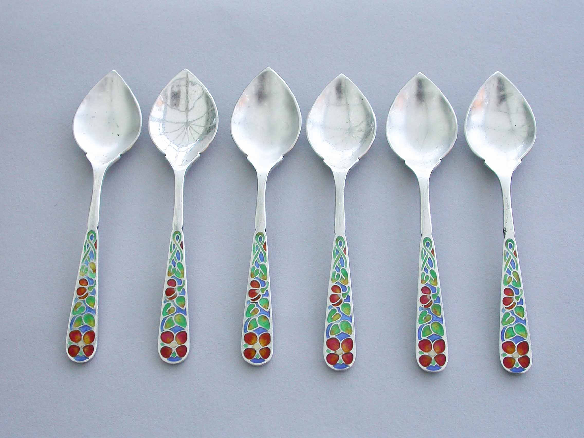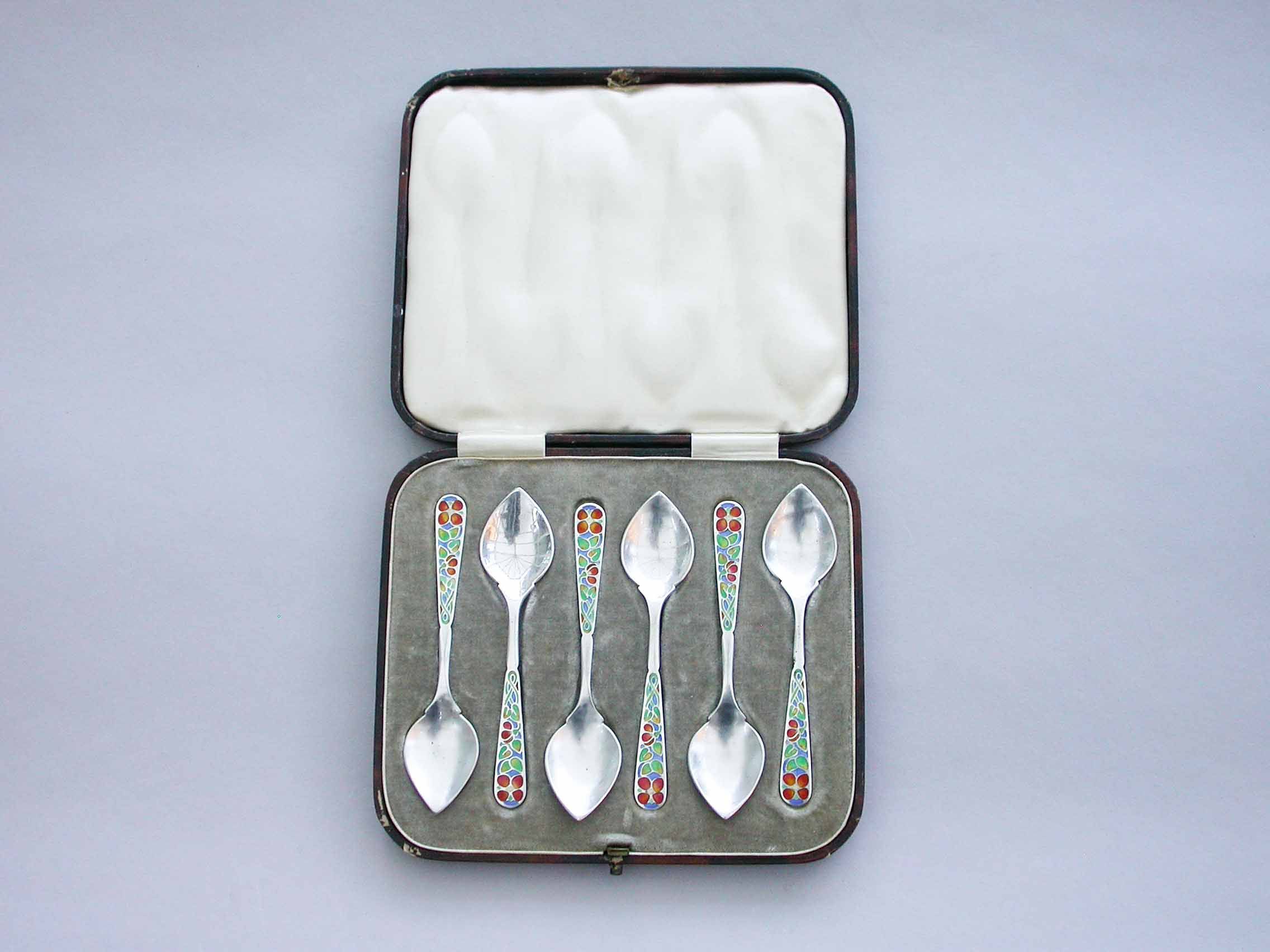 A good set of six early 20th century Arts & Crafts silver Demitasse Spoons with pointed hammered bowls and the handles enamelled with multi-coloured flowers. Complete with original fitted case.