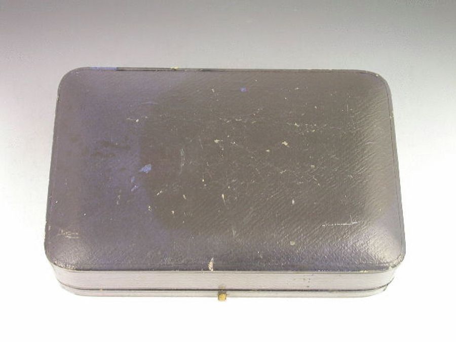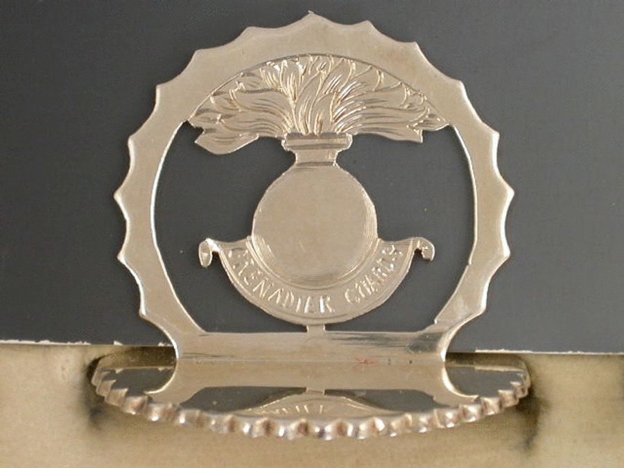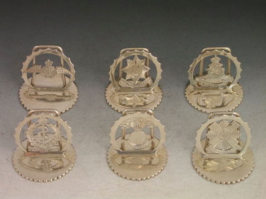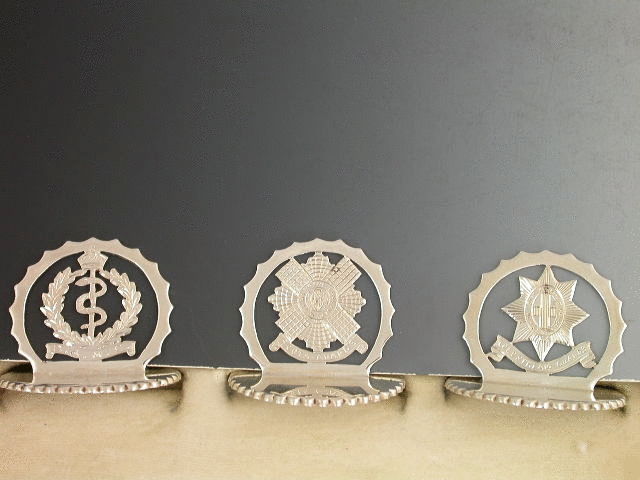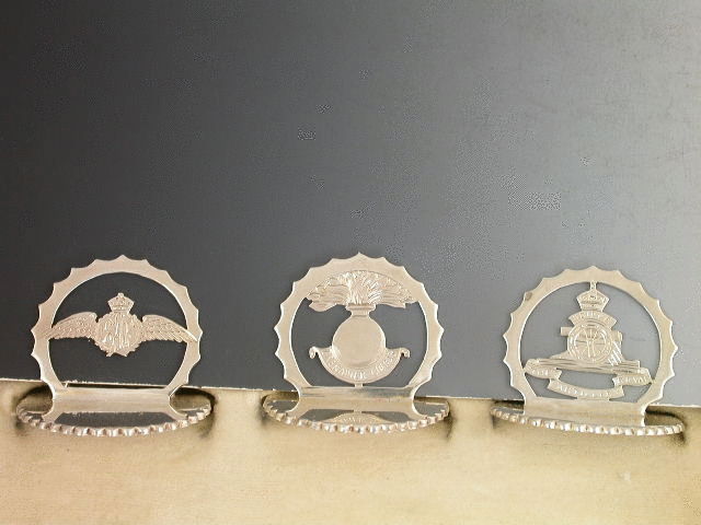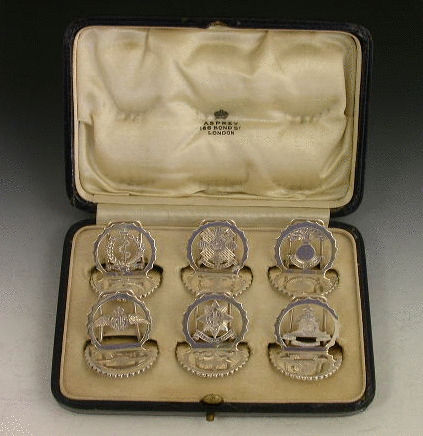 A superb Cased set of 6 pre War Military silver Menu Holders depicting the Badges of The Royal Air Force, The Grenadier Guards, The Scots Guards, The Coldstream Guards, The Royal Army Medical Corps and The Royal Artillery, on circular bases with serrated borders. Complete with original cream silk and velvet lined navy blue leather case retailed by ASPREY of London.