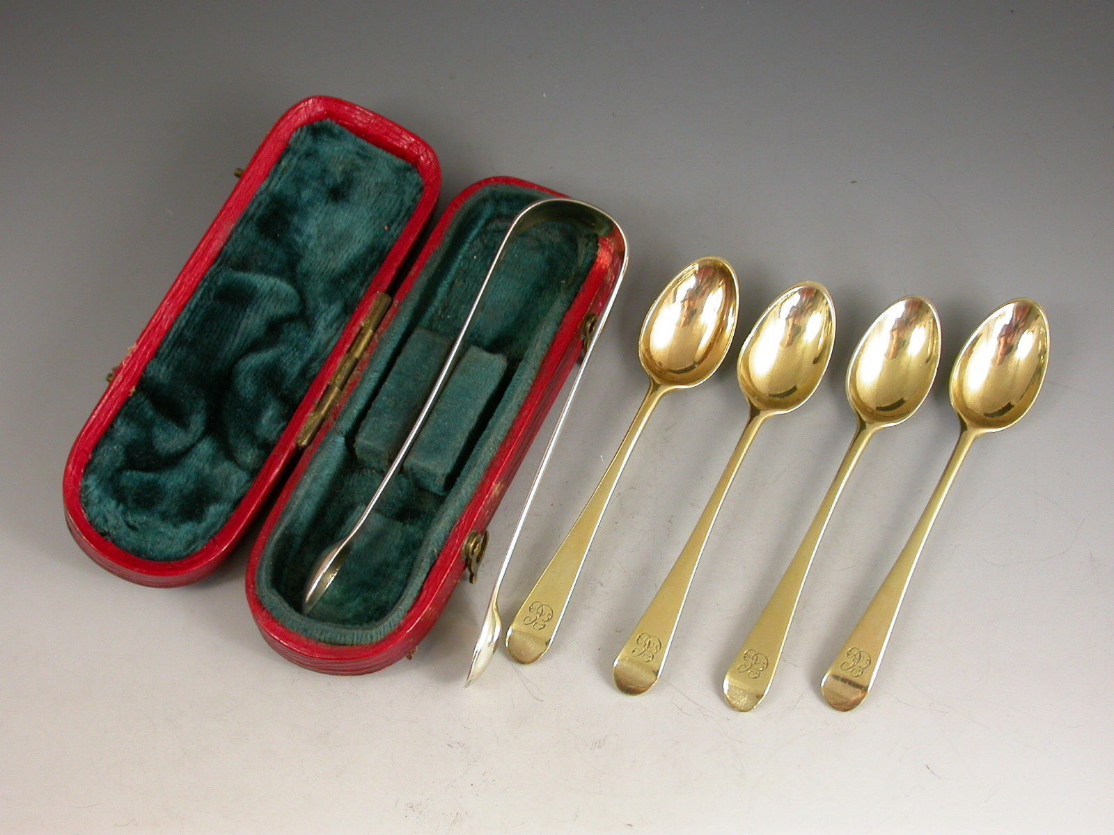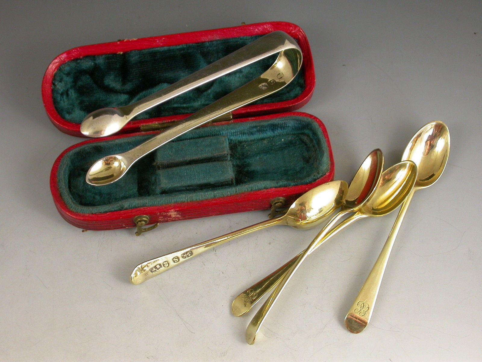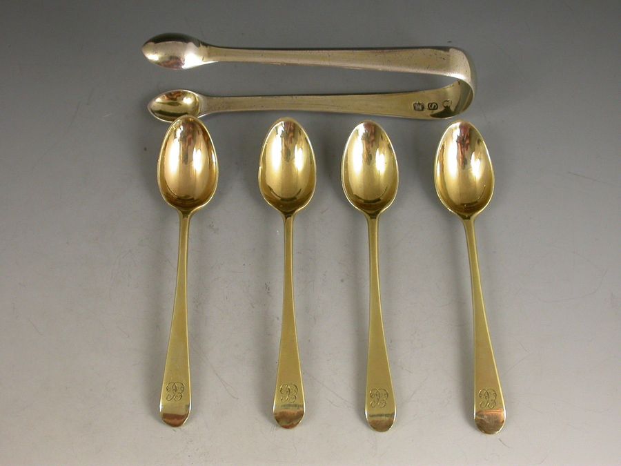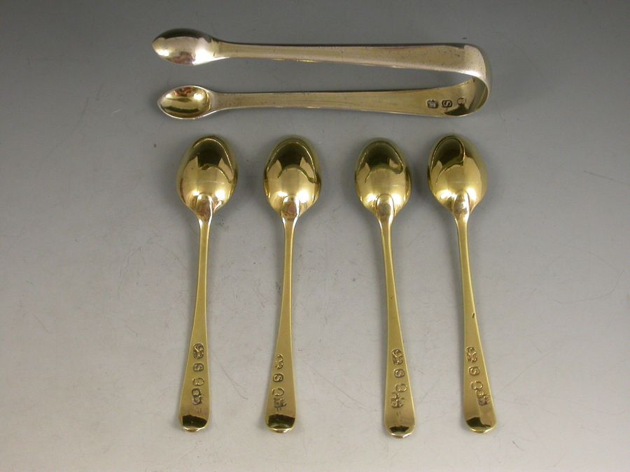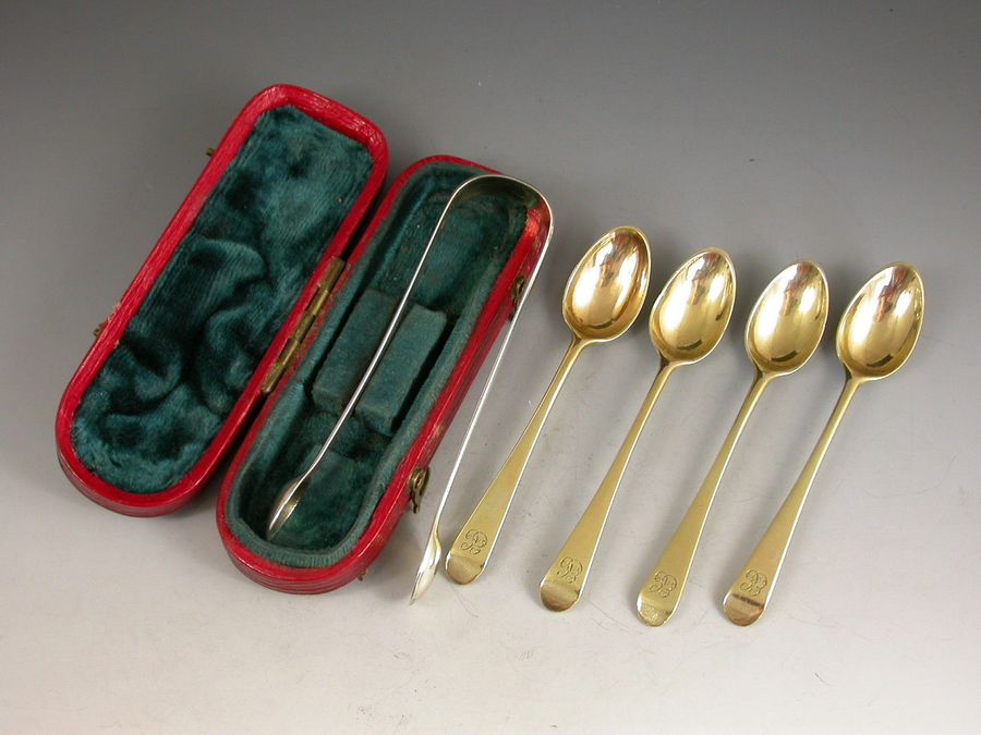 Cased Set George III Miniature Silver Gilt Spoons & Sugar Tongs