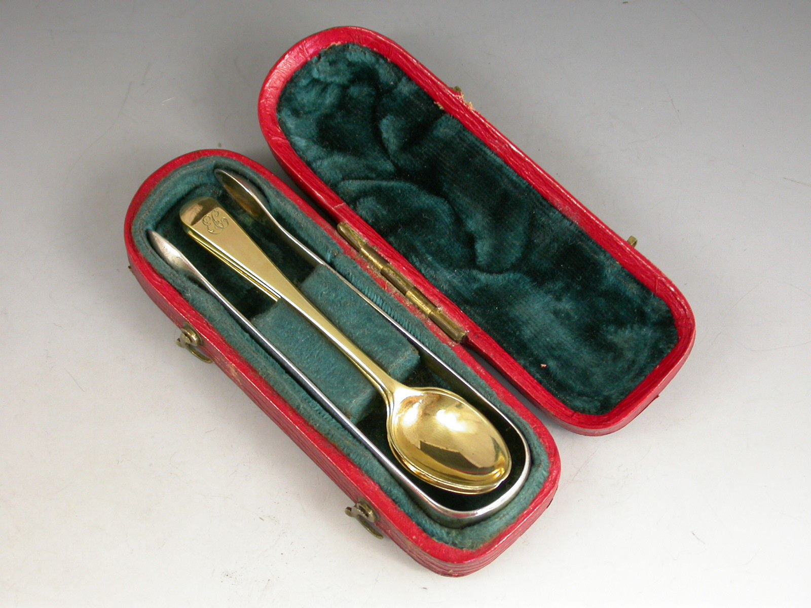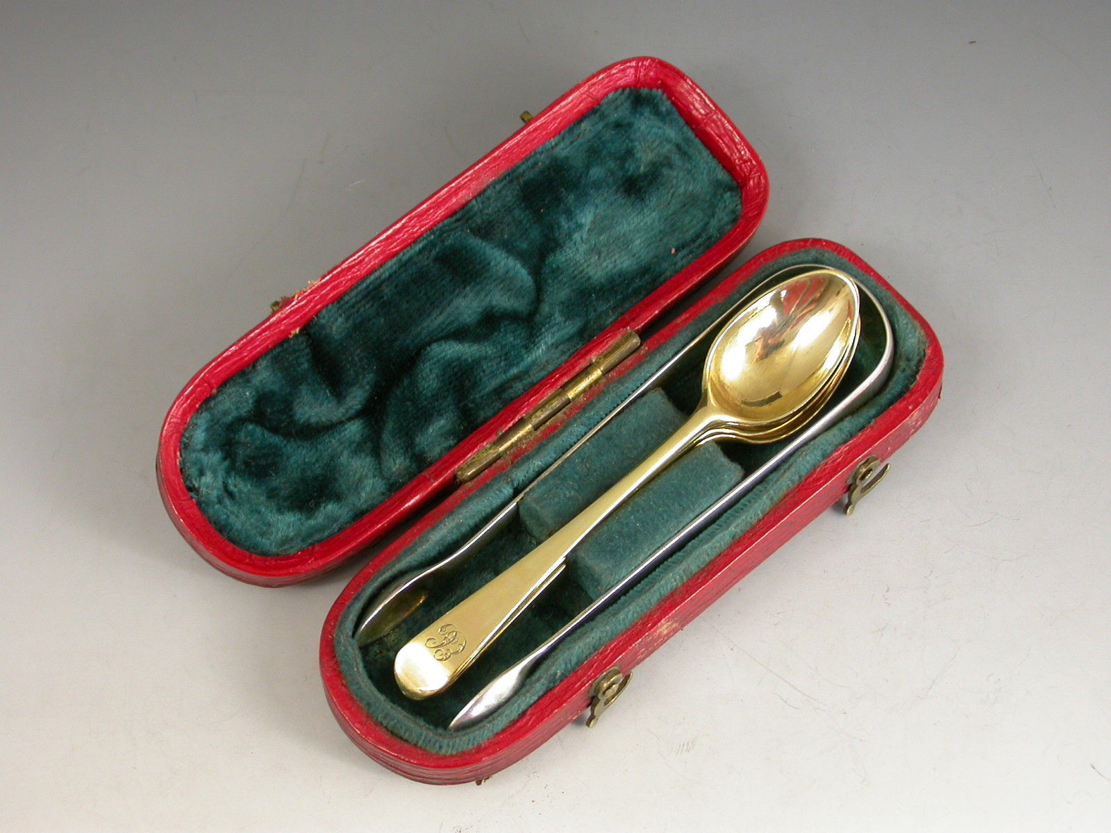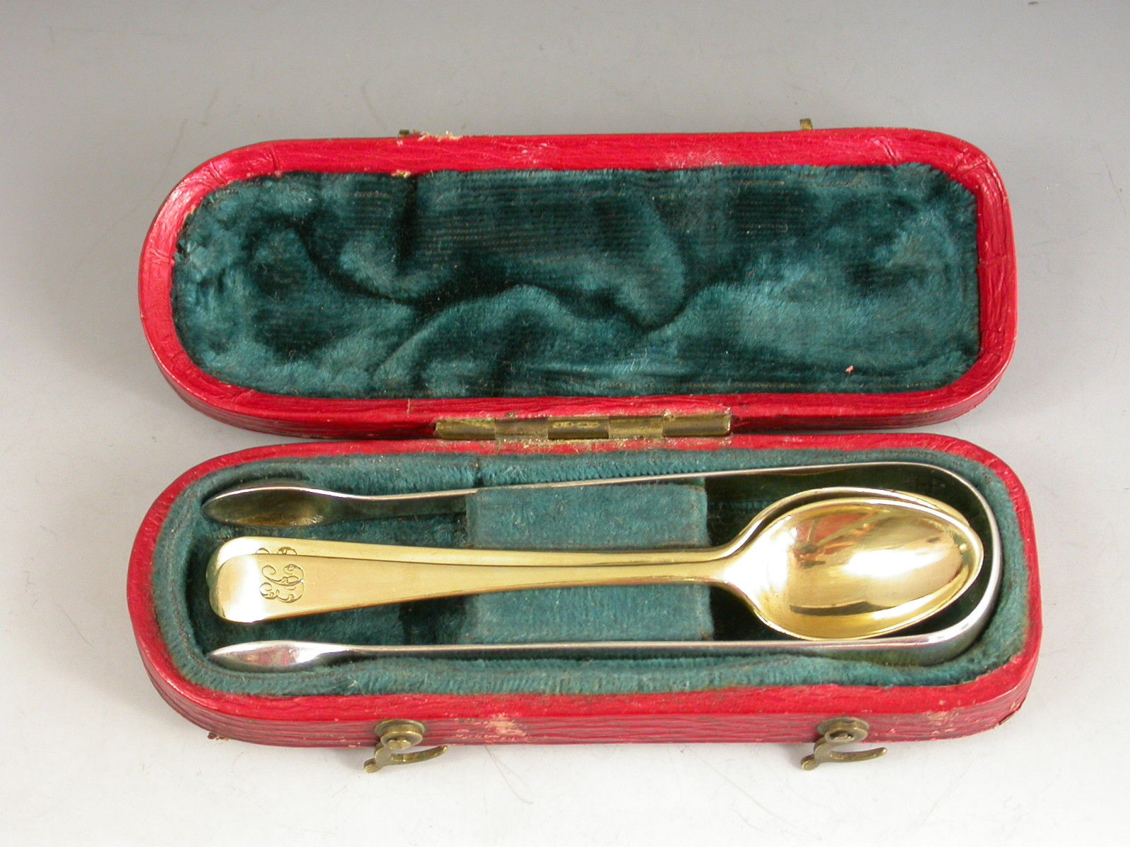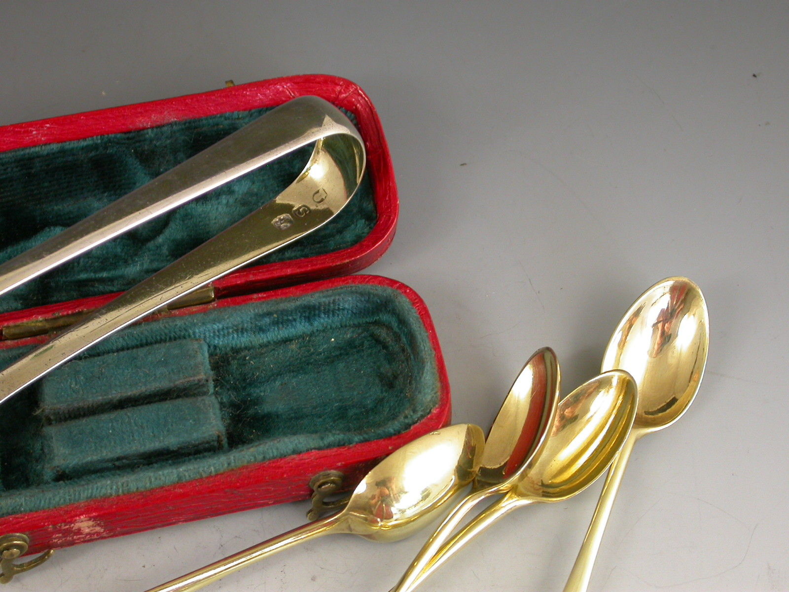 Cased Set George III Miniature Silver Gilt Spoons & Sugar Tongs