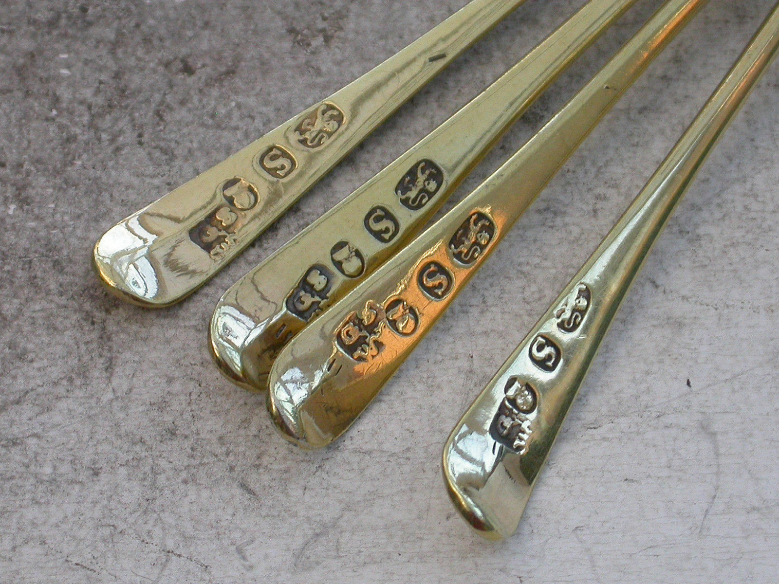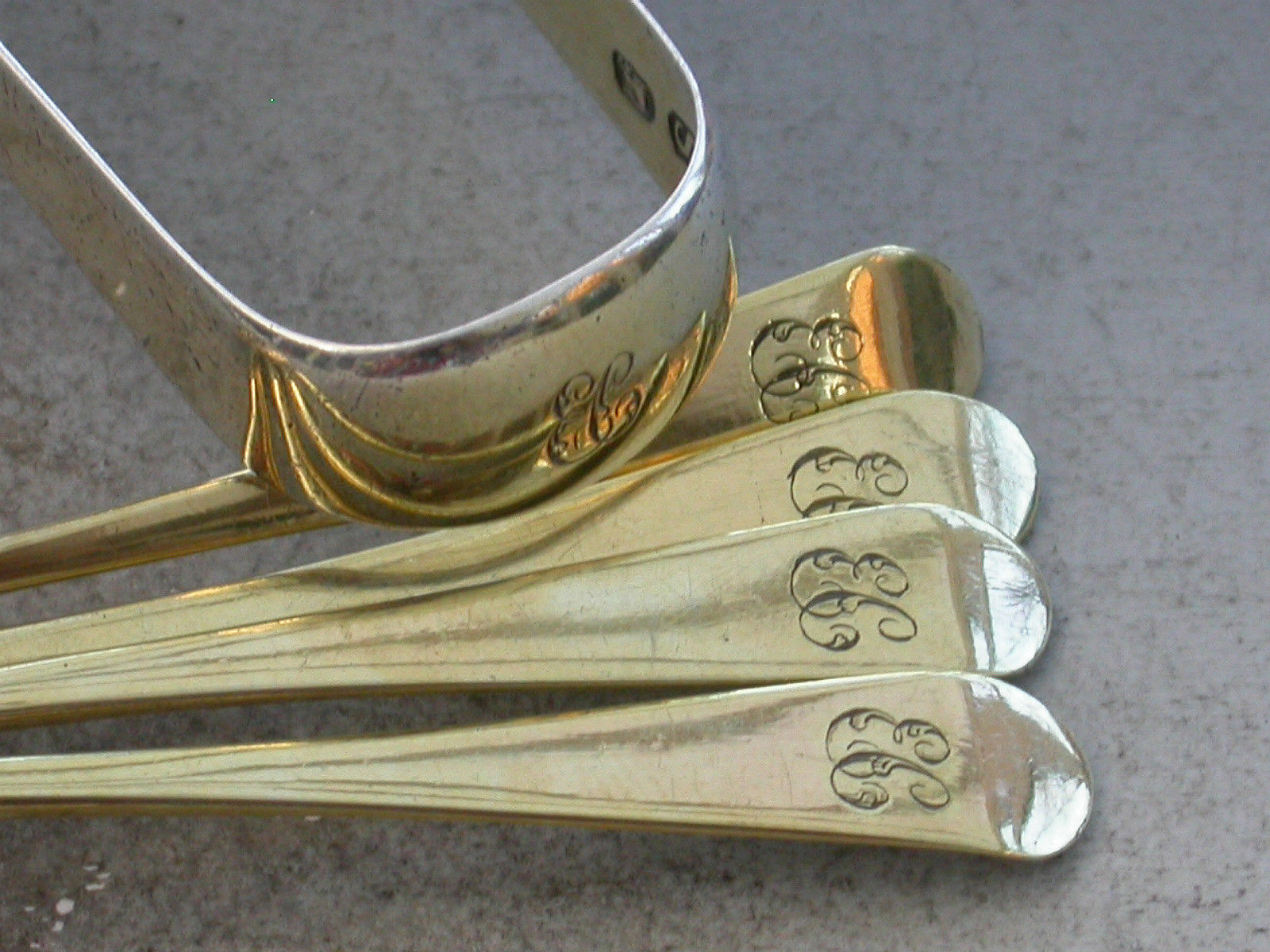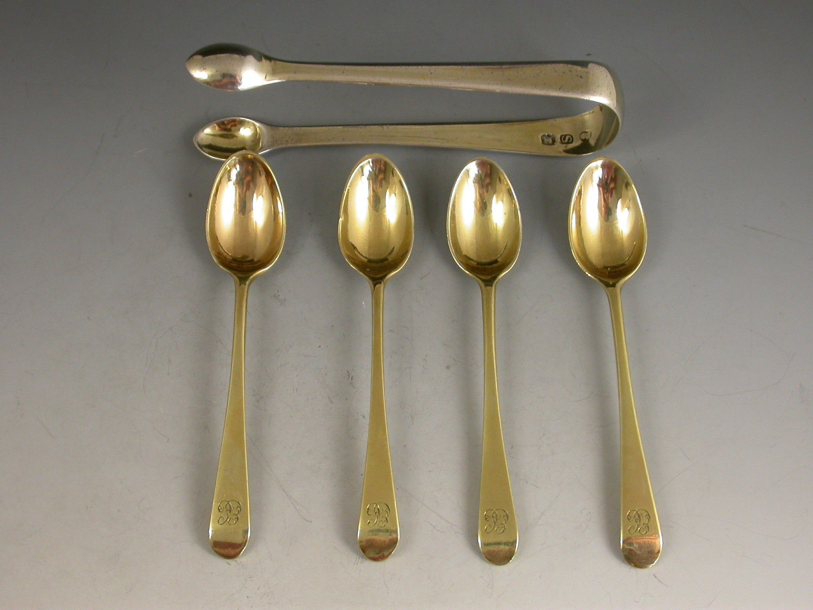 An interesting cased set of four miniature silver gilt Spoons of plain Old English pattern with a pair of similar miniature silver gilt Sugar Tongs en-suite. All five pieces engraved with matching contemporary script initials - 'EC'.