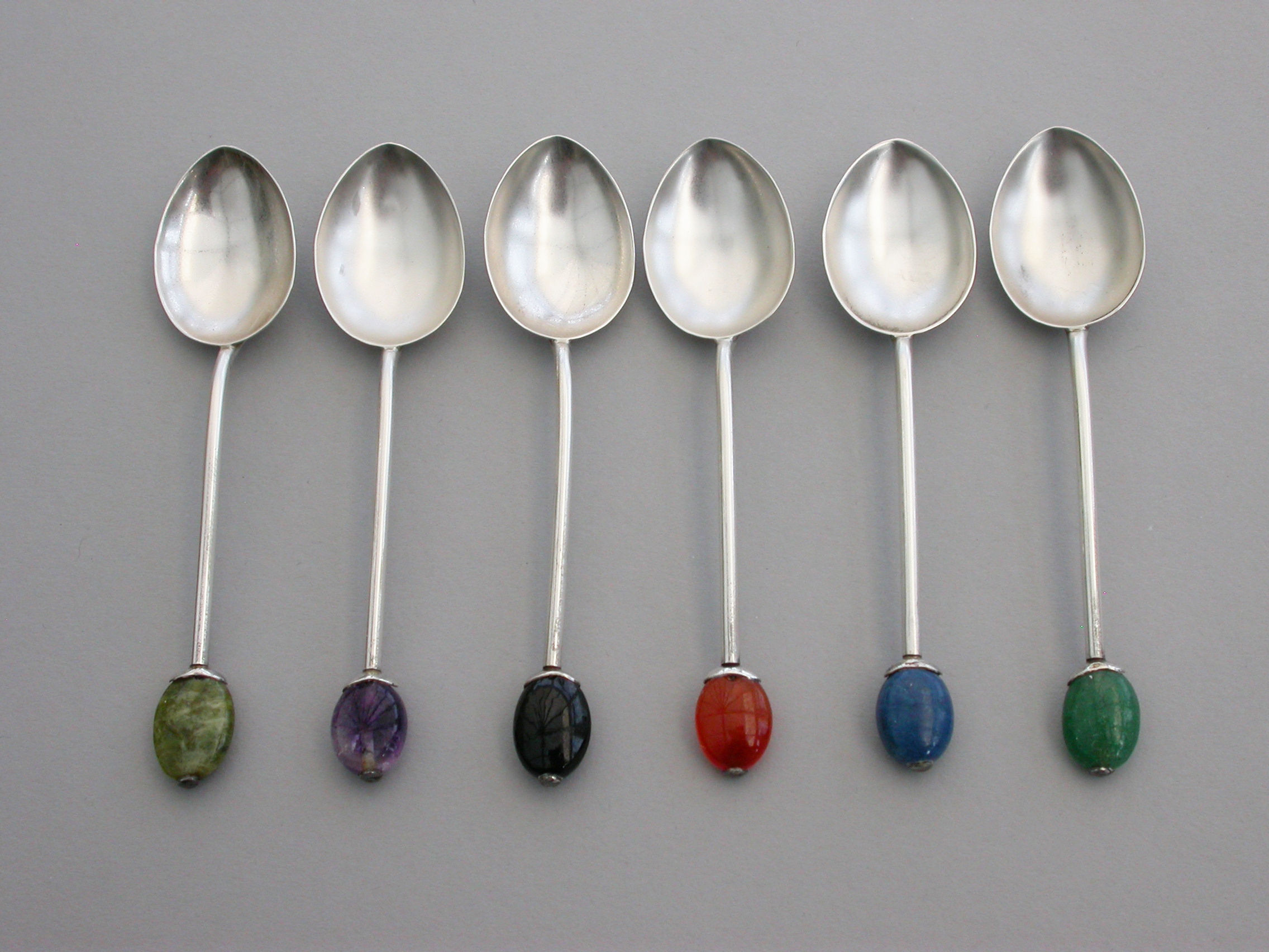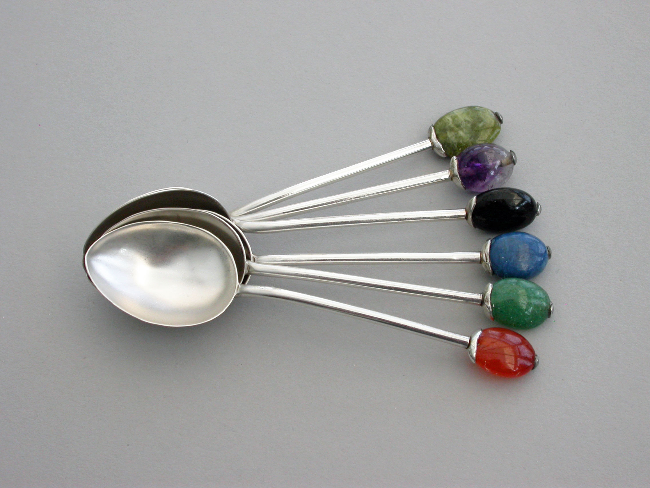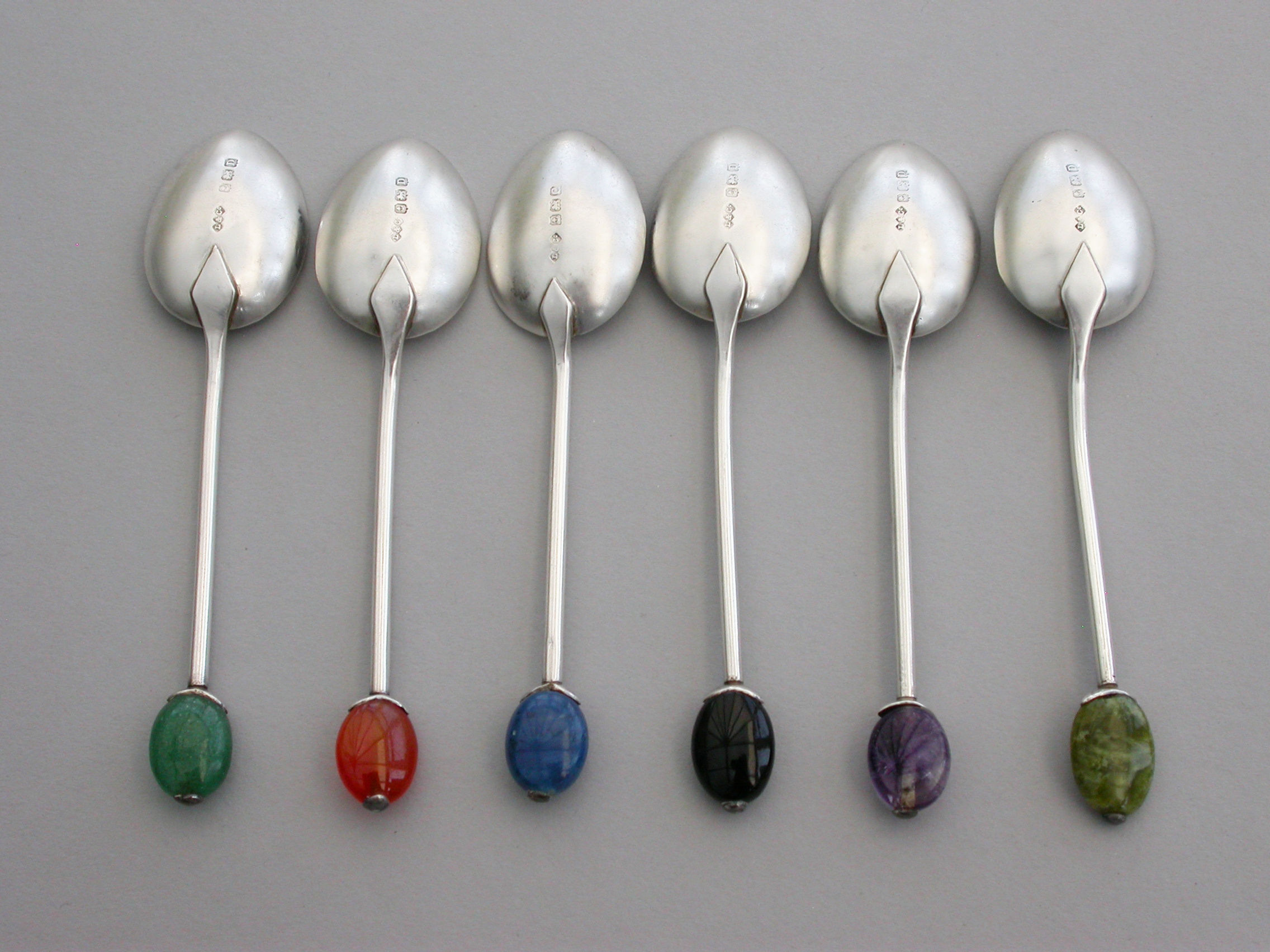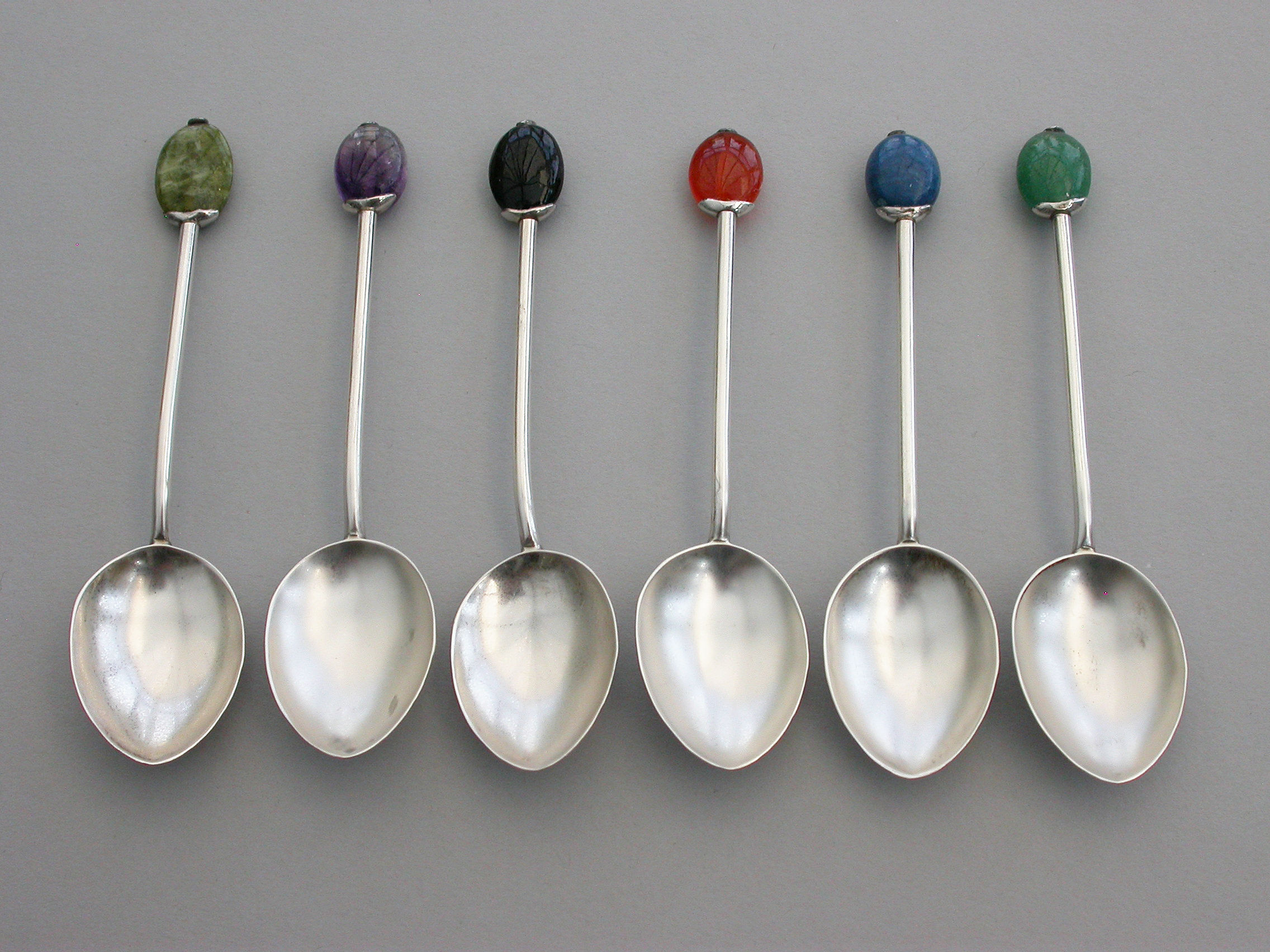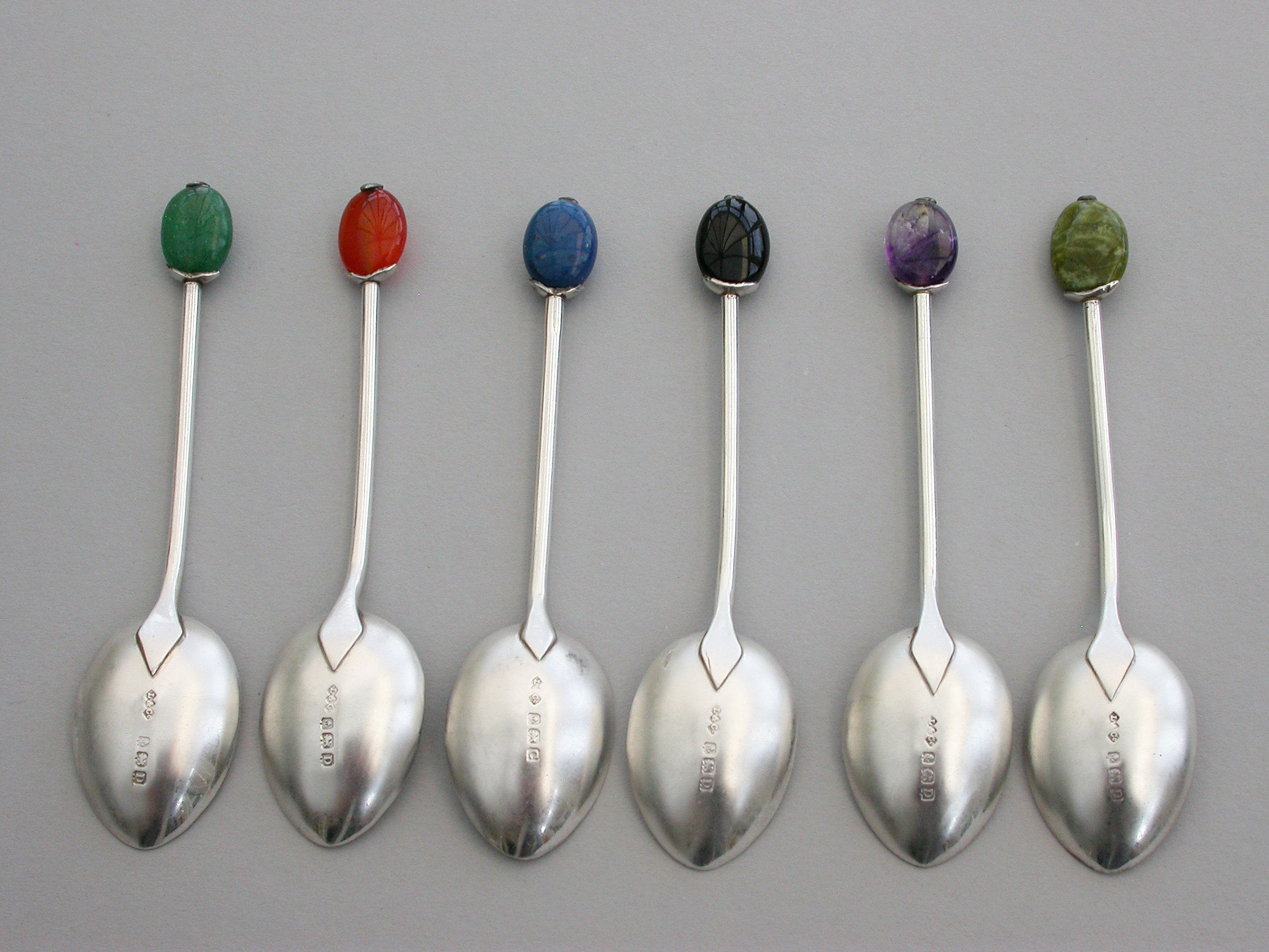 A good set of six cased silver Coffee Spoons, the terminals modelled as coffee beans from various different coloured hardstones. Complete with original fitted retailer's case.