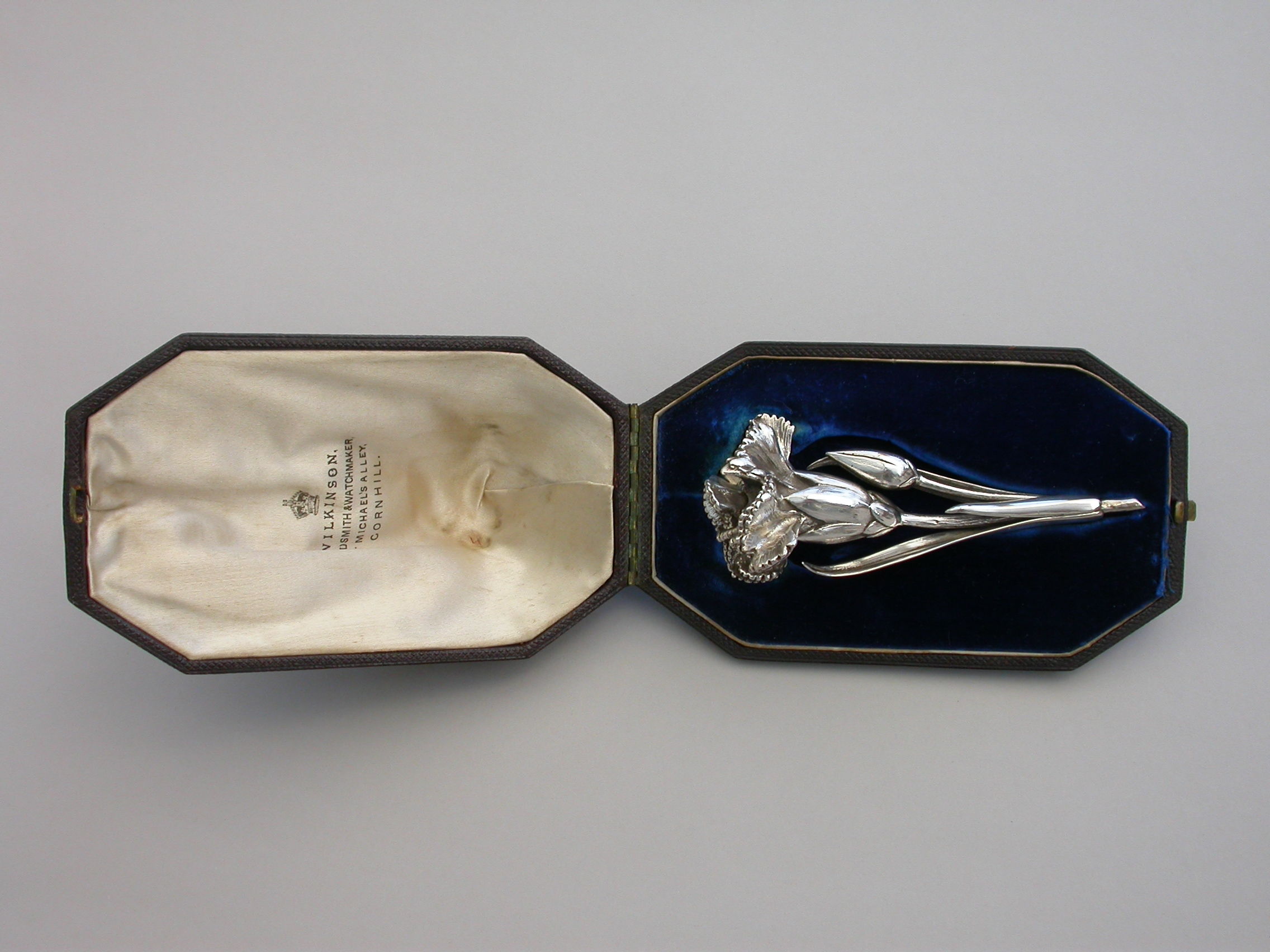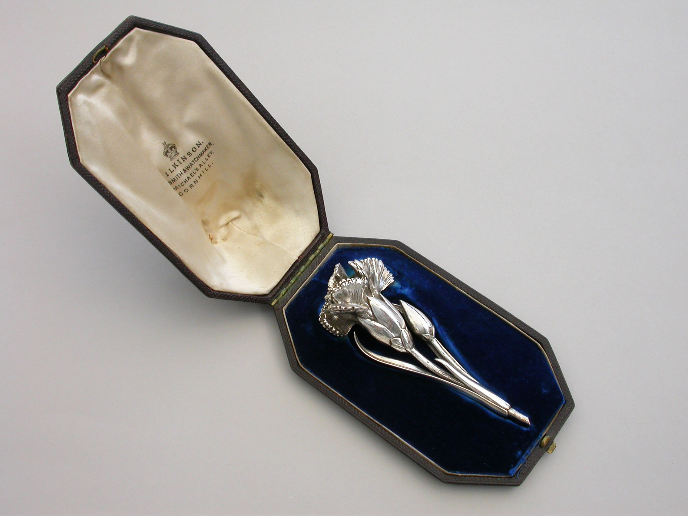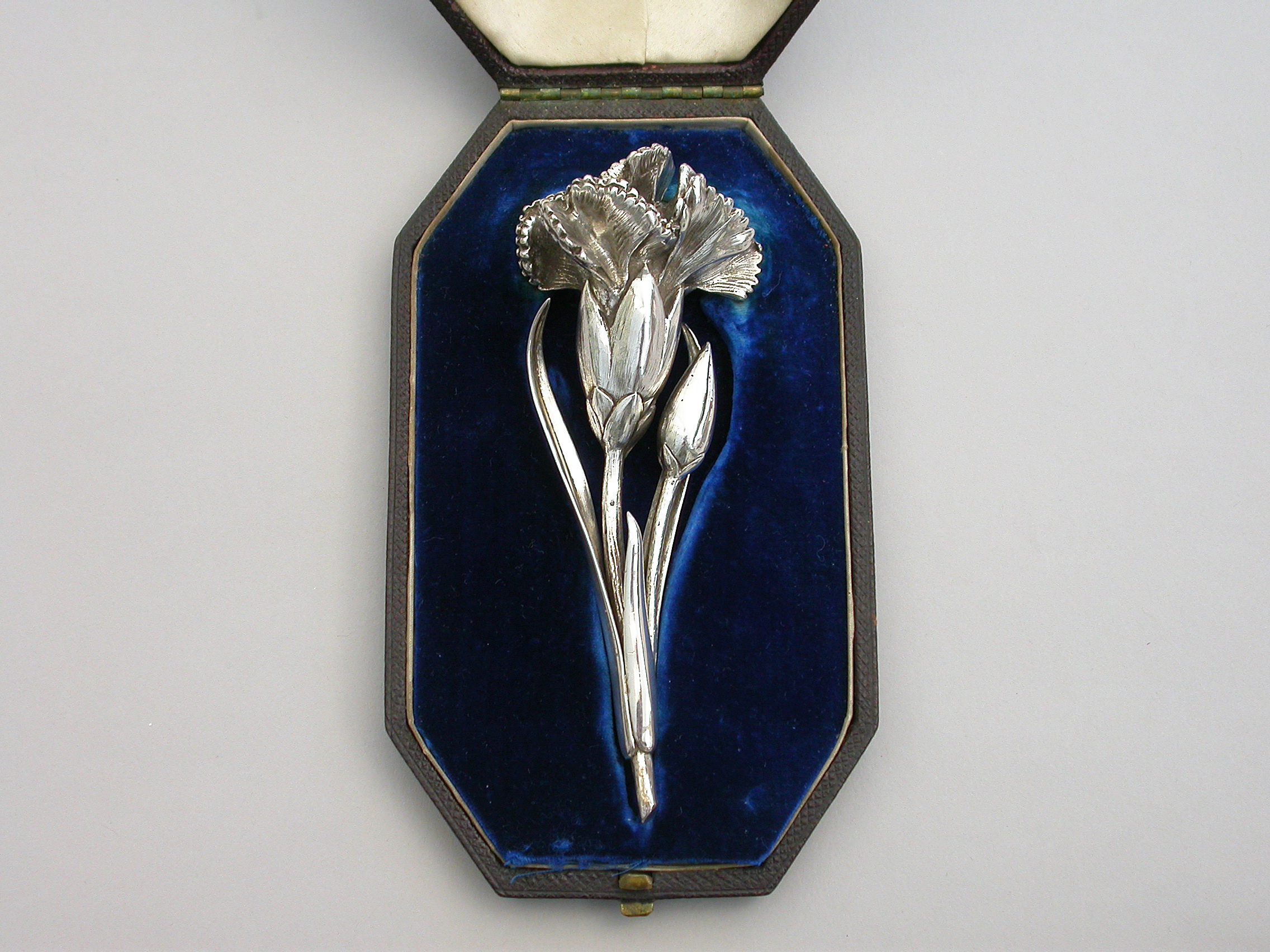 A large Victorian novelty silver Vinaigrette cast in the form of a Carnation flower and bud on a leafy stem, the centre of the flower opening to reveal a hinged silver gilt grille. Complete with original silk and velvet lined leather fitted case initialed ""FB"".
