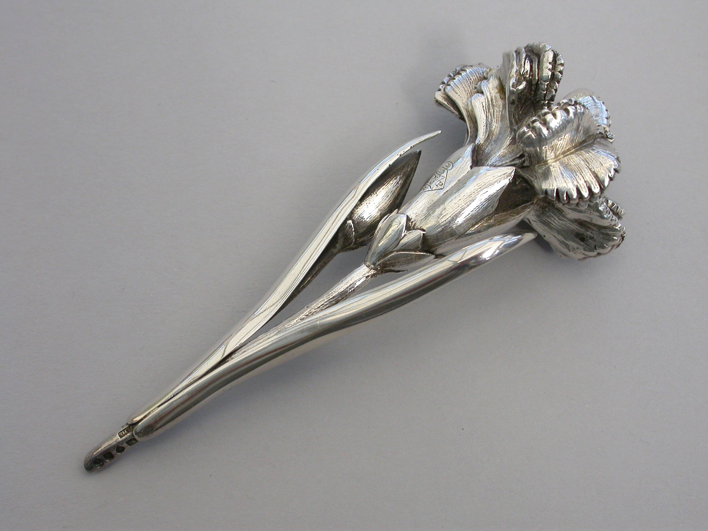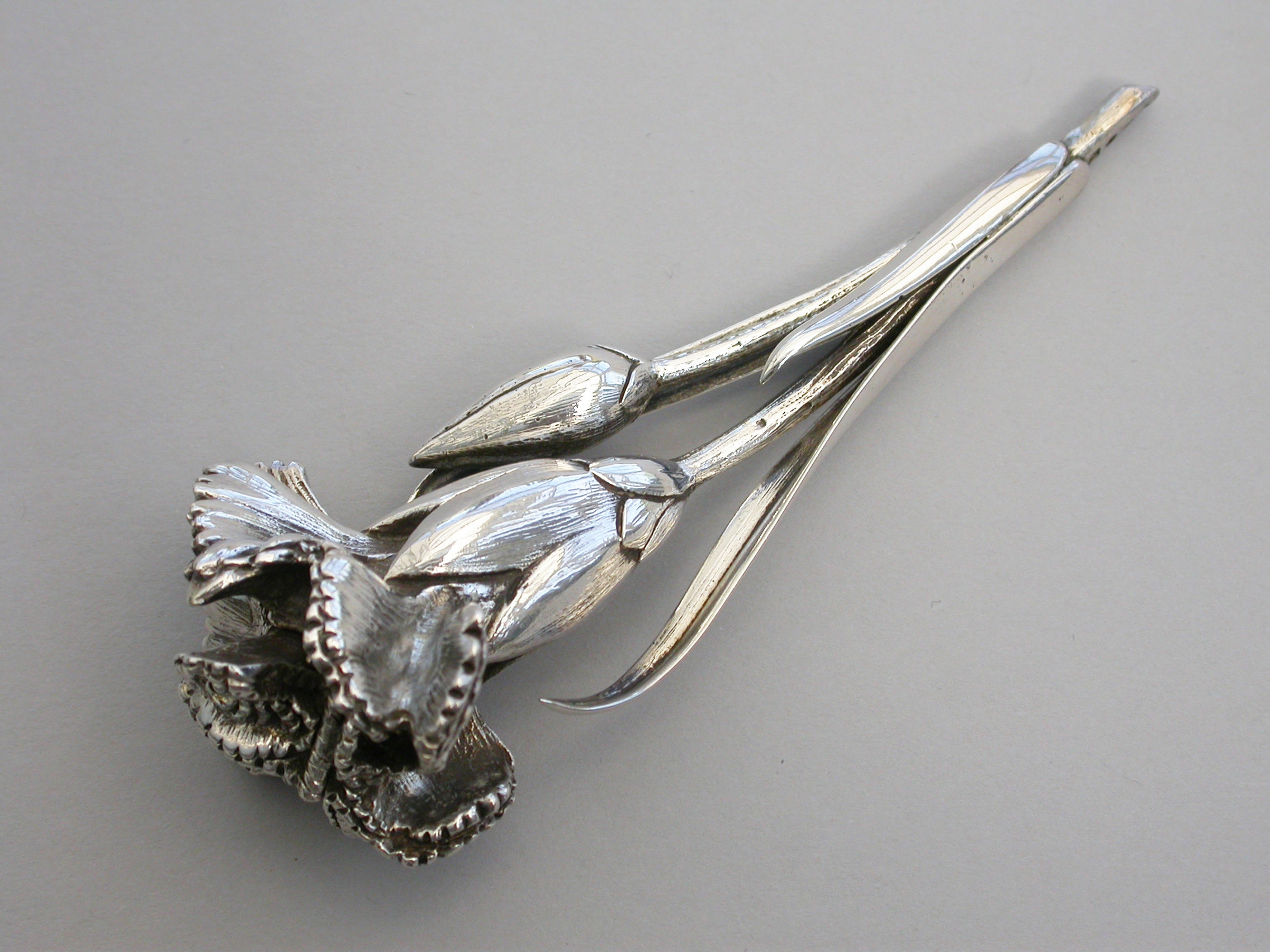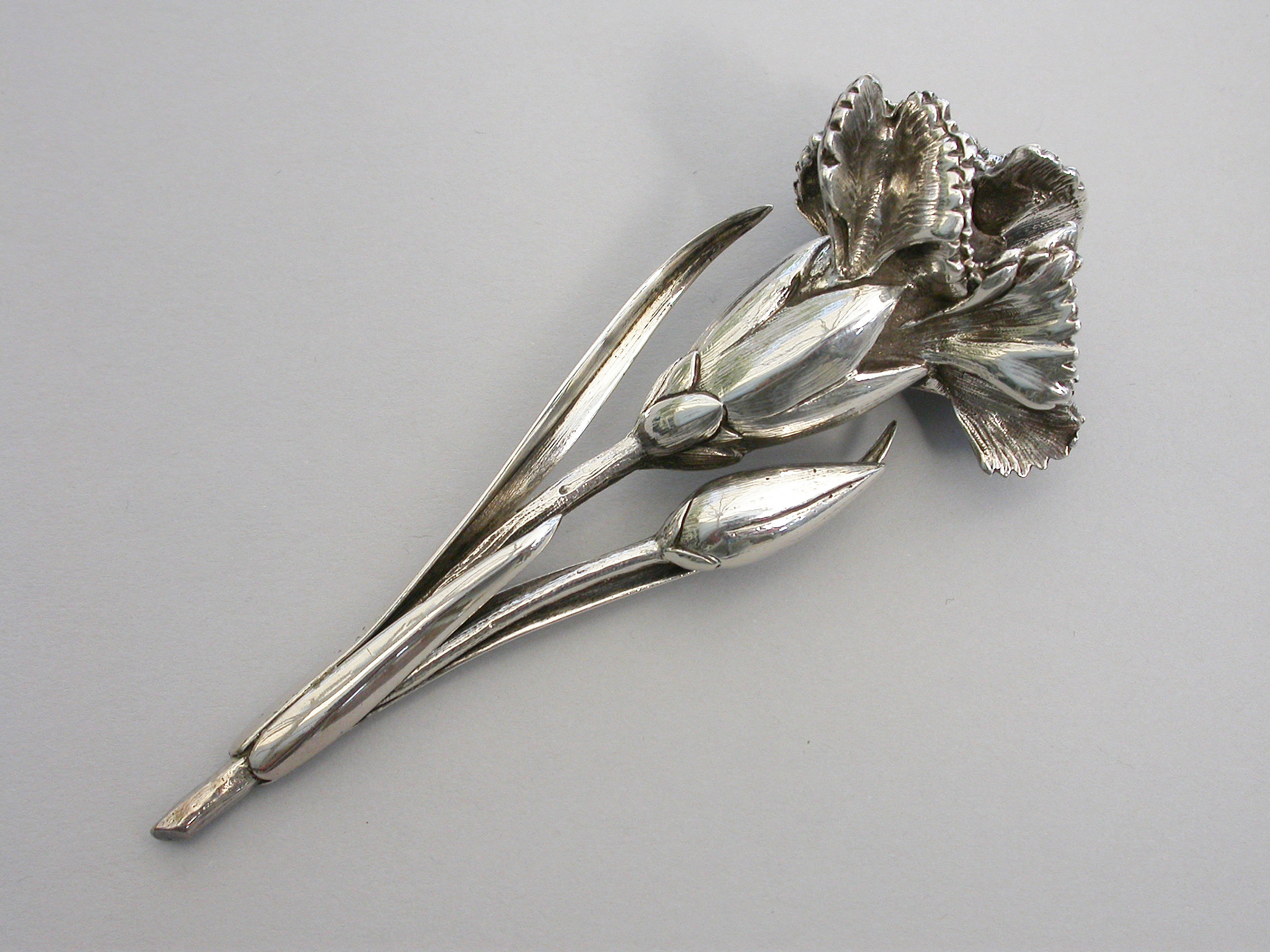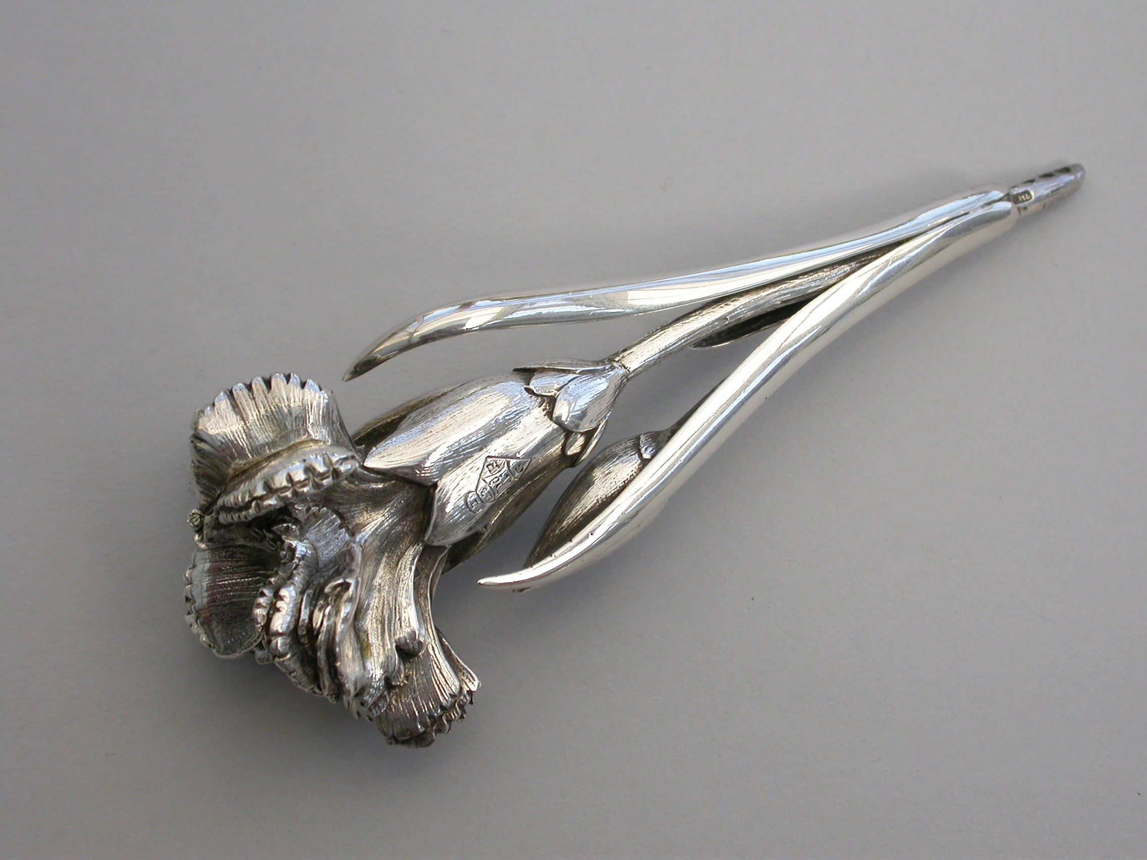 A large Victorian novelty silver Vinaigrette cast in the form of a Carnation flower and bud on a leafy stem, the centre of the flower opening to reveal a hinged silver gilt grille. Complete with original silk and velvet lined leather fitted case initialed ""FB"".