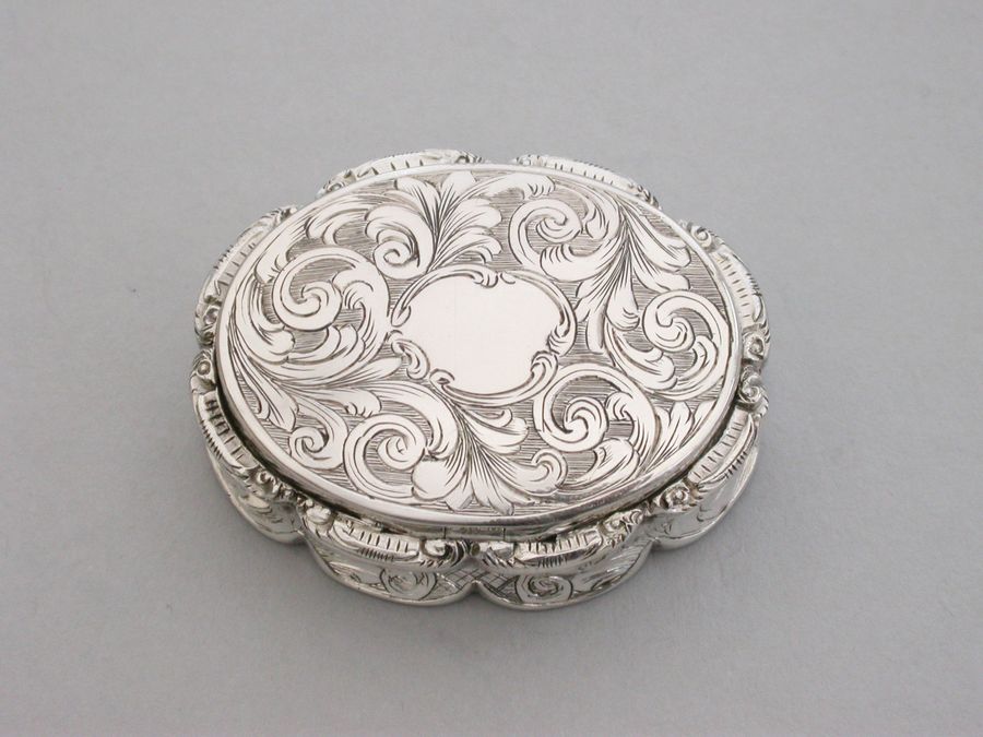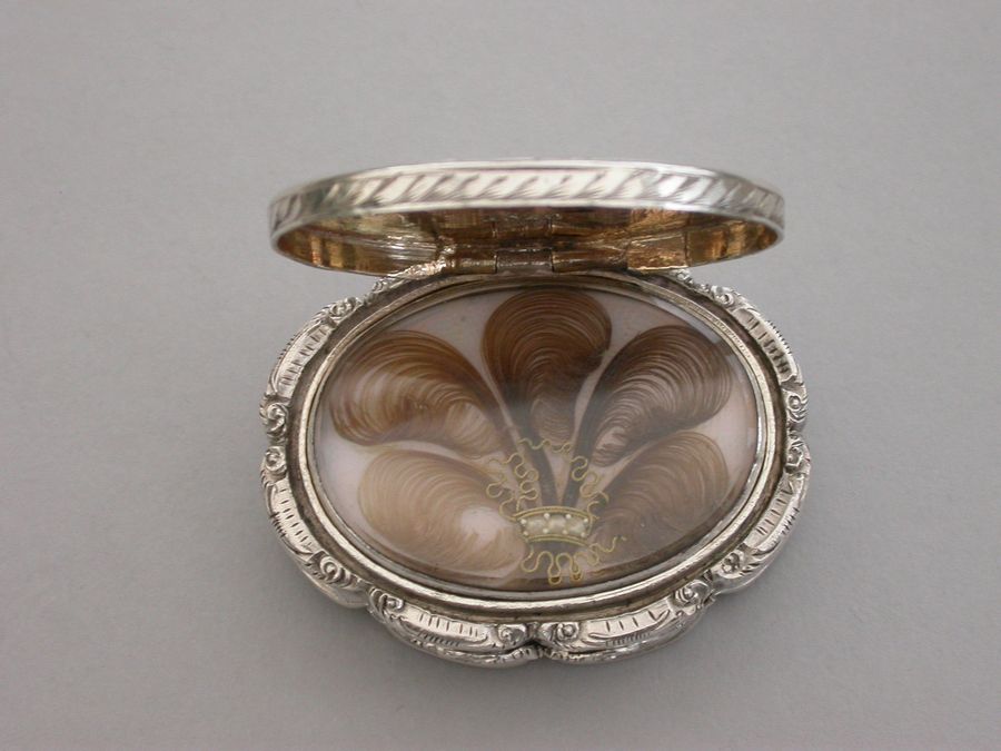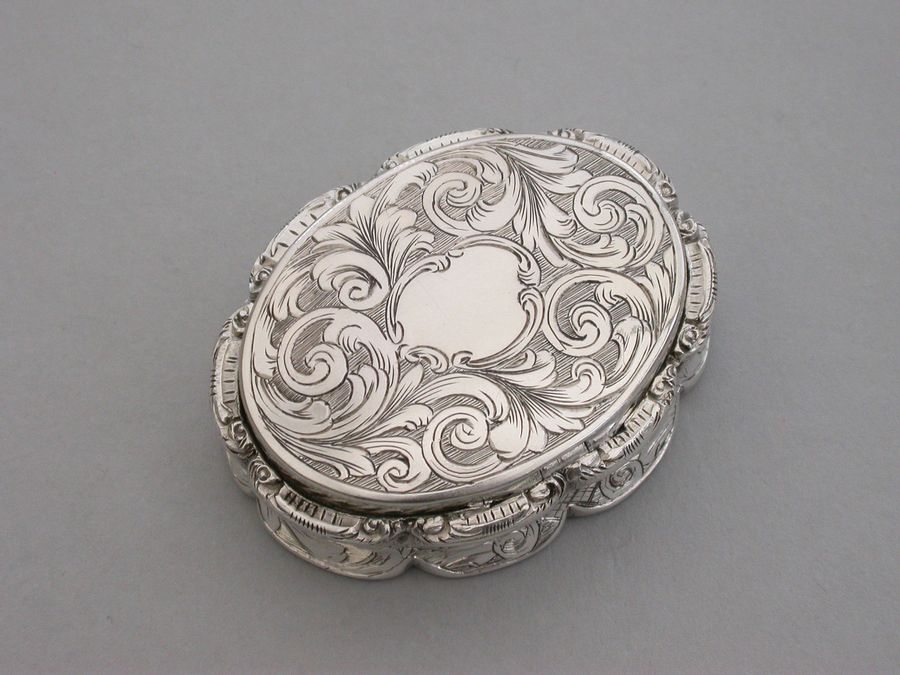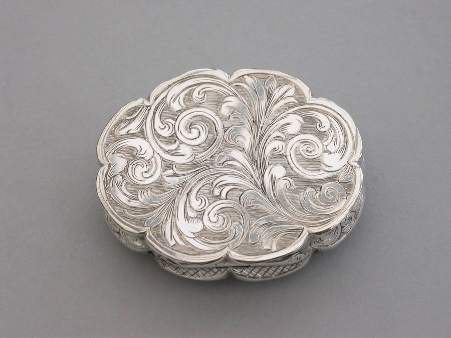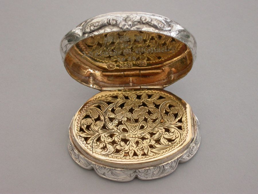 A very fine Victorian oval silver Vinaigrette with shaped borders and cast thumb-piece, the cover engraved with scrolls on a rayed background, inscribed inside: ""M W H to Adalaide Cholmeley 1853"", the intricately pierced grille including a vase of flowers. A memorial chamber concealed under a second hinged lid engraved with a presentation inscription in French dated 1846 and containing arranged locks of hair held together with a tiara formed from pearls and gold wire under a glass cover.