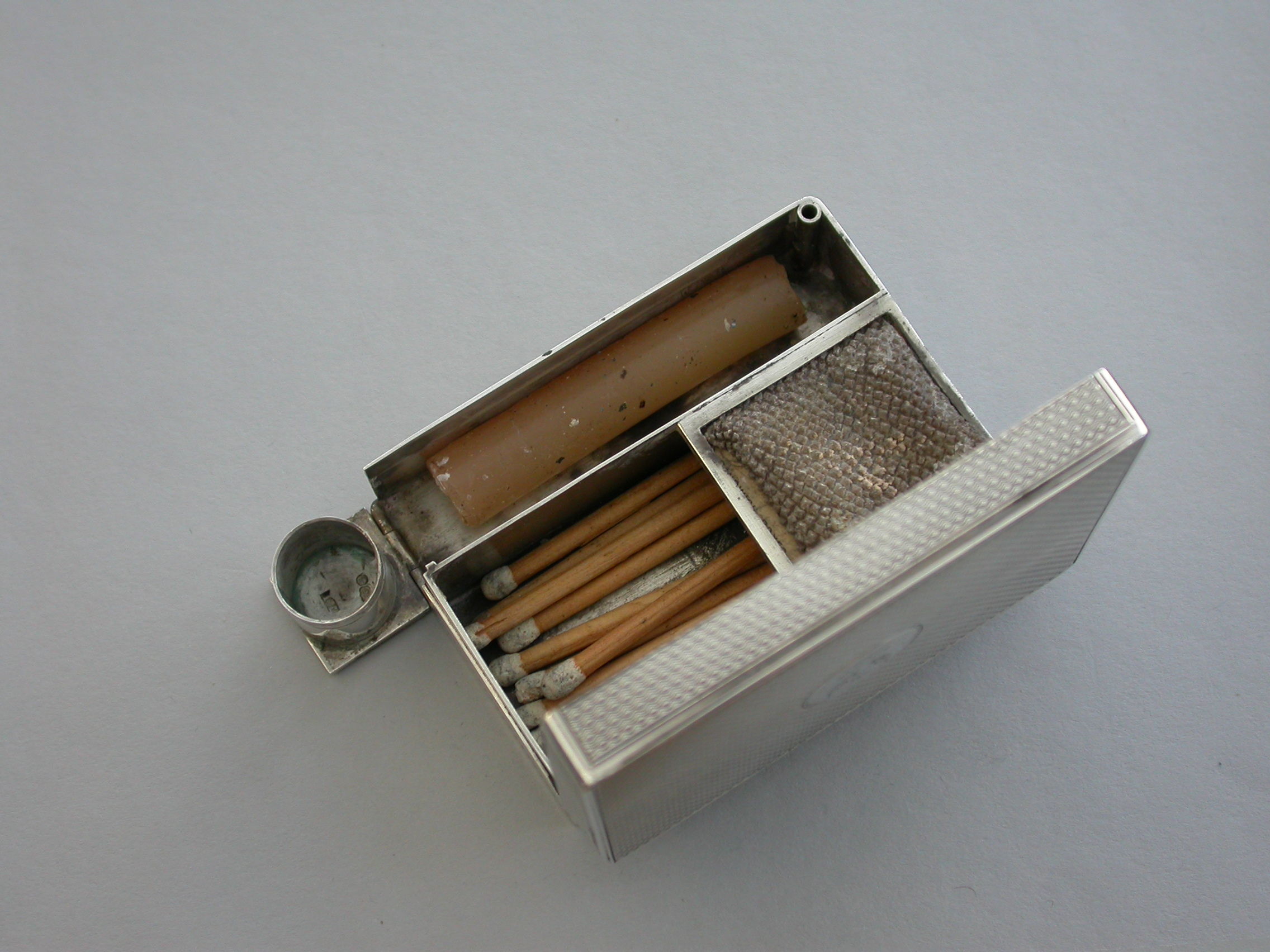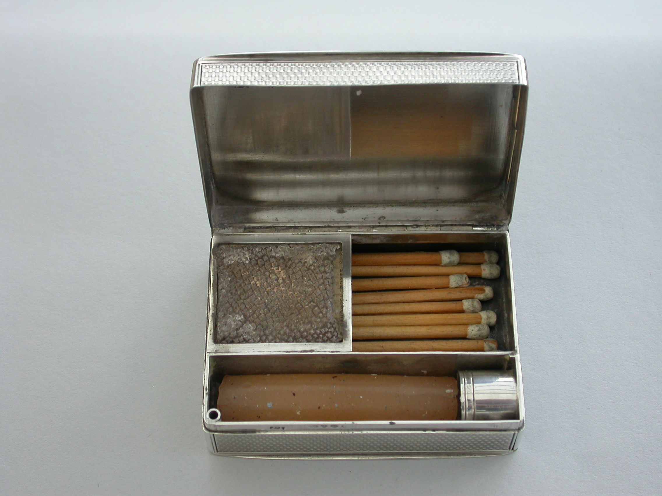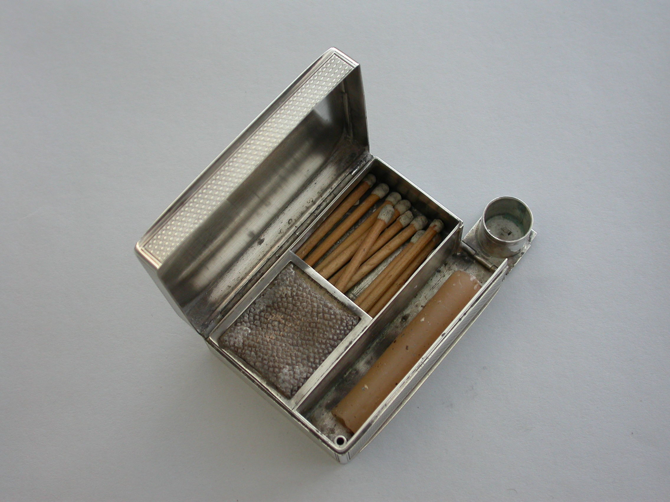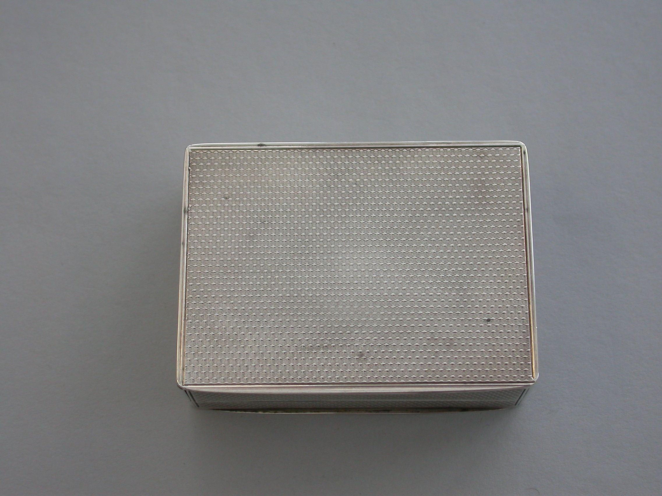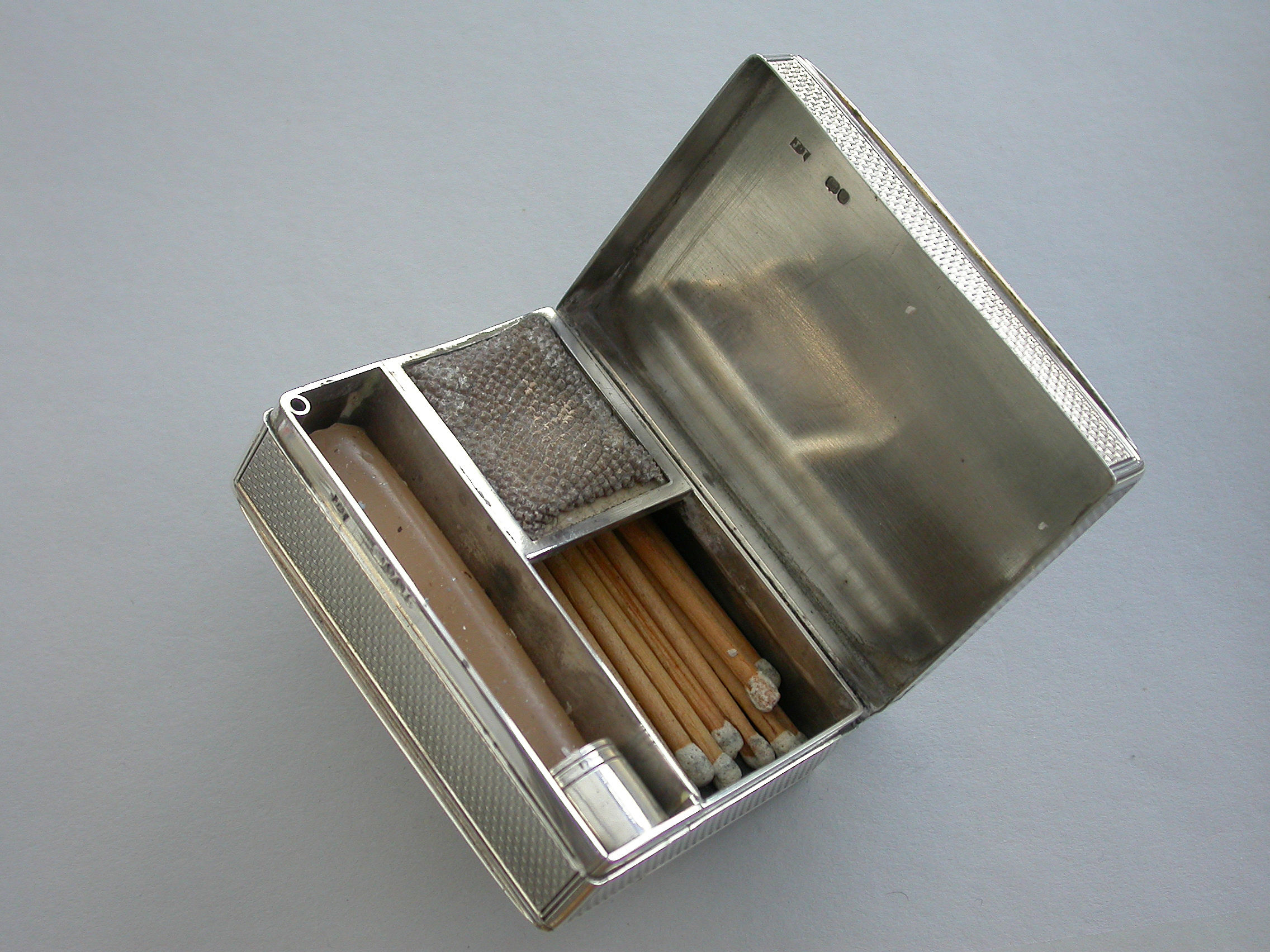 A good mid Victorian silver Table Vesta Case or ""Go to Bed"", of plain rectangular form with all-over engine turned decoration, the lid with circular cartouche engraved with eagle crest. The interior with compartment for matches, a sharks-skin striking panel and a hinged fold-out candle. Complete with original silk and velvet lined leather case.