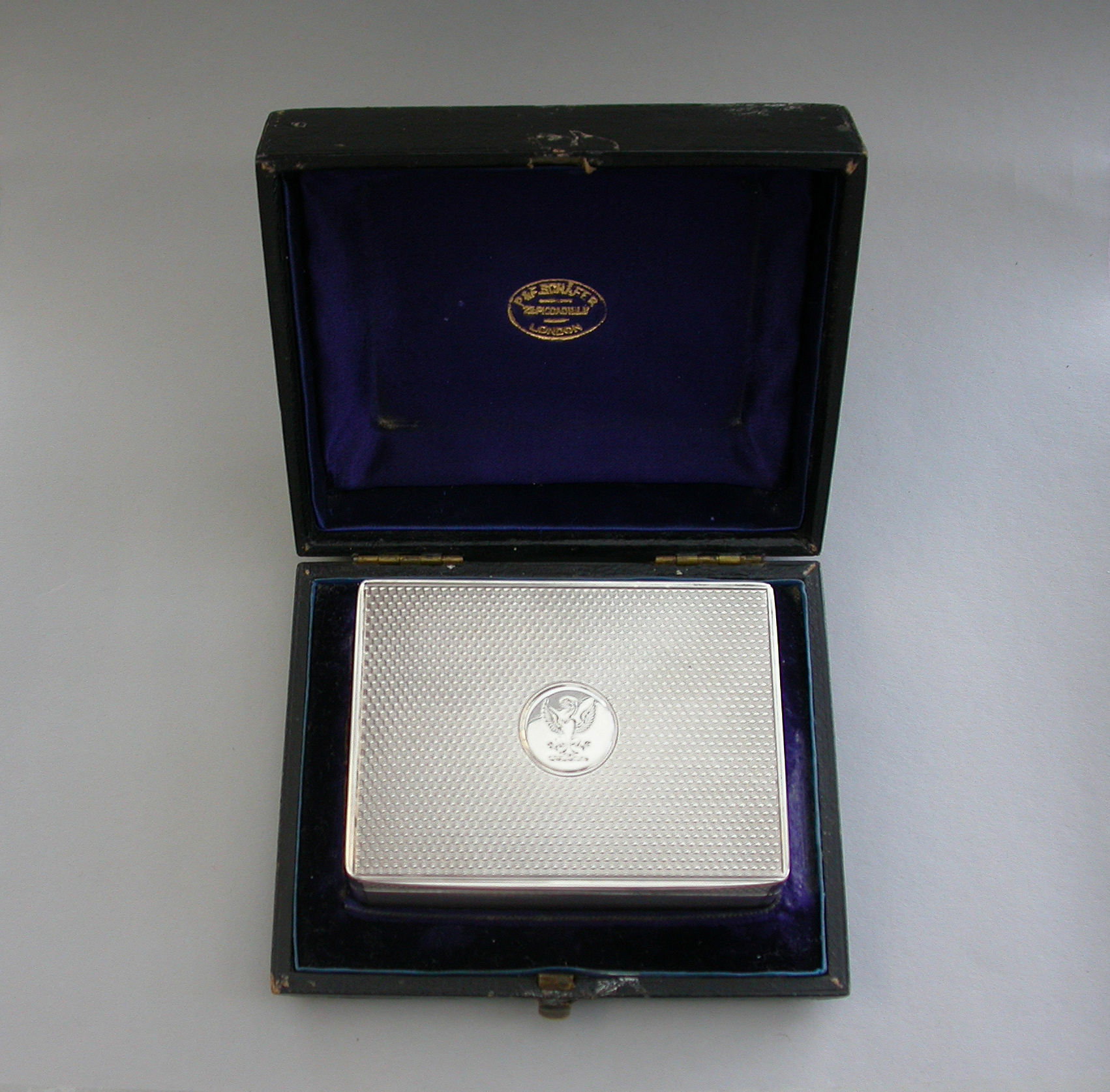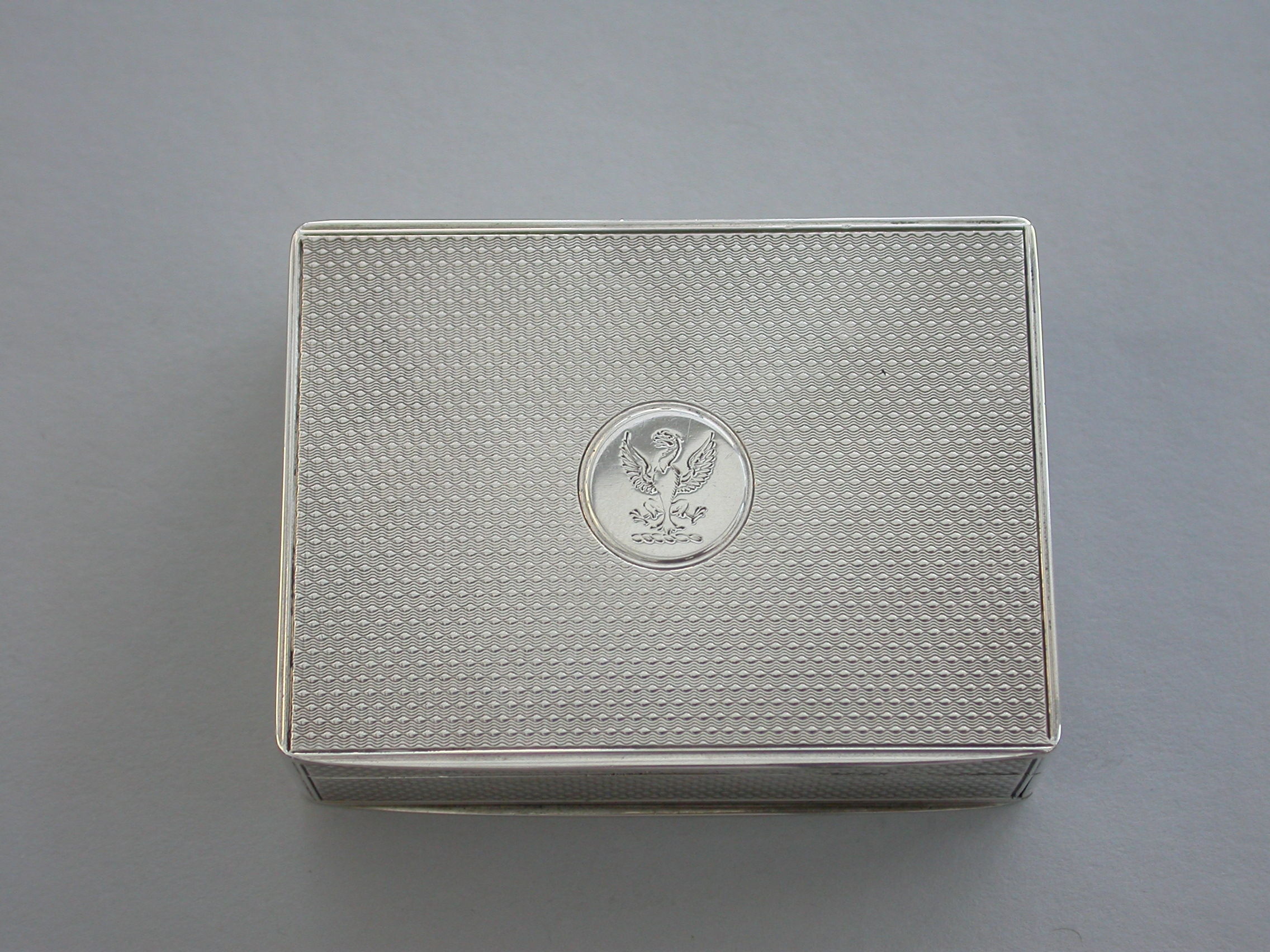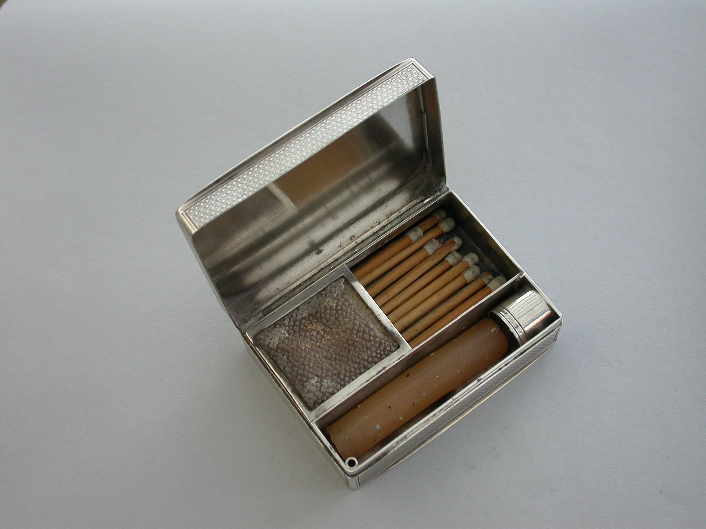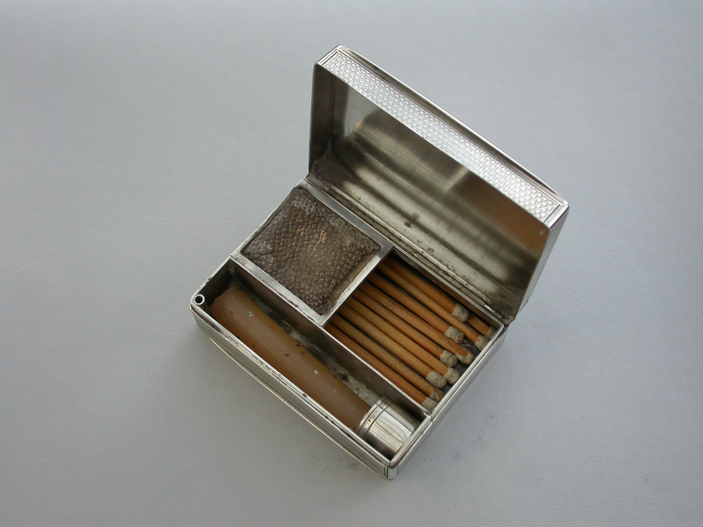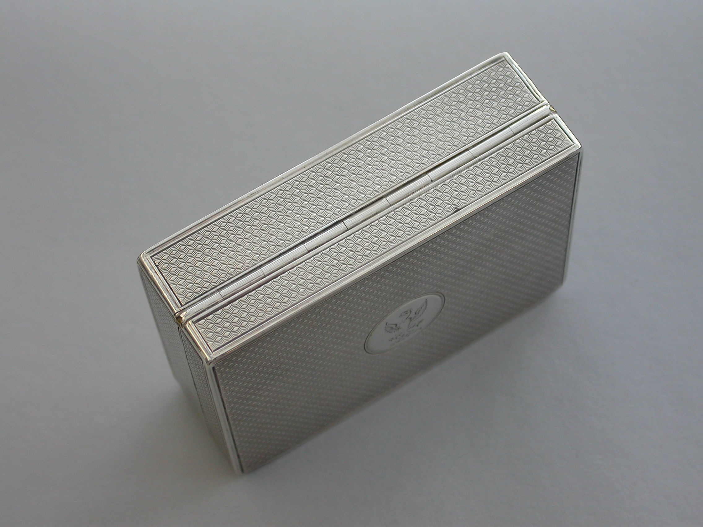 A good mid Victorian silver Table Vesta Case or ""Go to Bed"", of plain rectangular form with all-over engine turned decoration, the lid with circular cartouche engraved with eagle crest. The interior with compartment for matches, a sharks-skin striking panel and a hinged fold-out candle. Complete with original silk and velvet lined leather case.