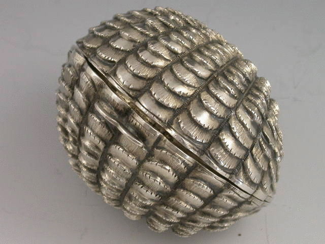 A very rare Victorian silver naturalistic Nutmeg Grater, realistically modelled as a clam shell, the hinged body opening to reveal the hinged metal grater.