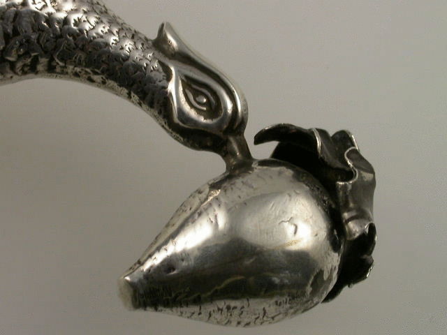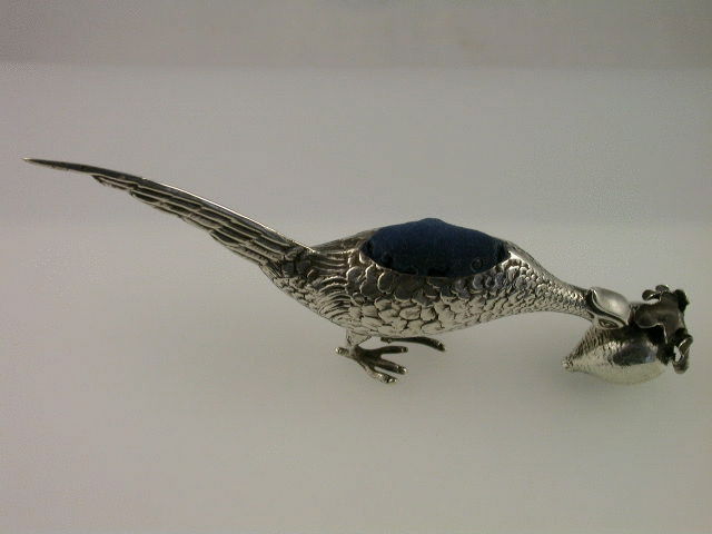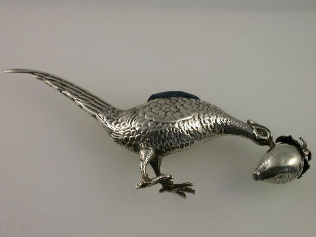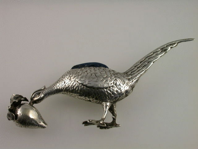 A large and rare early 20th century silver Pin Cushion modelled as a Cock Pheasant pecking at a turnip.
