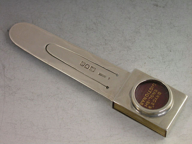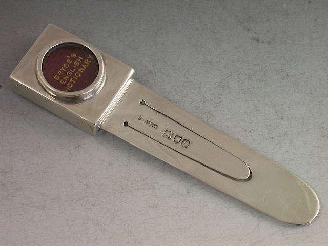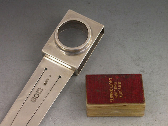 A rare Victorian silver Combination Bookmark with magnifying glass compartment containing a miniature Bryce’s English Dictionary.