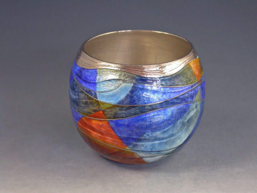 A very fine quality contemporary silver and enamel Tumble Cup, enamelled with overlapping waves of different shades of blue, orange and white enamel using champleve and basse-taille techniques.
