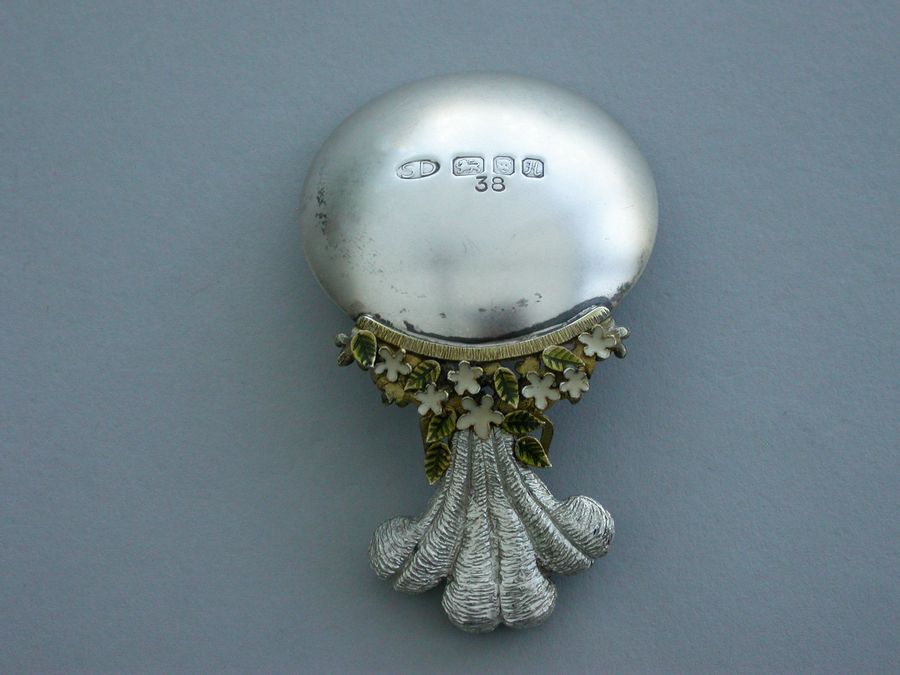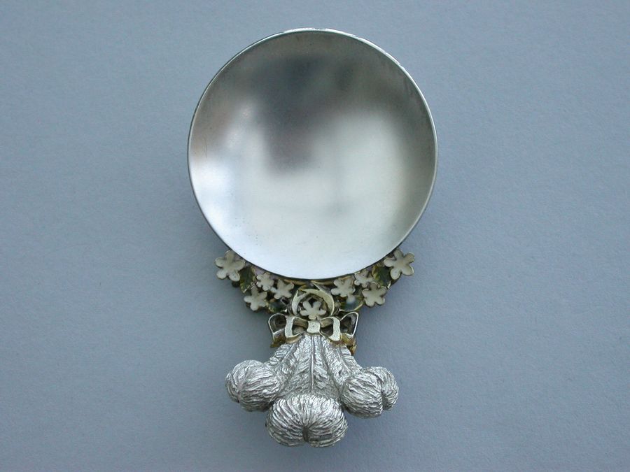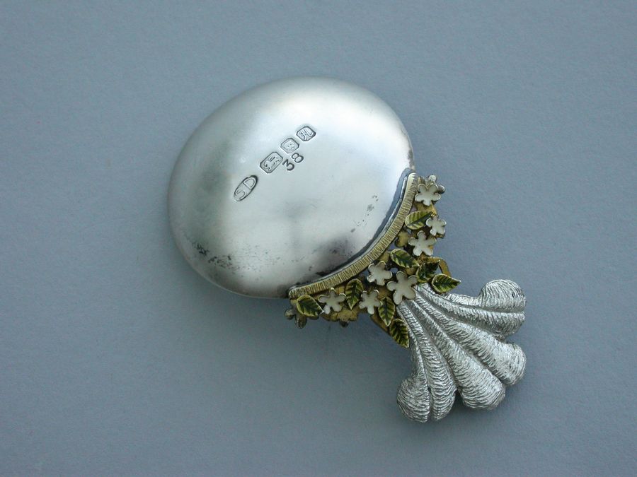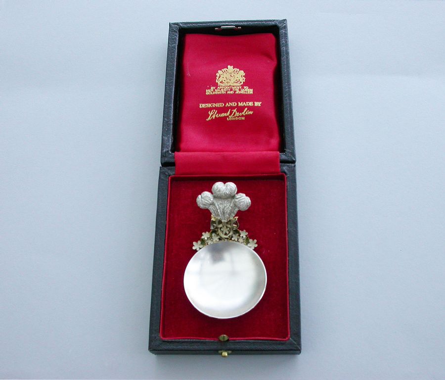 A fine quality modern silver, silver gilt and enamel limited edition (No 38) Caddy Spoon made to commemorate the birth of Prince William, with plain circular silver bowl, the handle formed from The Prince of Wales Feathers above enamelled flower heads and leaves linked by a tied silver gilt ribbon.
