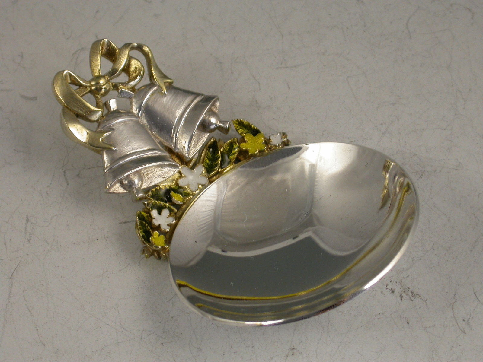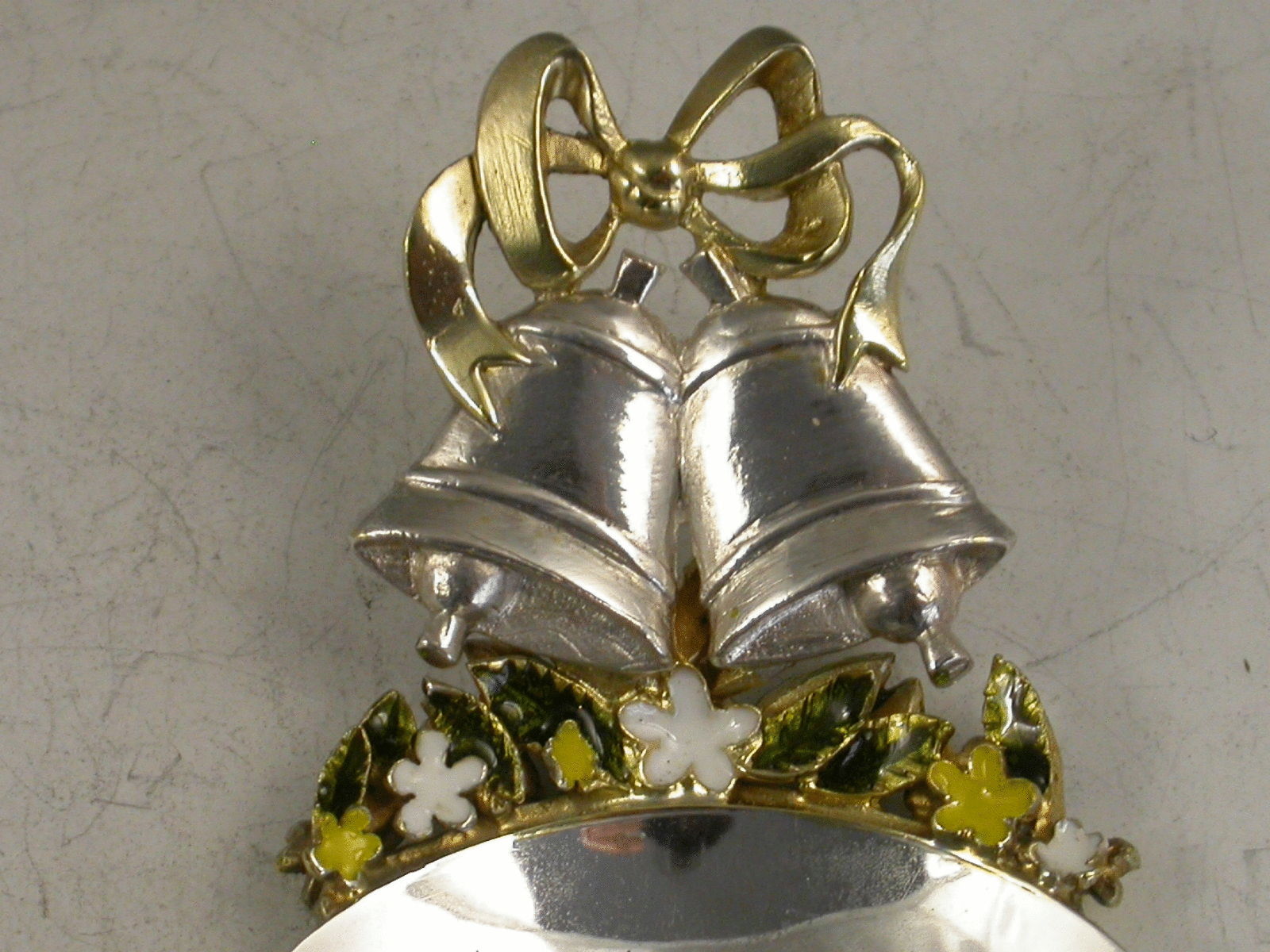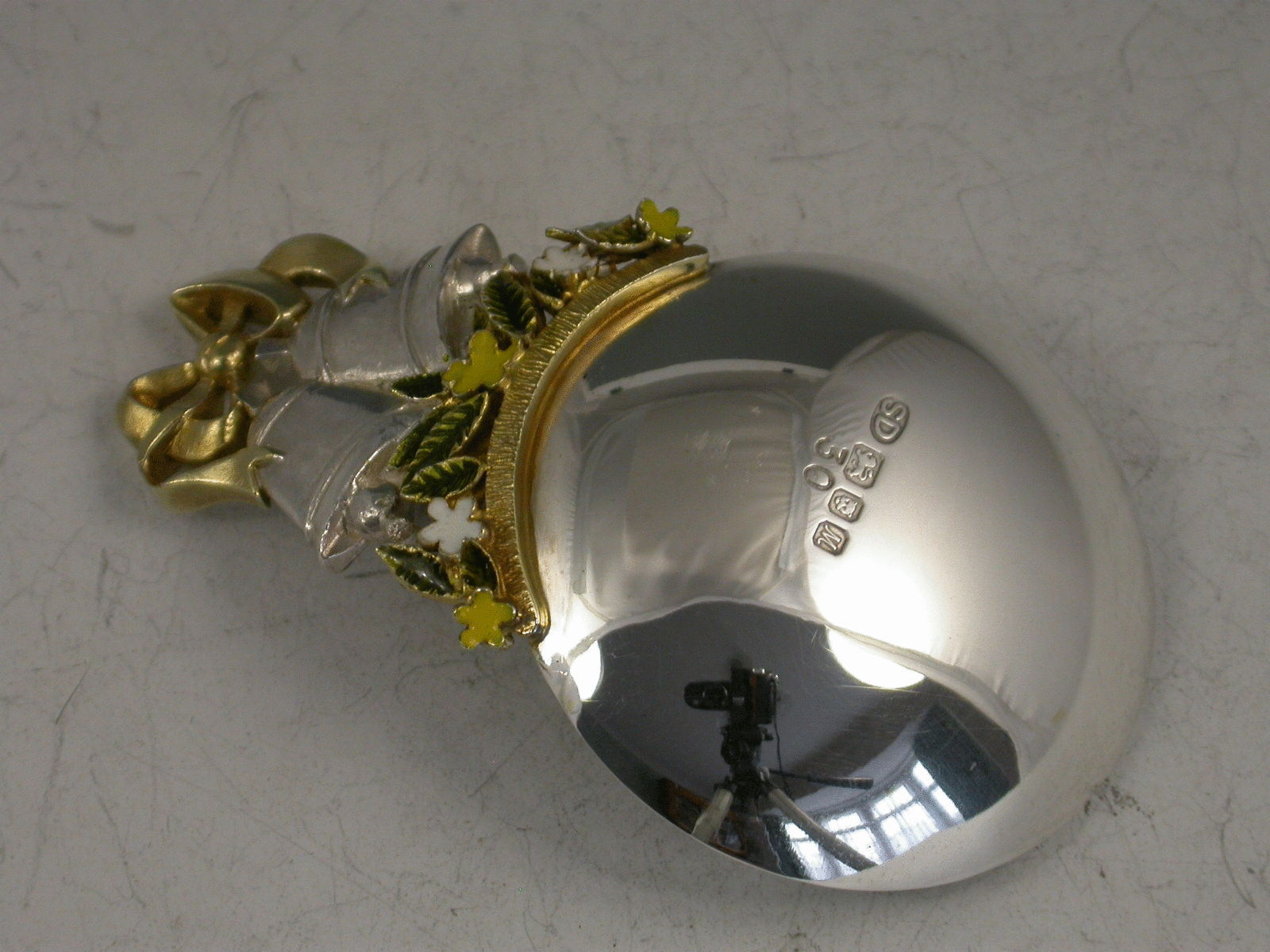A fine quality modern silver, silver gilt and enamel limited edition Caddy Spoon made to commemorate the Royal Wedding between Prince Andrew and Sarah Ferguson in 1986, with plain circular silver bowl, the handle formed from two wedding bells above enamel flower heads and leaves, tied silver gilt ribbon surmount.