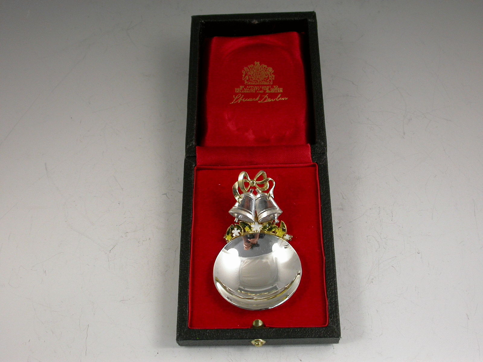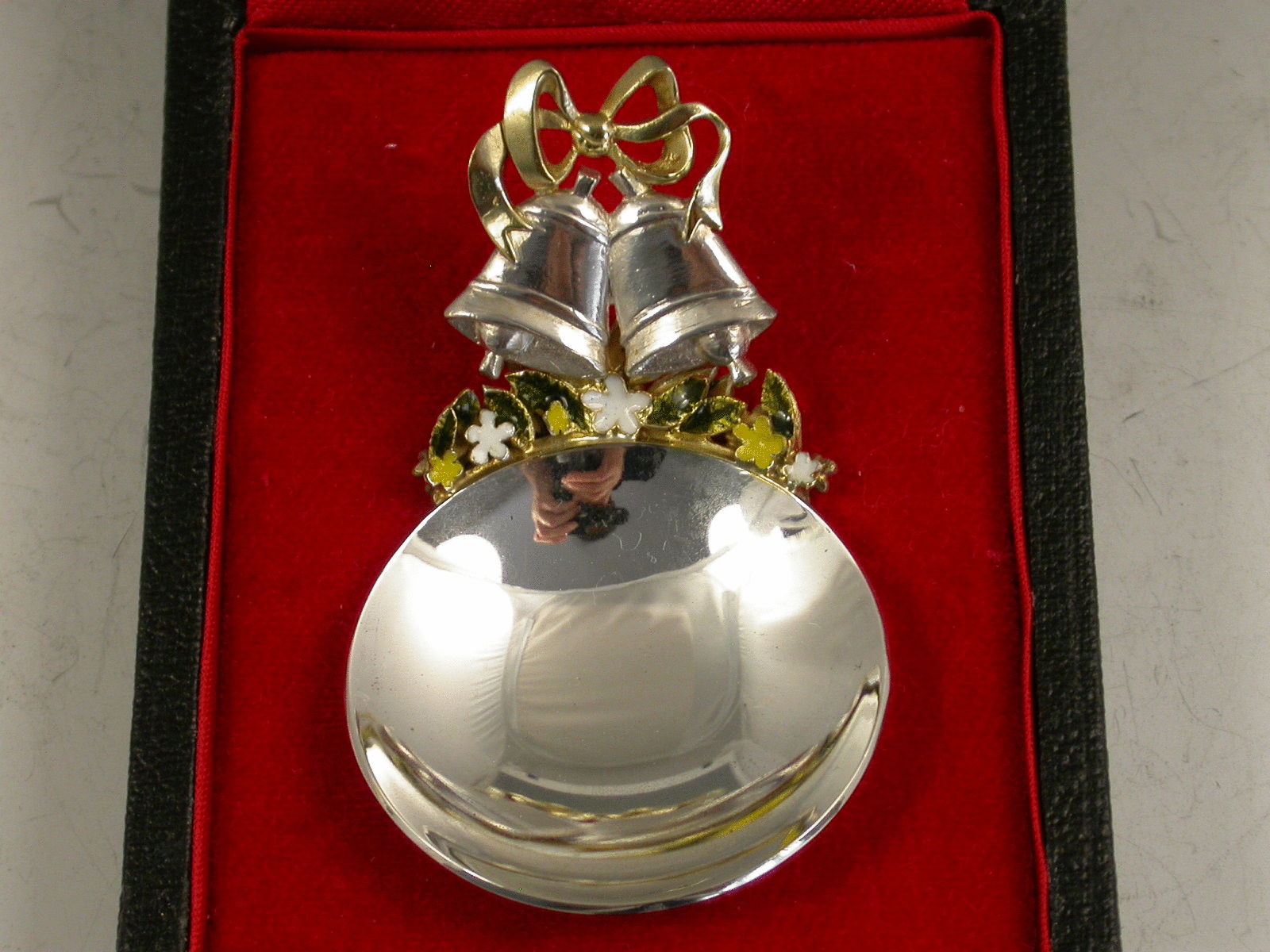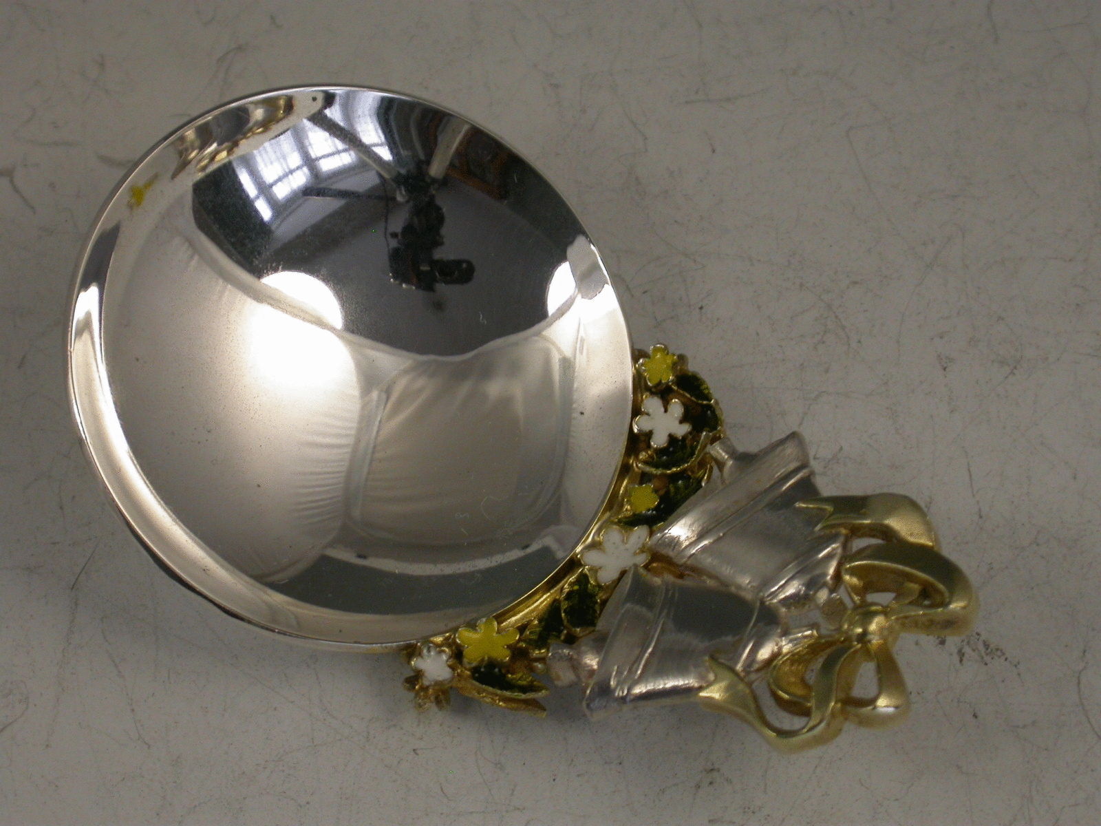 A fine quality modern silver, silver gilt and enamel limited edition Caddy Spoon made to commemorate the Royal Wedding between Prince Andrew and Sarah Ferguson in 1986, with plain circular silver bowl, the handle formed from two wedding bells above enamel flower heads and leaves, tied silver gilt ribbon surmount.