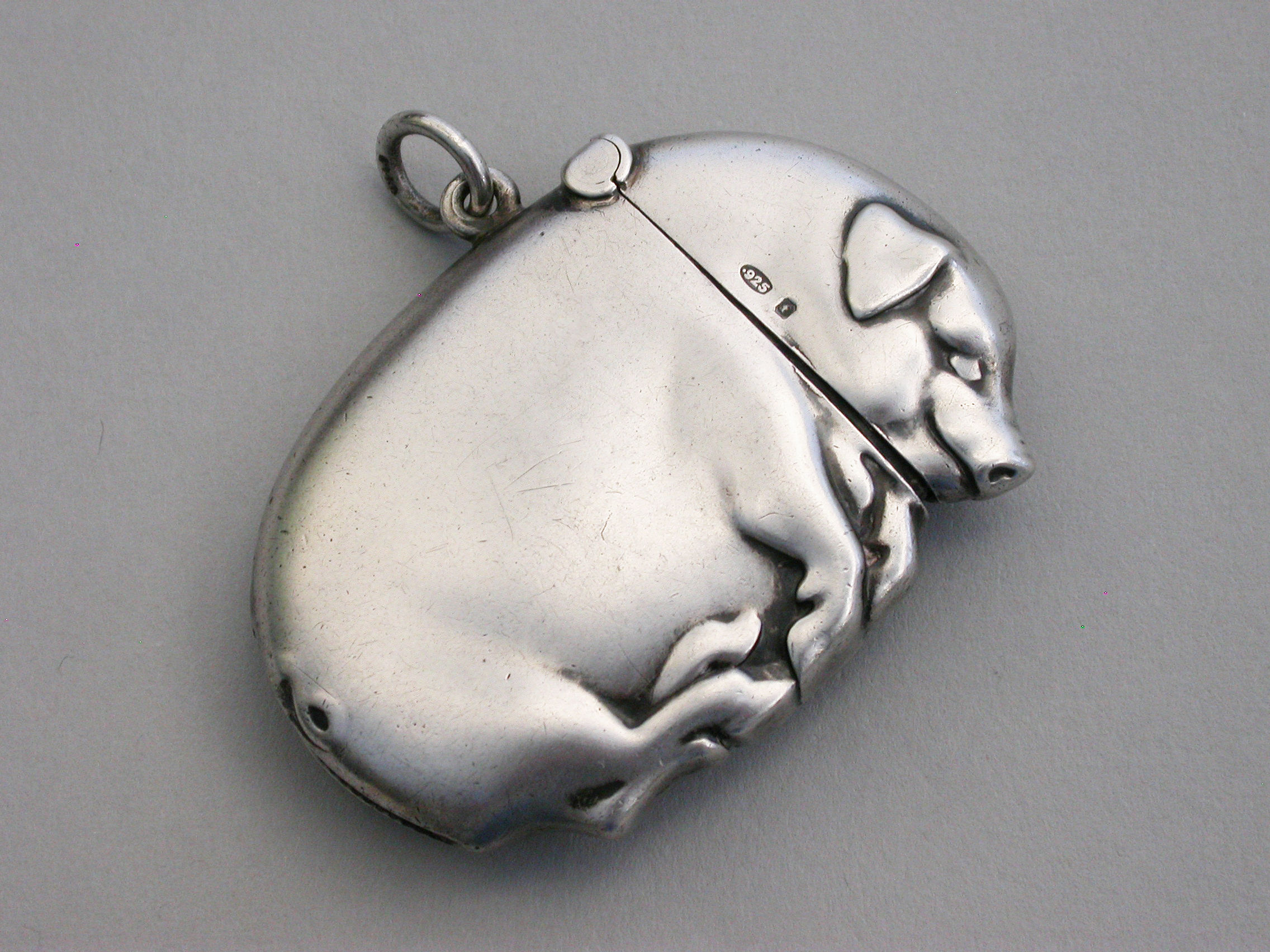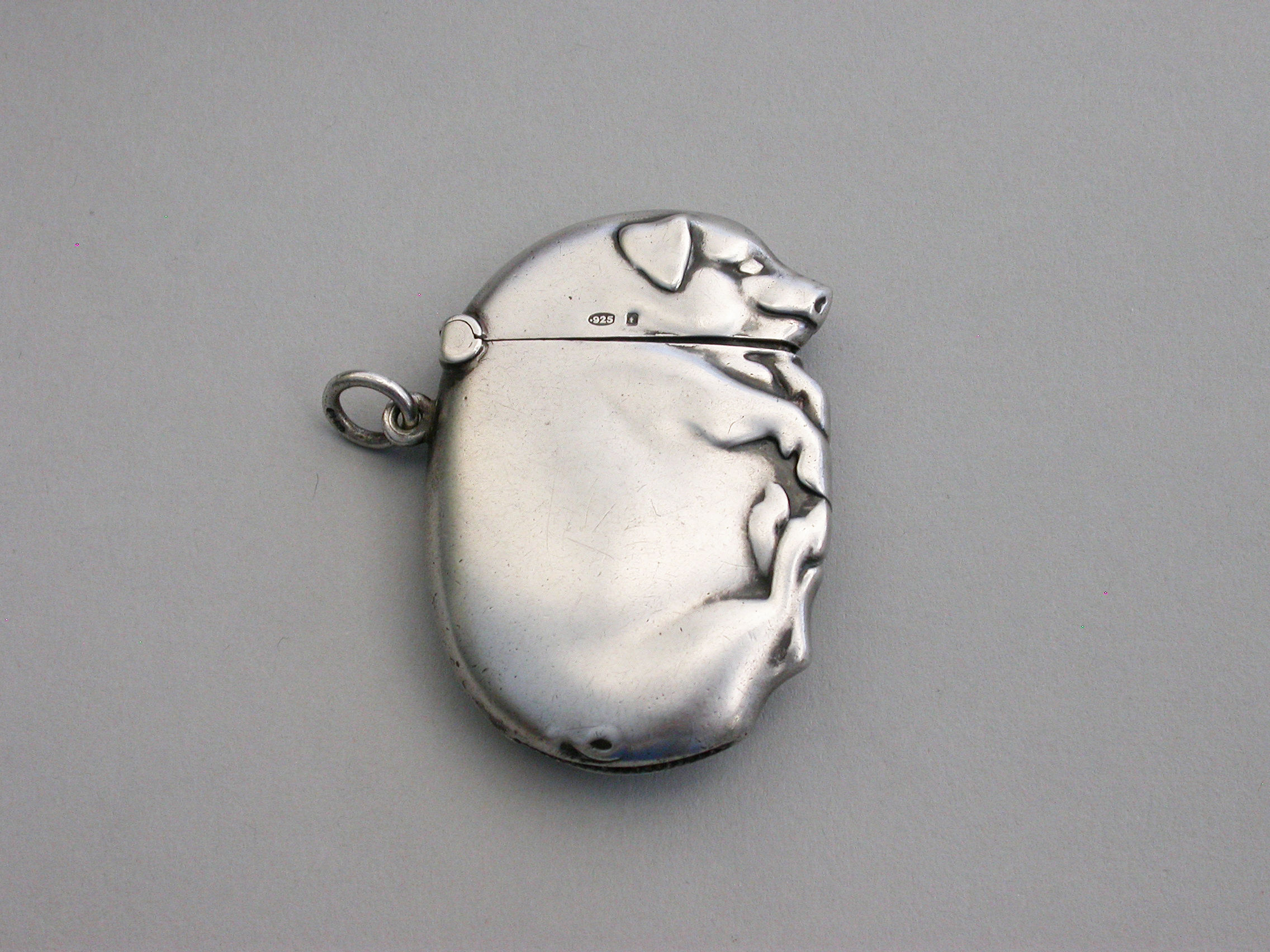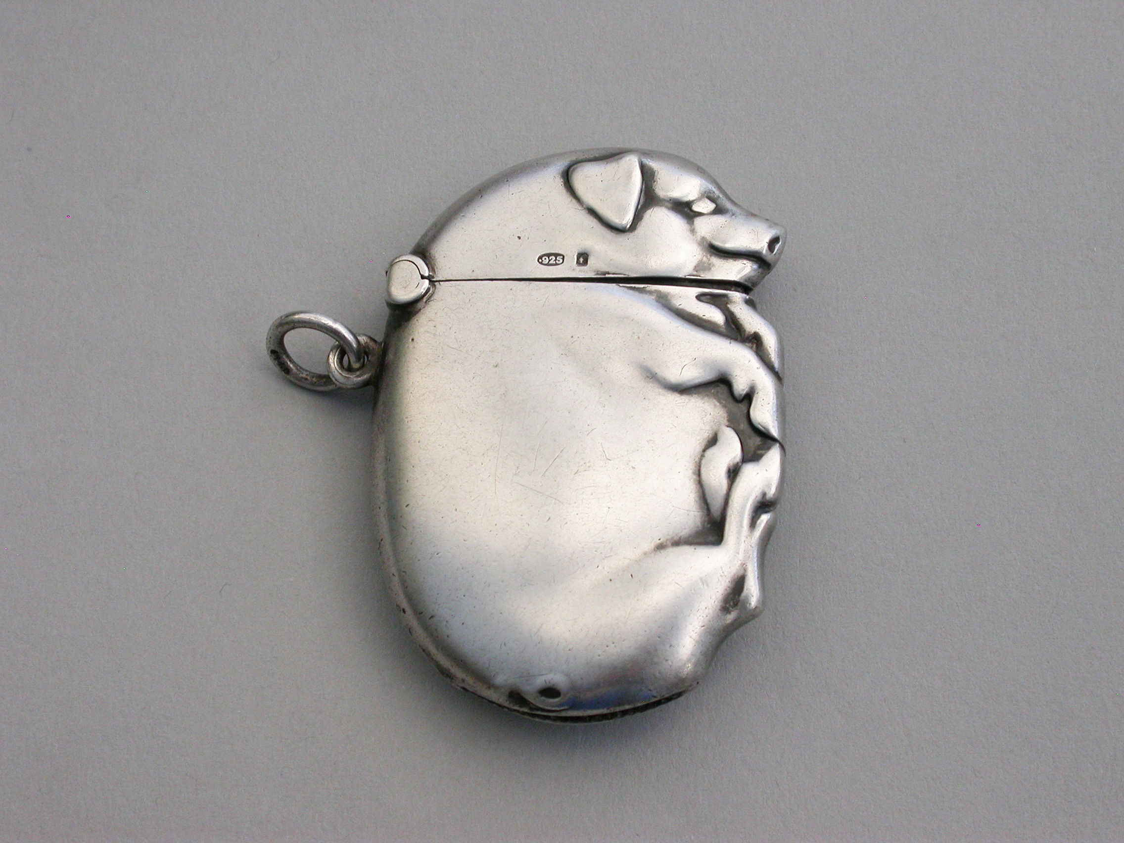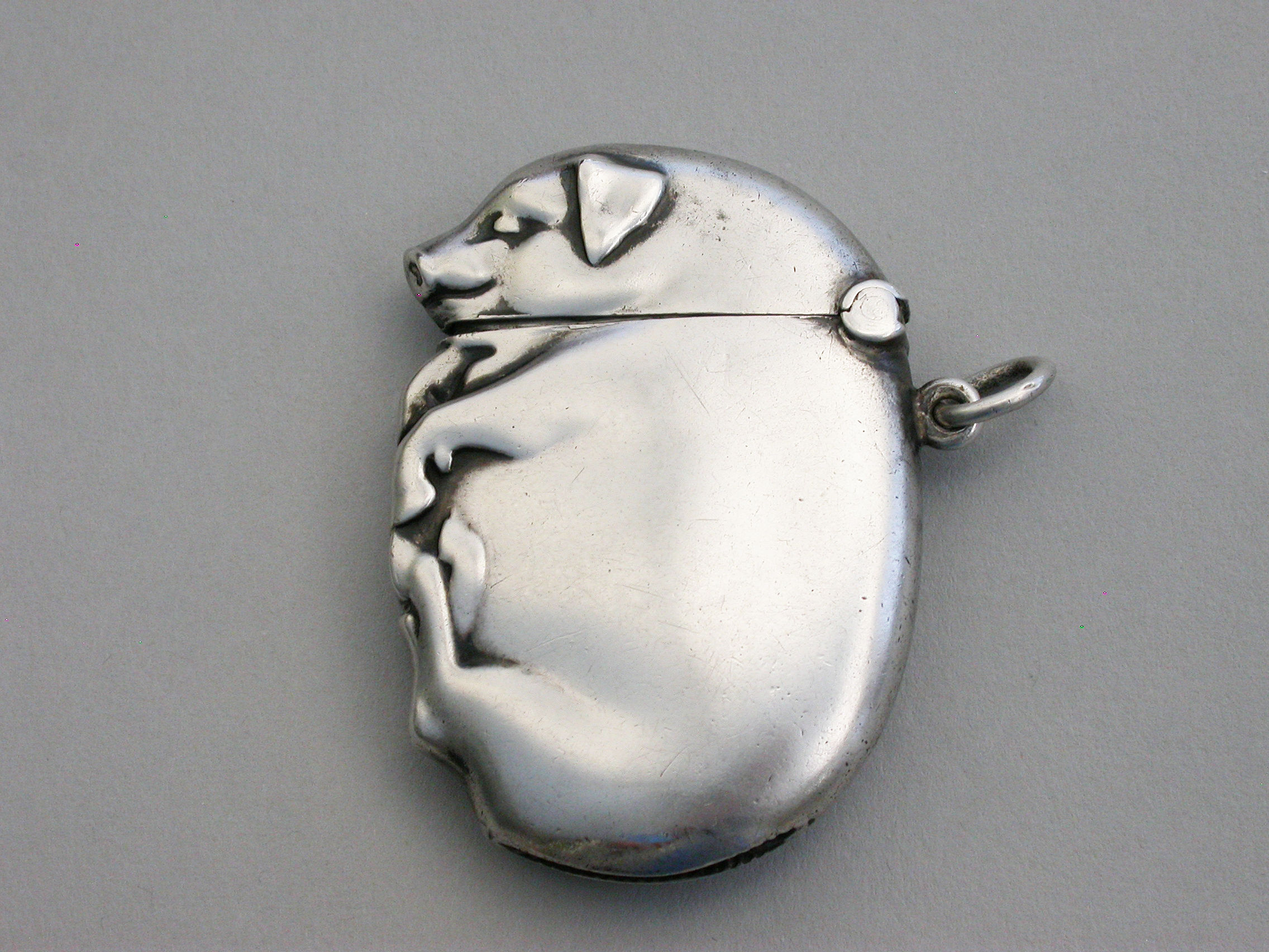 A good Edwardian Continental novelty silver Vesta Case made in the form of a flat sleeping pig, with hinged flip-top lid and attached suspension ring.