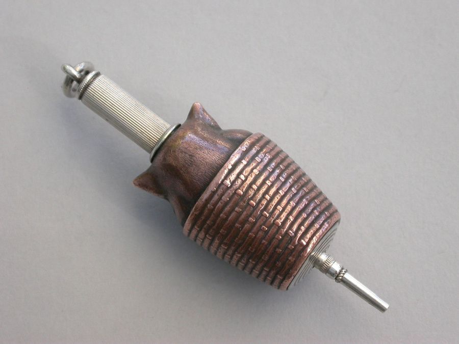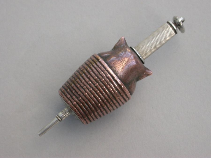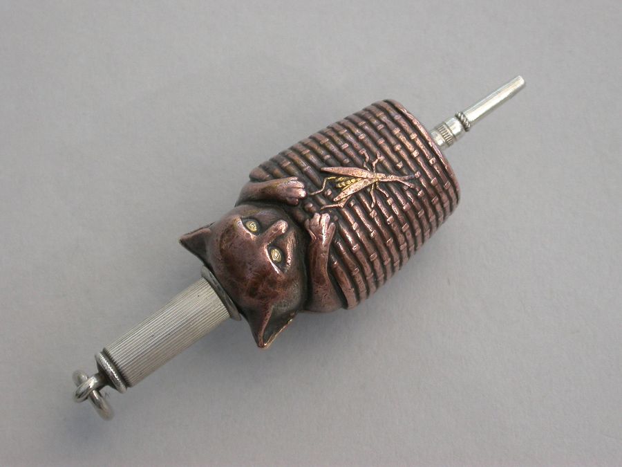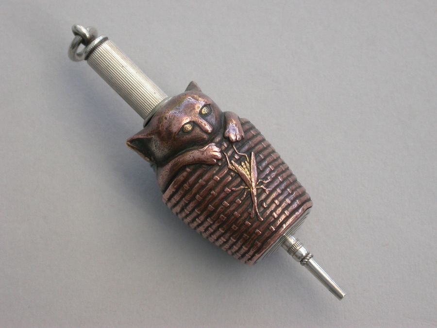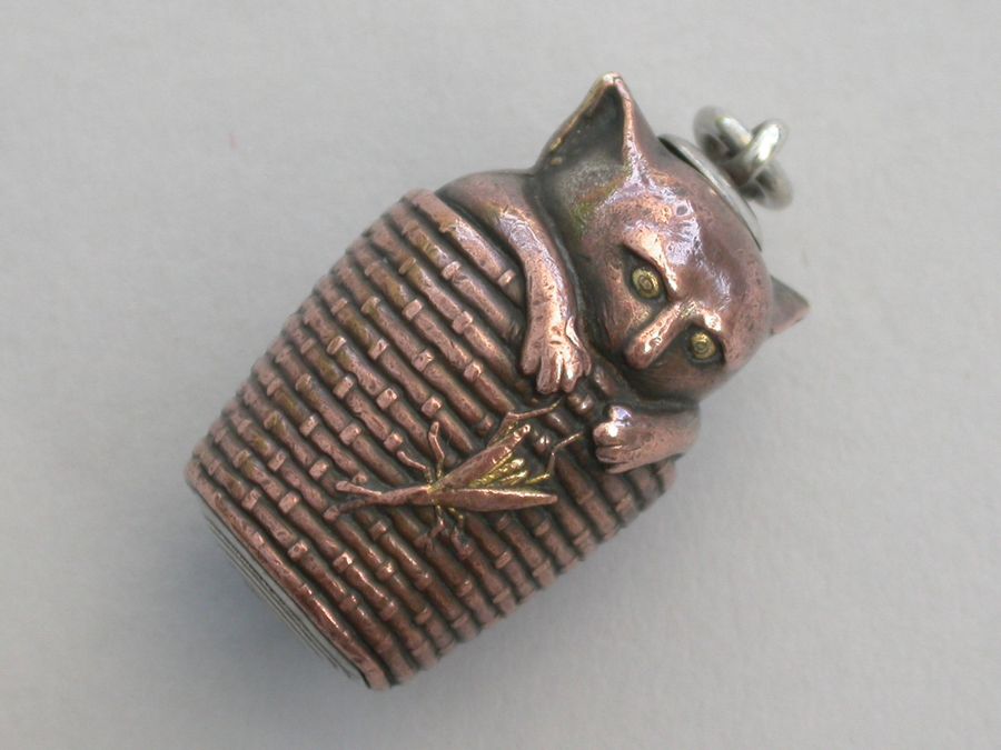 A fine quality continental, possibly Amercian, novelty mixed metals and silver Propelling Pencil, made in the form of a Cat in a wicker basket with an applied locust. The coppered silver body with gilded highlights.
