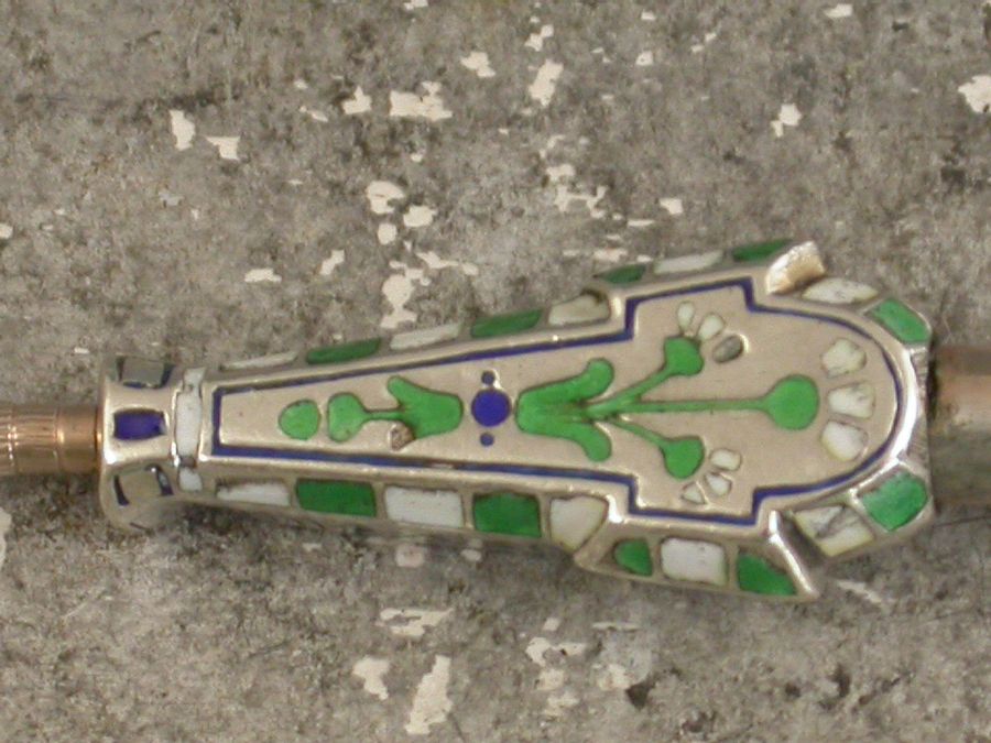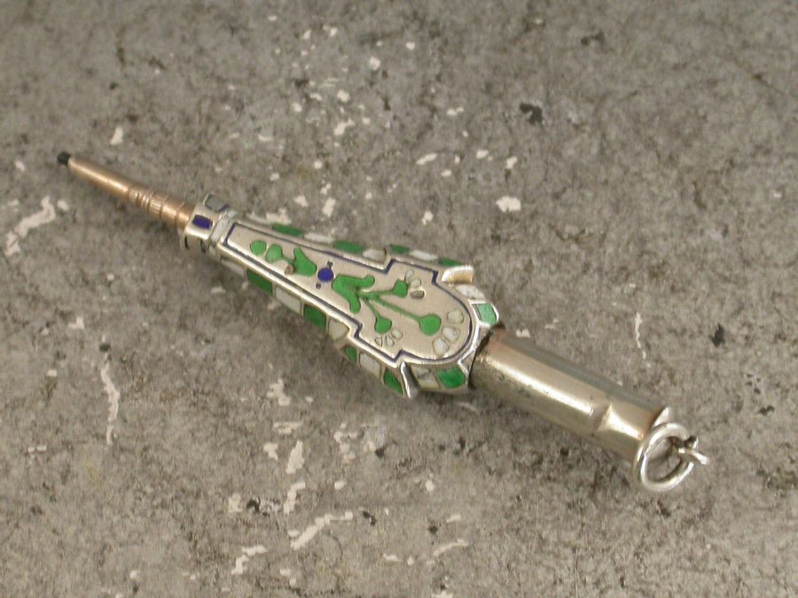 An early 20th century Continental silver and enamel novelty Propelling Pencil made in the form of an Egyptian Mummy, the body decorated with hieroglyphics and flowers in multi coloured enamels. Attached suspension ring.