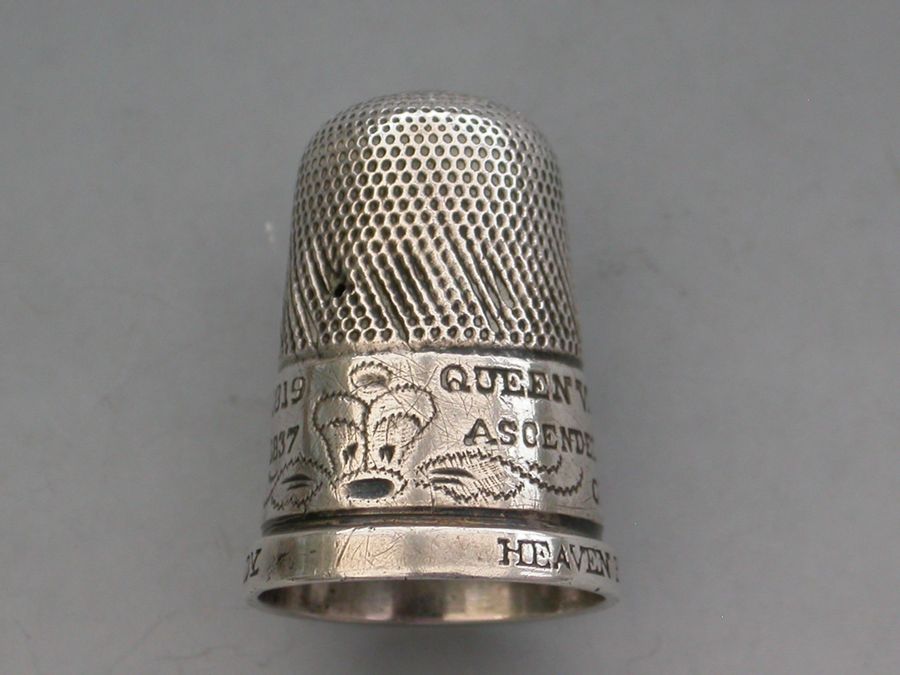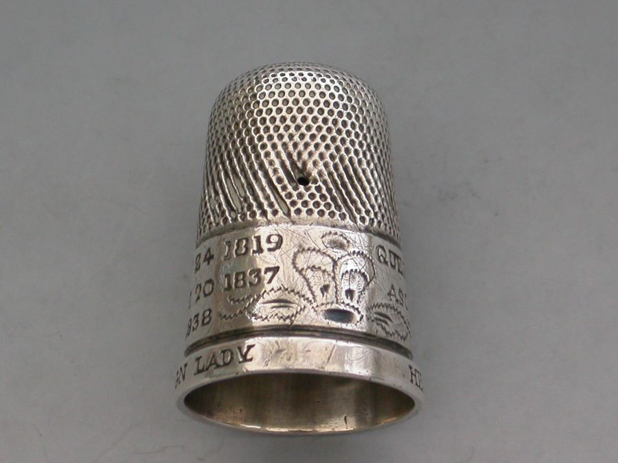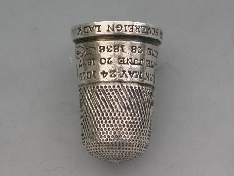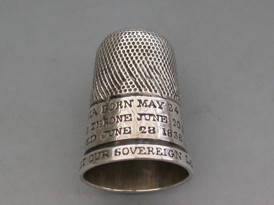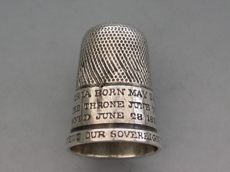 A Victorian silver Thimble made to Commemorate the Coronation of Queen Victoria on June 28th 1838. The plain border engraved with a Crown and 'Queen Victoria born May 24 1819, Ascended the thrown June 20 1837, Crowned June 28 1838'. ""Heaven protect our Sovereign Lady"" is stamped around the rim.