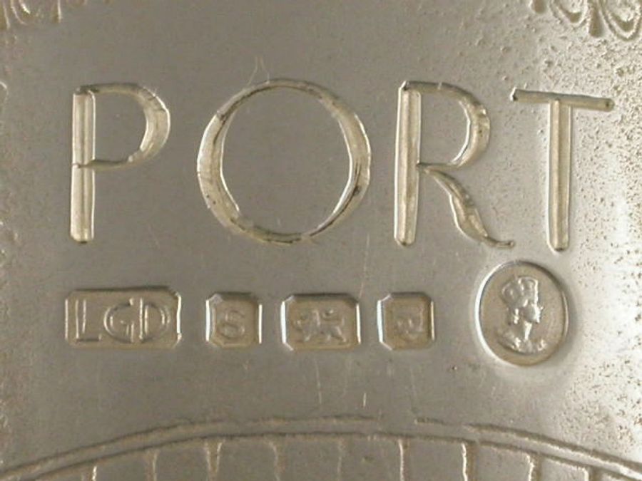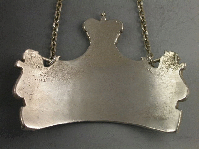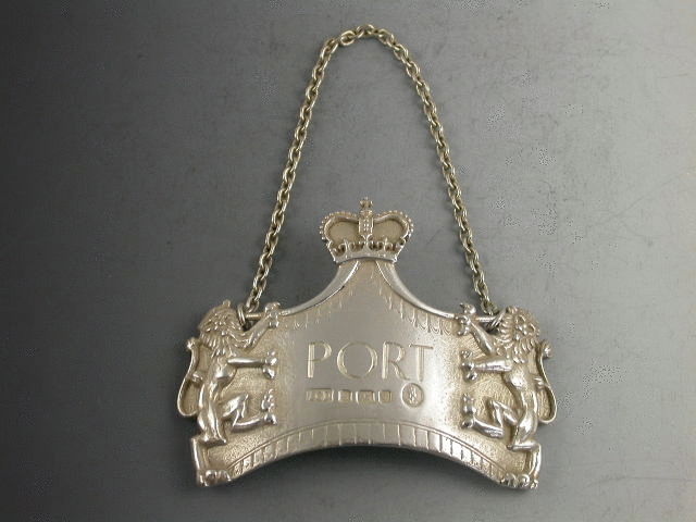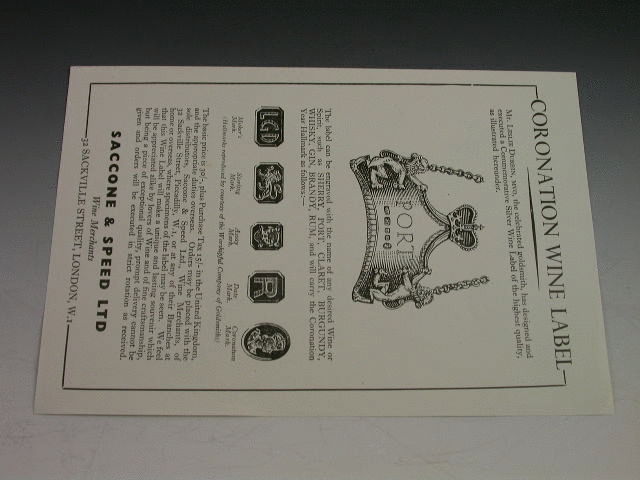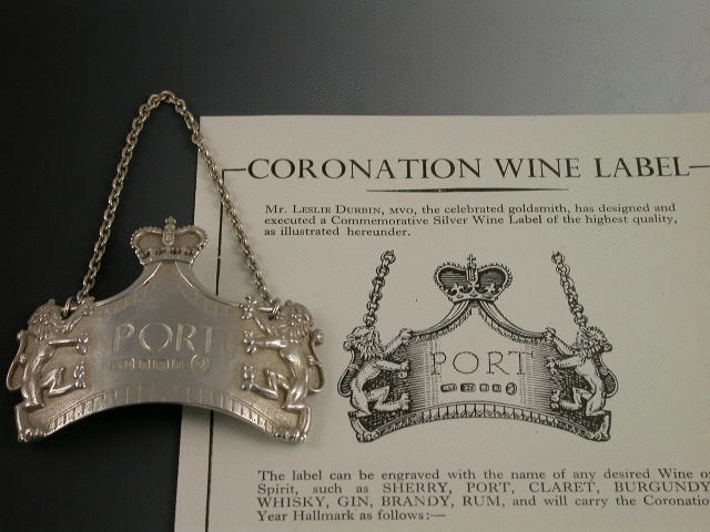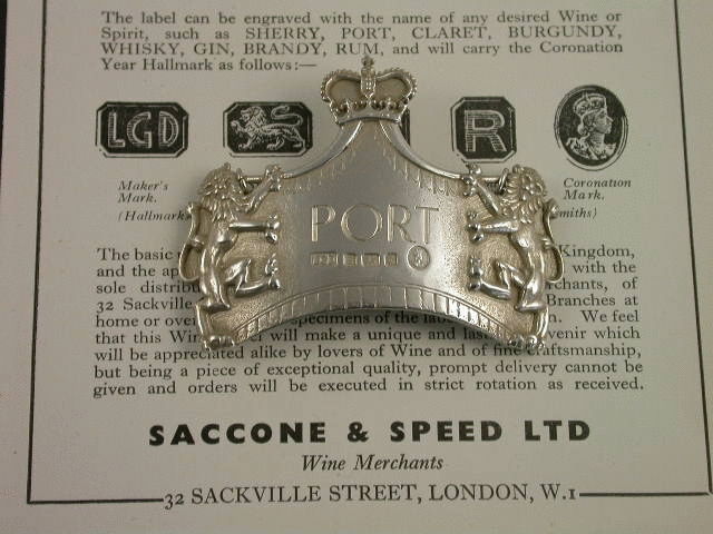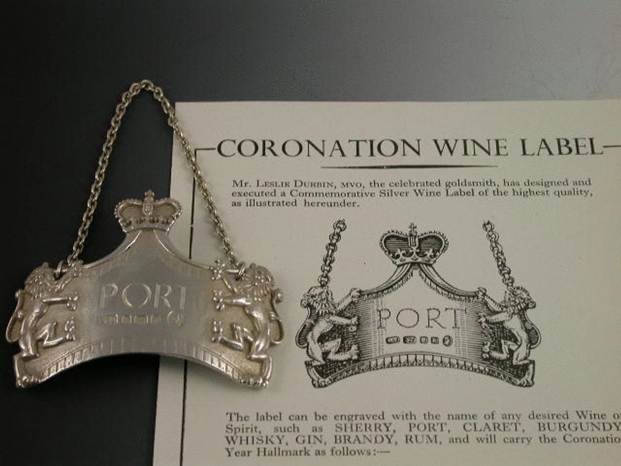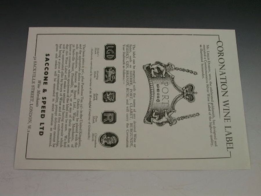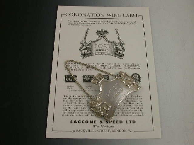 A rare and fine quality heavy cast silver Commemorative Wine Label incised for PORT, made to celebrate the Coronation of Queen Elizabeth II in 1953 and distributed by the Wine Merchants Saccone & Speed Ltd. The label is of curved rectangular form with central peak surmounted by the royal crown, with applied rampant lion supporters.Complete with the original 1950’s paper handbill advertising the label.