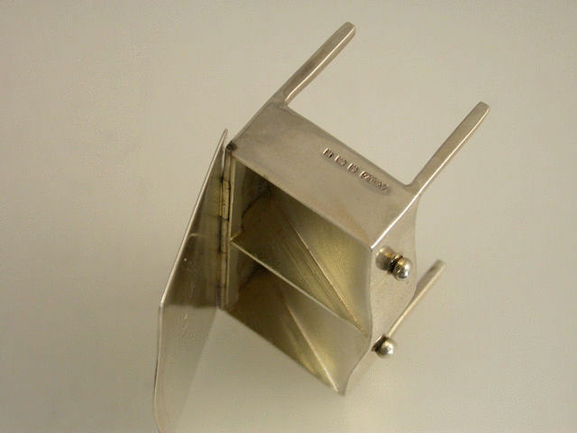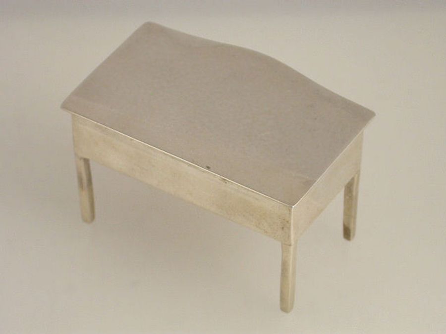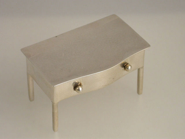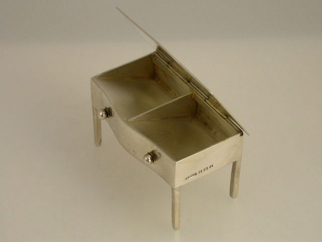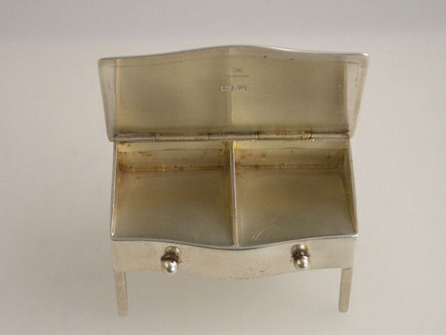 A rare Edwardian Novelty silver double compartment Stamp Box, made in the form of a serpentine fronted Sideboard standing on four tapered legs, the hinged lid opening to reveal two sloping compartments for stamps, light satin gilding.