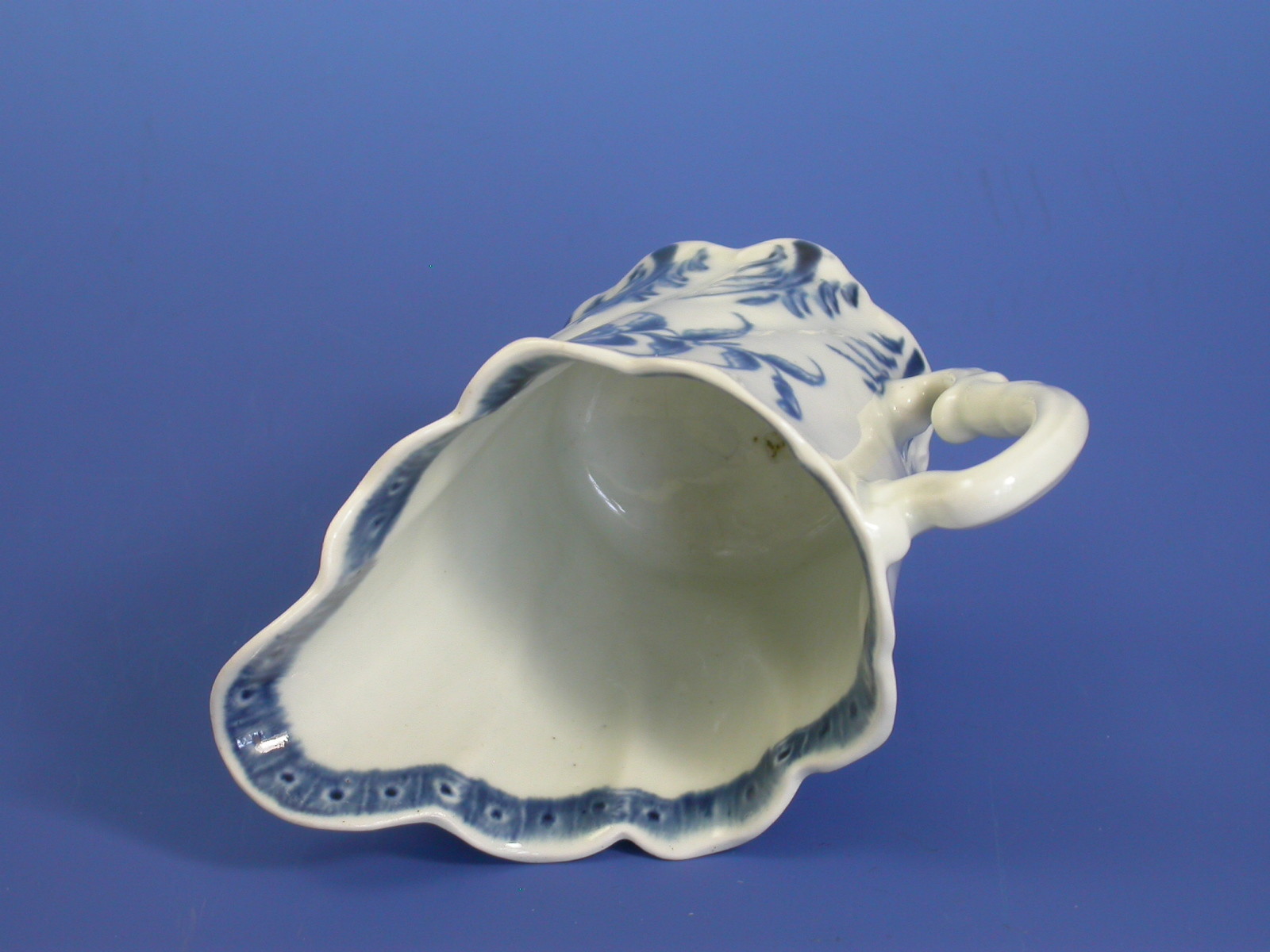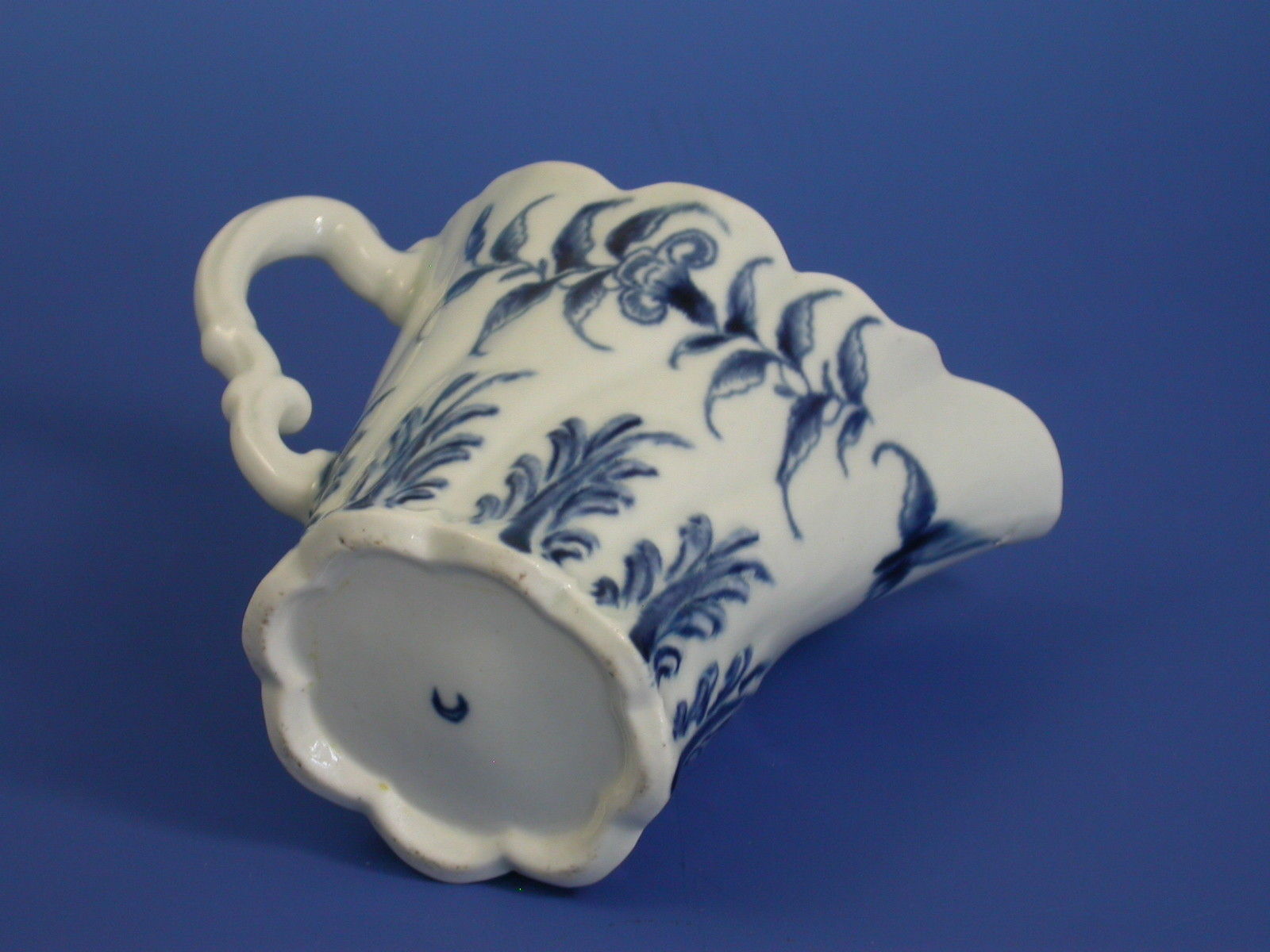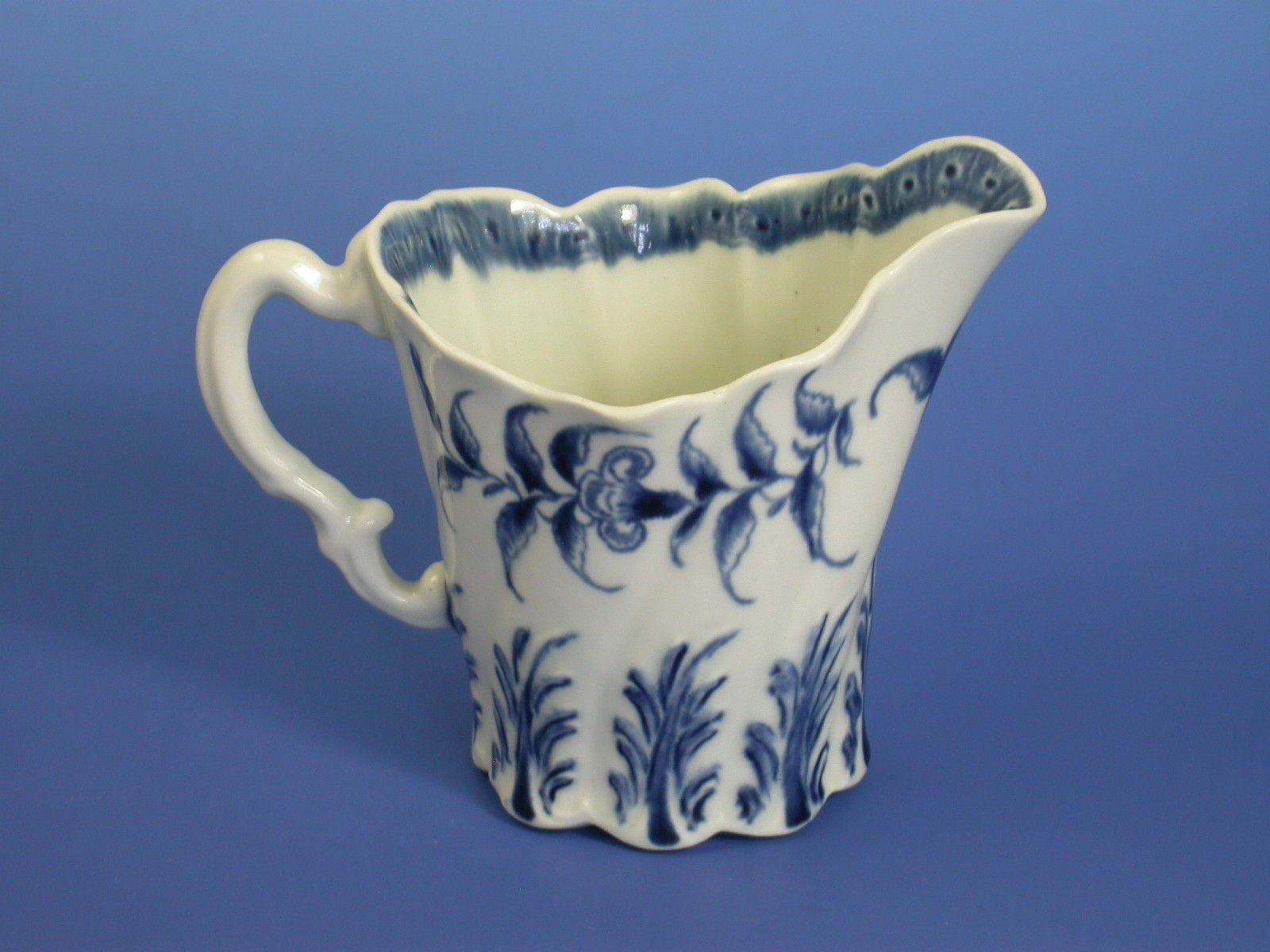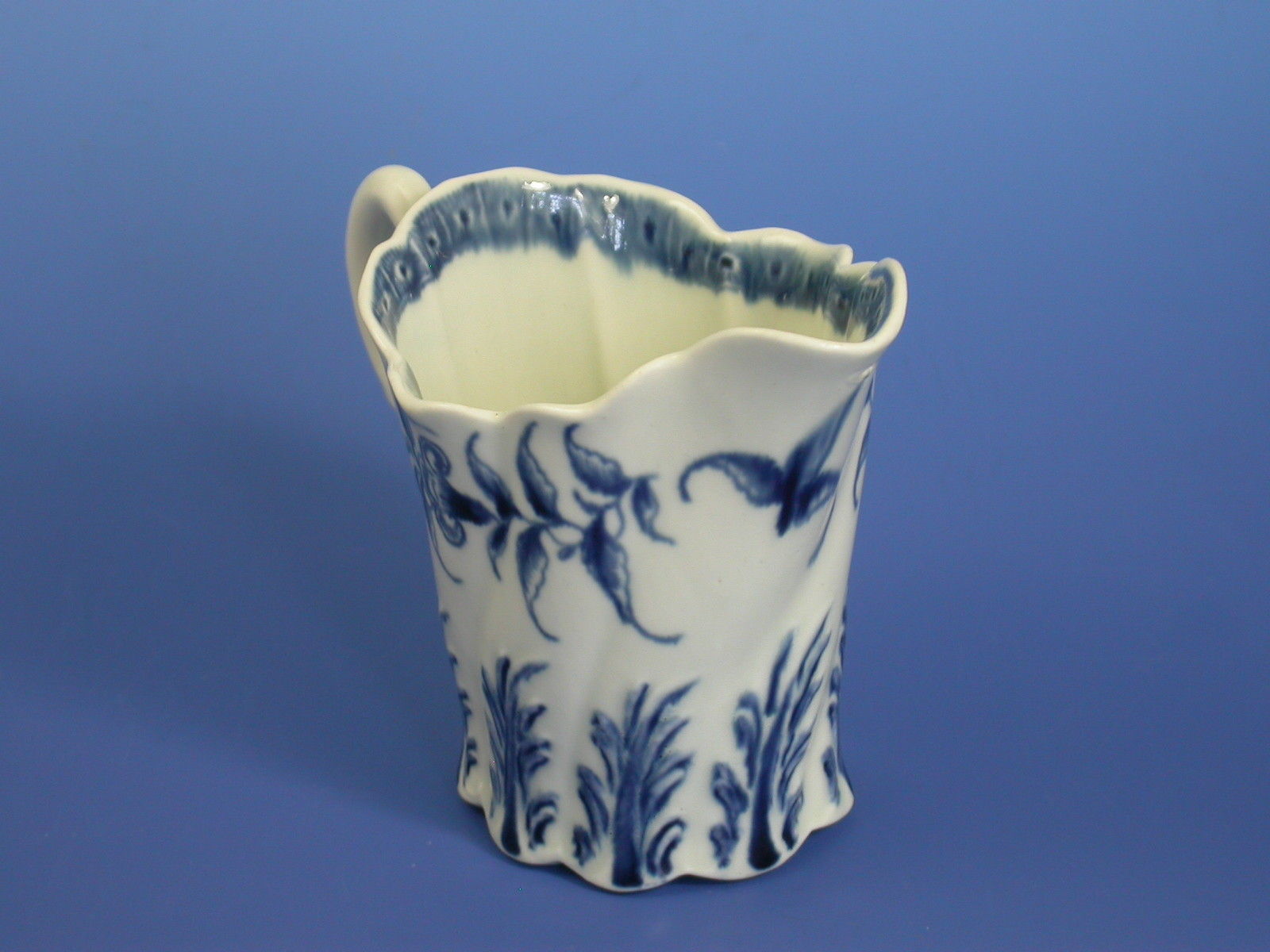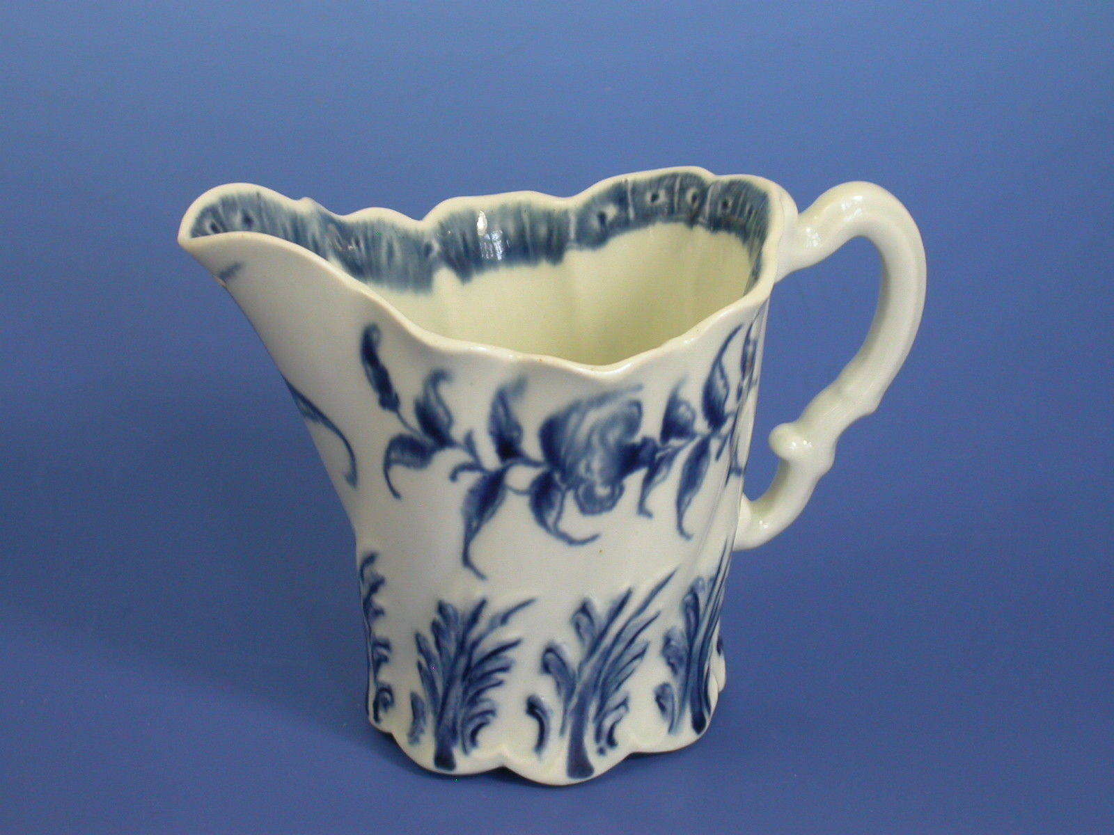An extremely rare Dr Wall Worcester Chelsea Ewer of moulded form with double scroll handle and moulded fern leaves around the base, highlighted in underglaze blue with leaves and a continuous foliate garland around the upper part of the Ewer and a flying bird under the lip. The interior with a hatched dot border. The Convolvulus pattern - IE38B in BFS Worcester Porcelain.