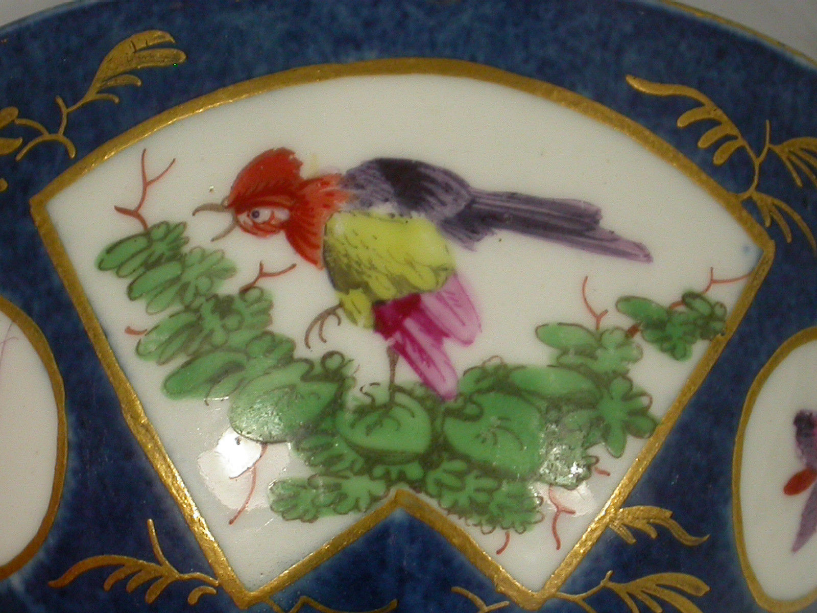 A fine Dr Wall Worcester Trio of Coffee Cup, Tea Bowl and Saucer, on gilt enriched powder blue ground, painted in the fan shaped panels with exotic birds in a landscape setting, alternating with circular reserves of insects, gilt line border.