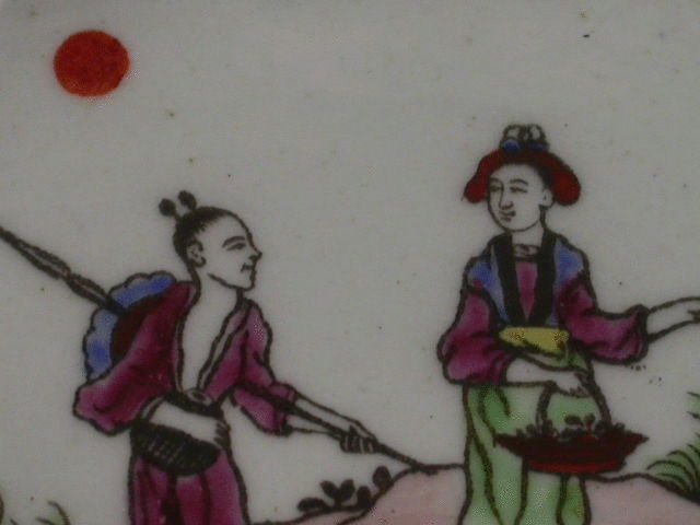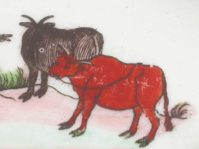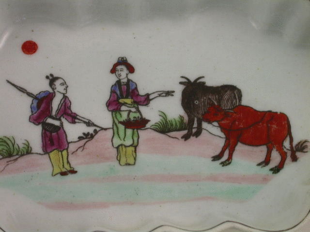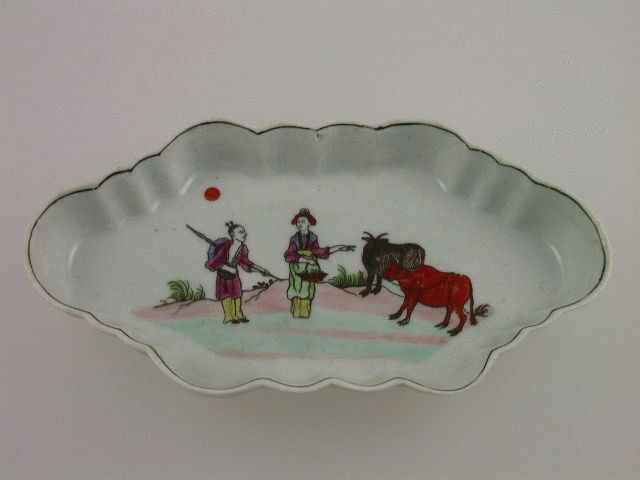 A very fine Dr Wall Worcester Spoon Tray of elongated hexagonal form, printed in outline and painted in enamel colours with the “Red Bull” pattern depicting two Chinese figures conversing with two bulls by their side and a rising sun in the background, within black line border.