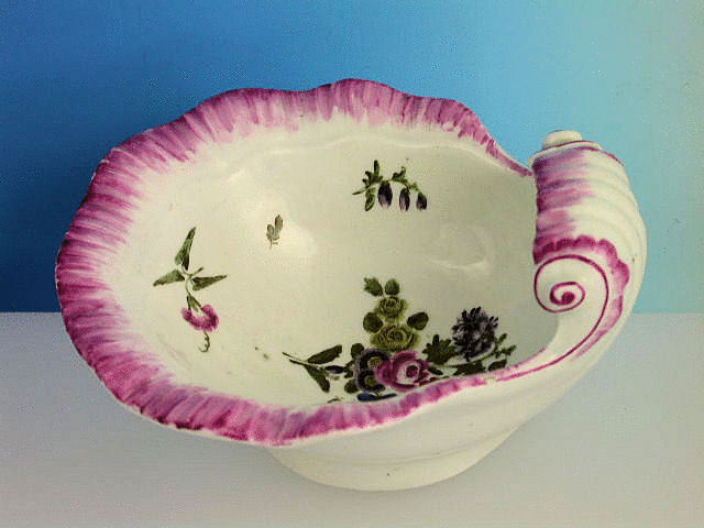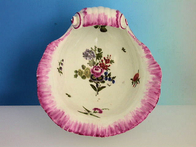 A fine Dr Wall Worcester moulded scallop shell Dish with high scroll handle, painted with a bouquet of English flowers and scattered floral sprigs within a puce camieau border.