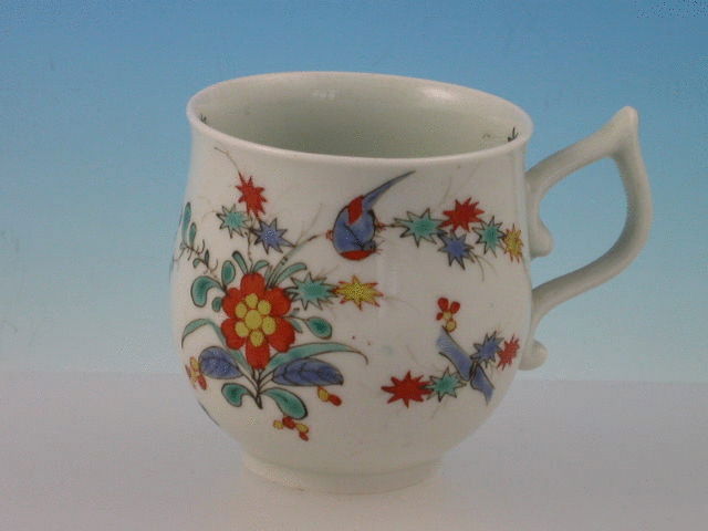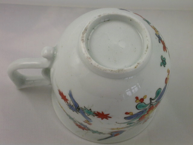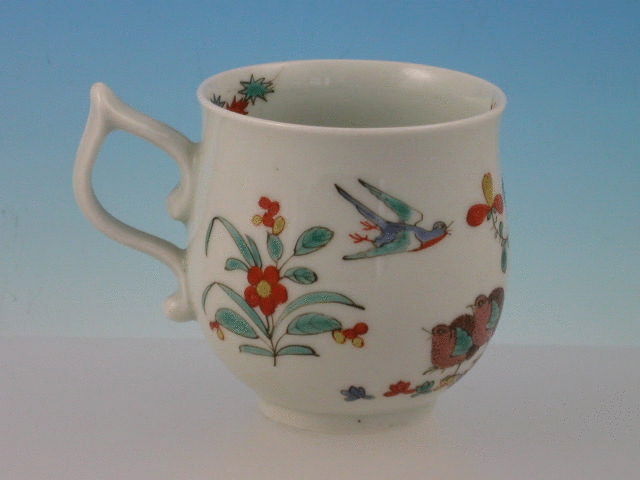 A fine and rare Dr Wall Worcester bell shaped Coffee Cup with wish bone handle, painted with a rare version of the “Two Quail” pattern direct from the Meisson original, the interior painted with two bamboo sprays. c1758-60.