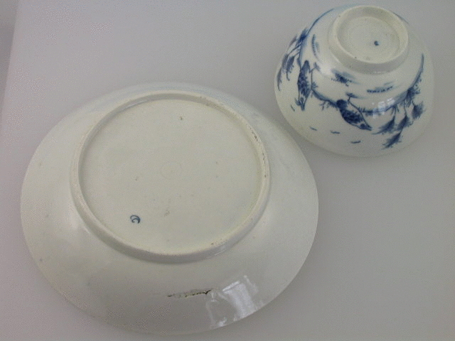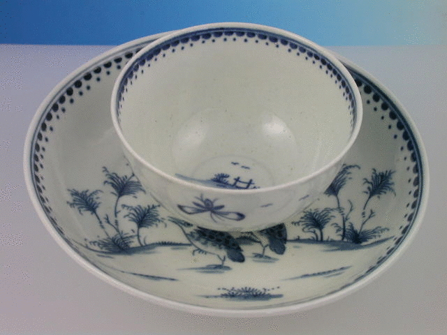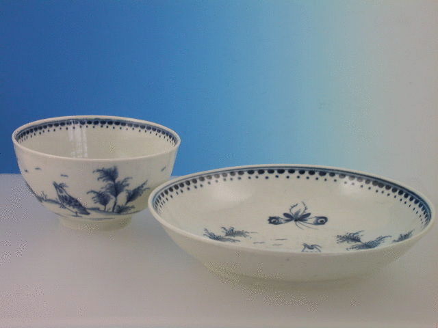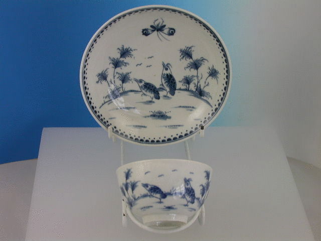 A fine Dr Wall Worcester Tea Bowl and Saucer, painted in under glazed blue with the “Two Quail” pattern, depicting two quail type birds grazing amongst grasses with a large insect overhead, all within a line and dot border. c1772.