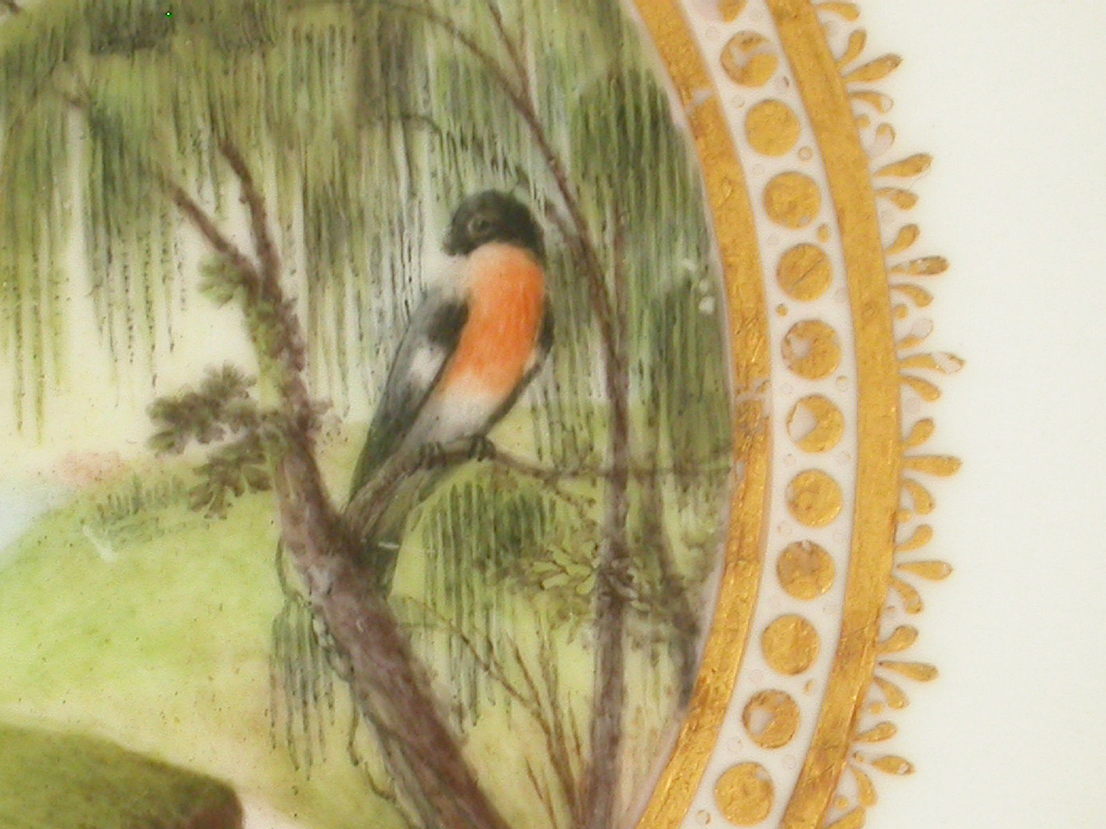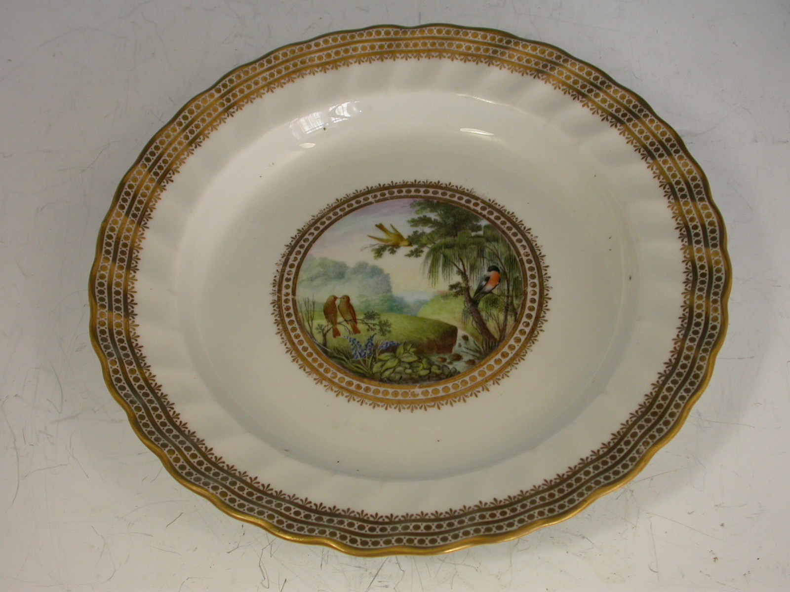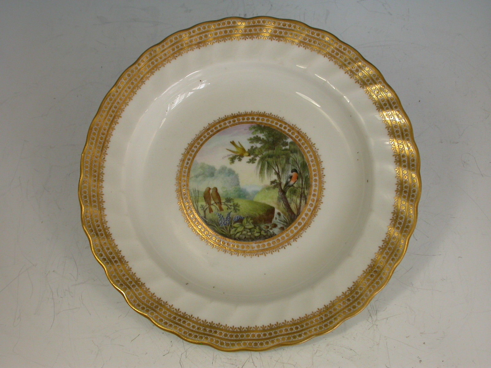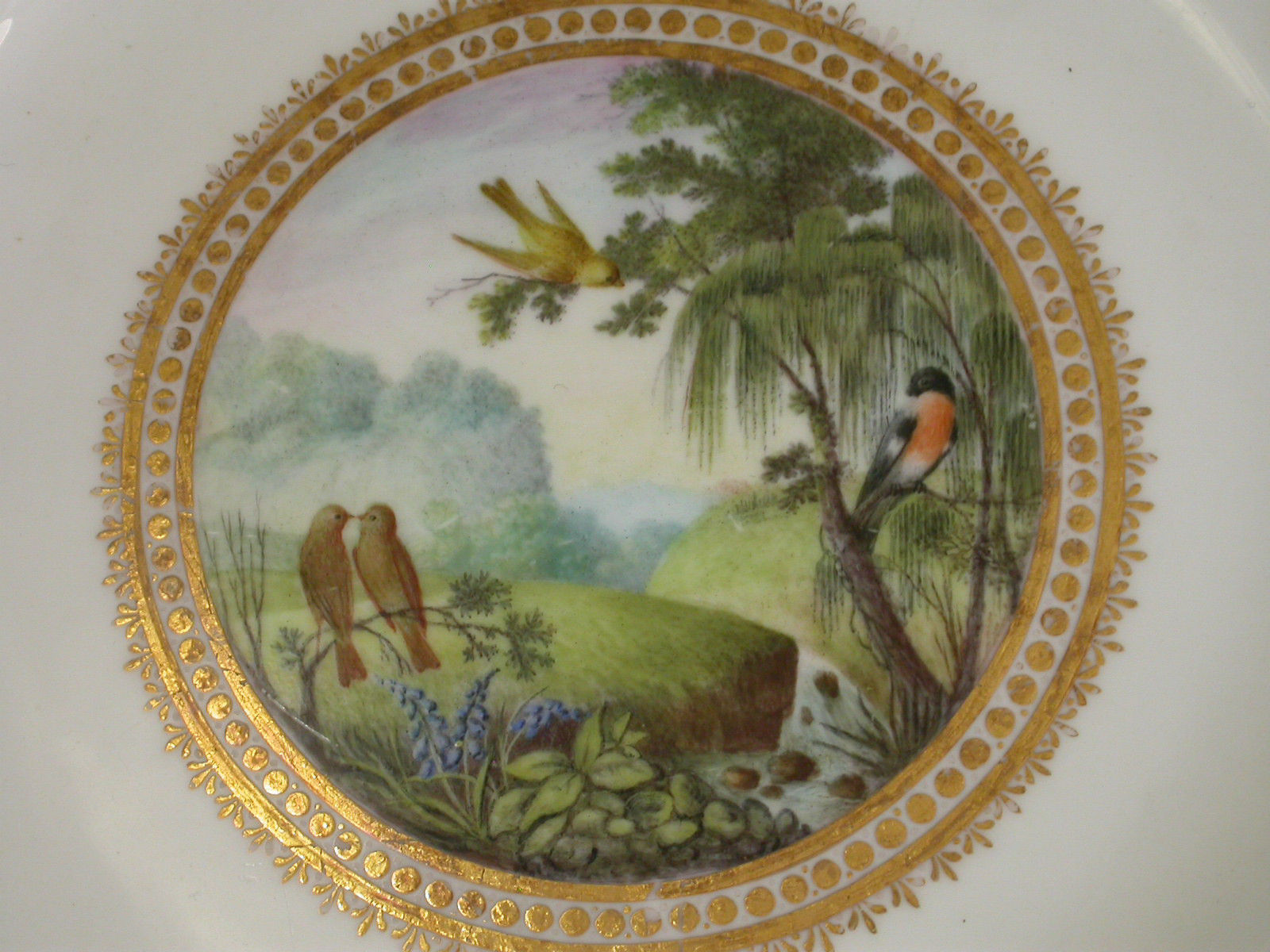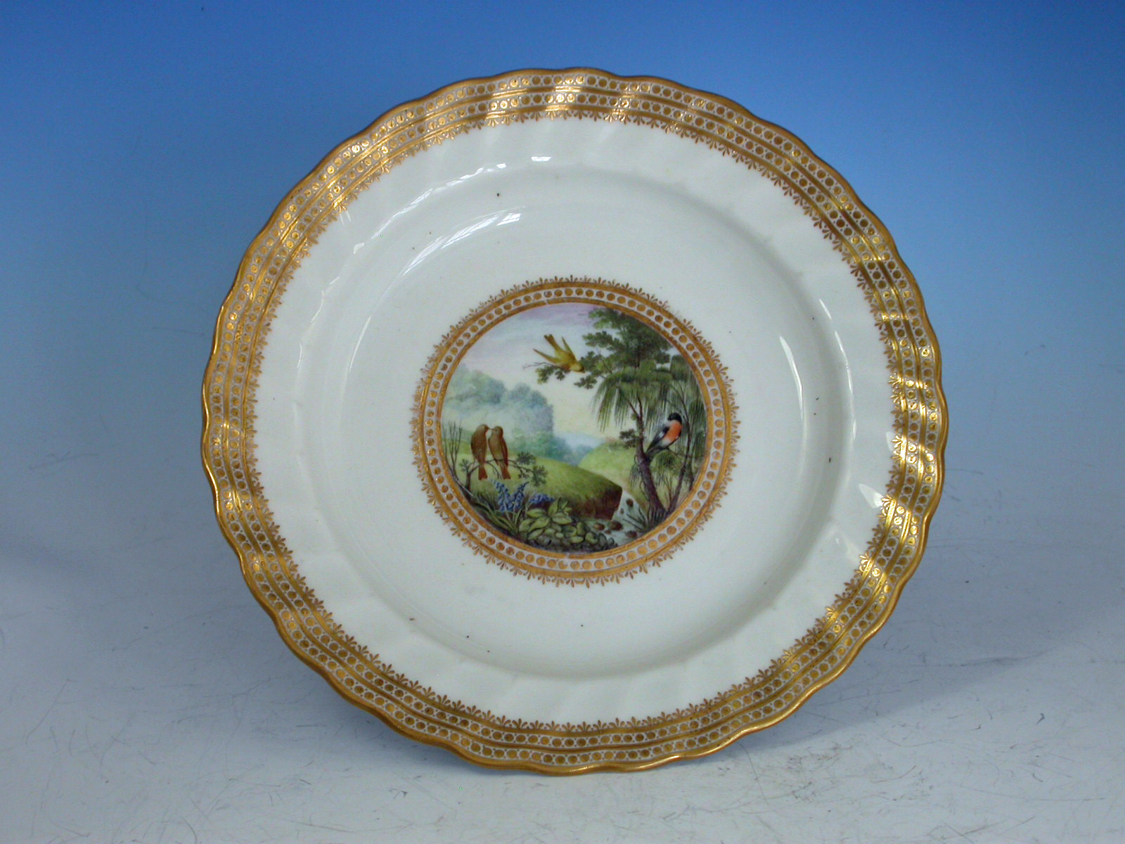 A fine Duesbury Derby Dessert Plate of faceted form, painted in the central gilt enriched circular reserve with naturalistic birds perched in branches, including a bullfinch and green finches, a meandering river flowing through the dales with high peaks in the background, by George Compin. All within a concentric gilt dot and arrow head border.