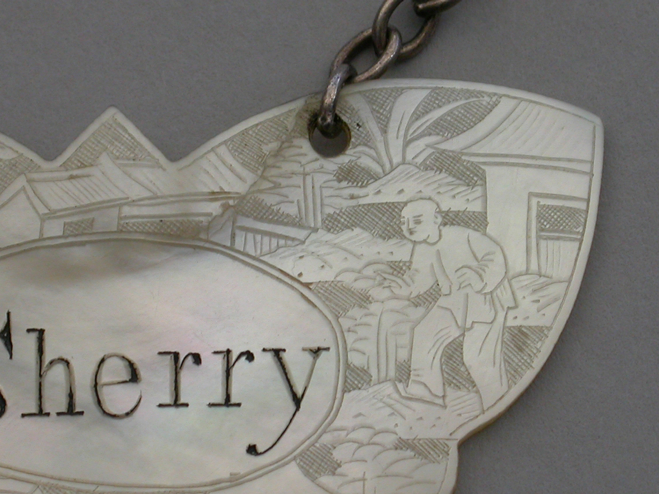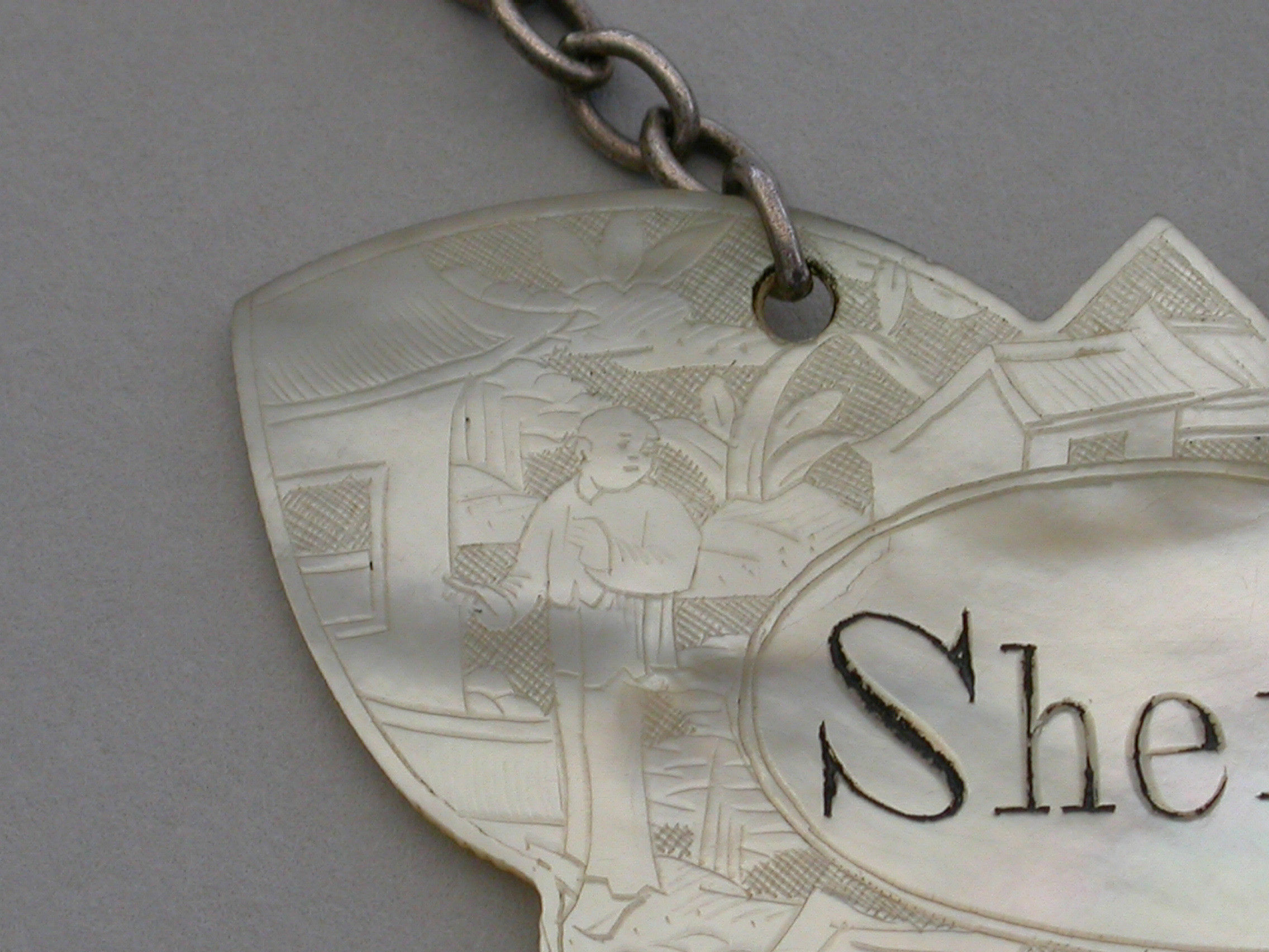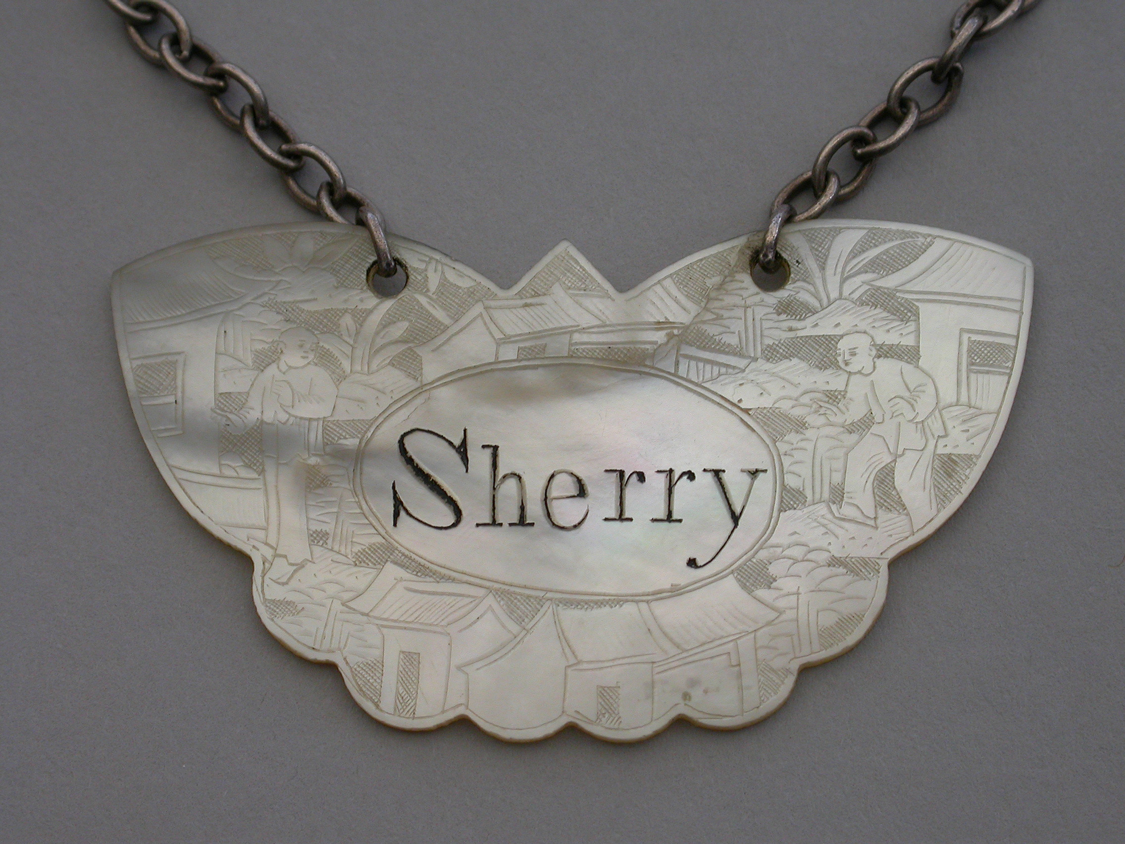 An early 19th century Chinese Export Mother of Pearl Wine Label made in the form of a butterfly and carved with oriental figures in landscape scenes surrounding a name plate engraved for Sherry.