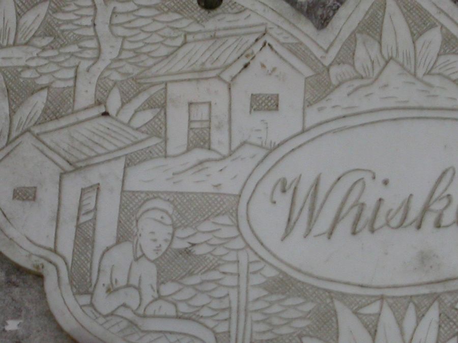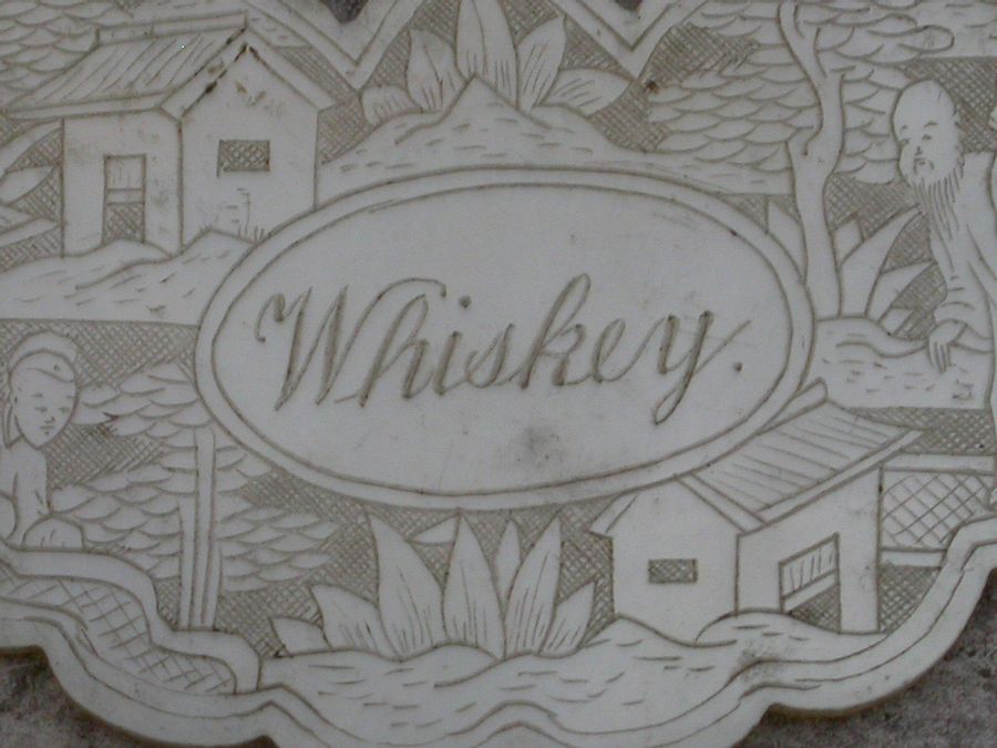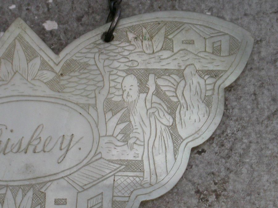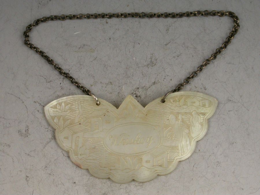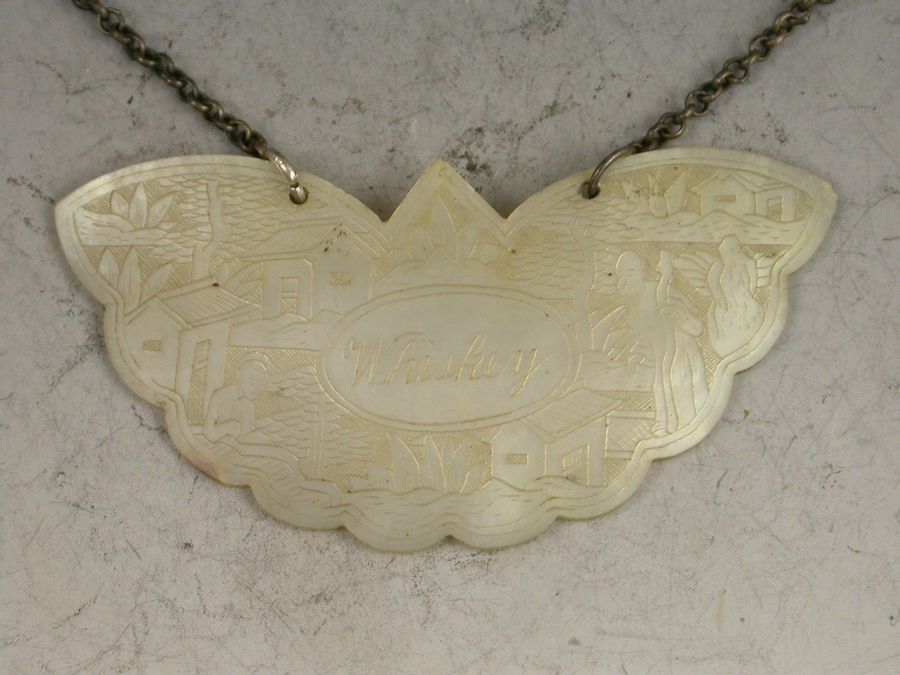 An early 19th century Chinese Export Mother of Pearl Wine Label made in the form of a butterfly and carved with oriental figures in landscape scenes surrounding a name plate engraved for Whiskey.