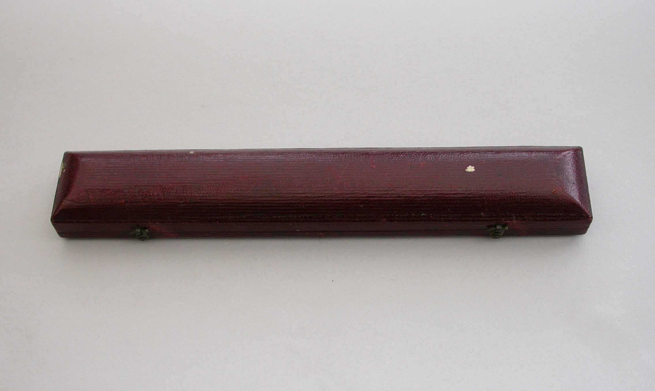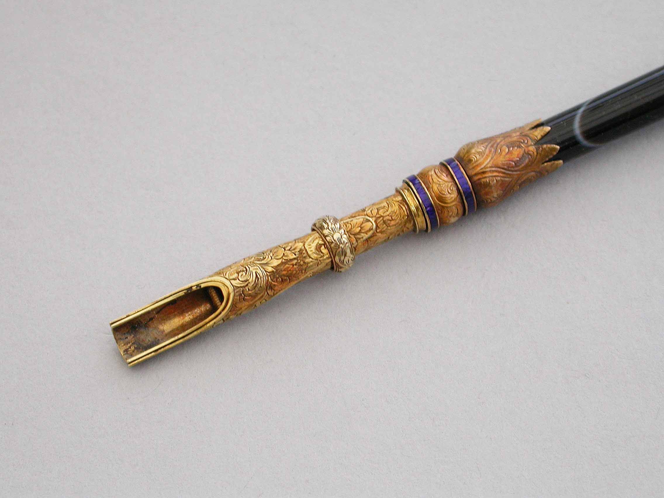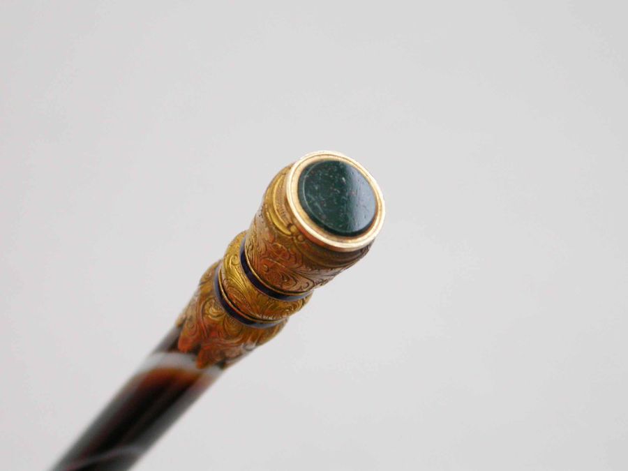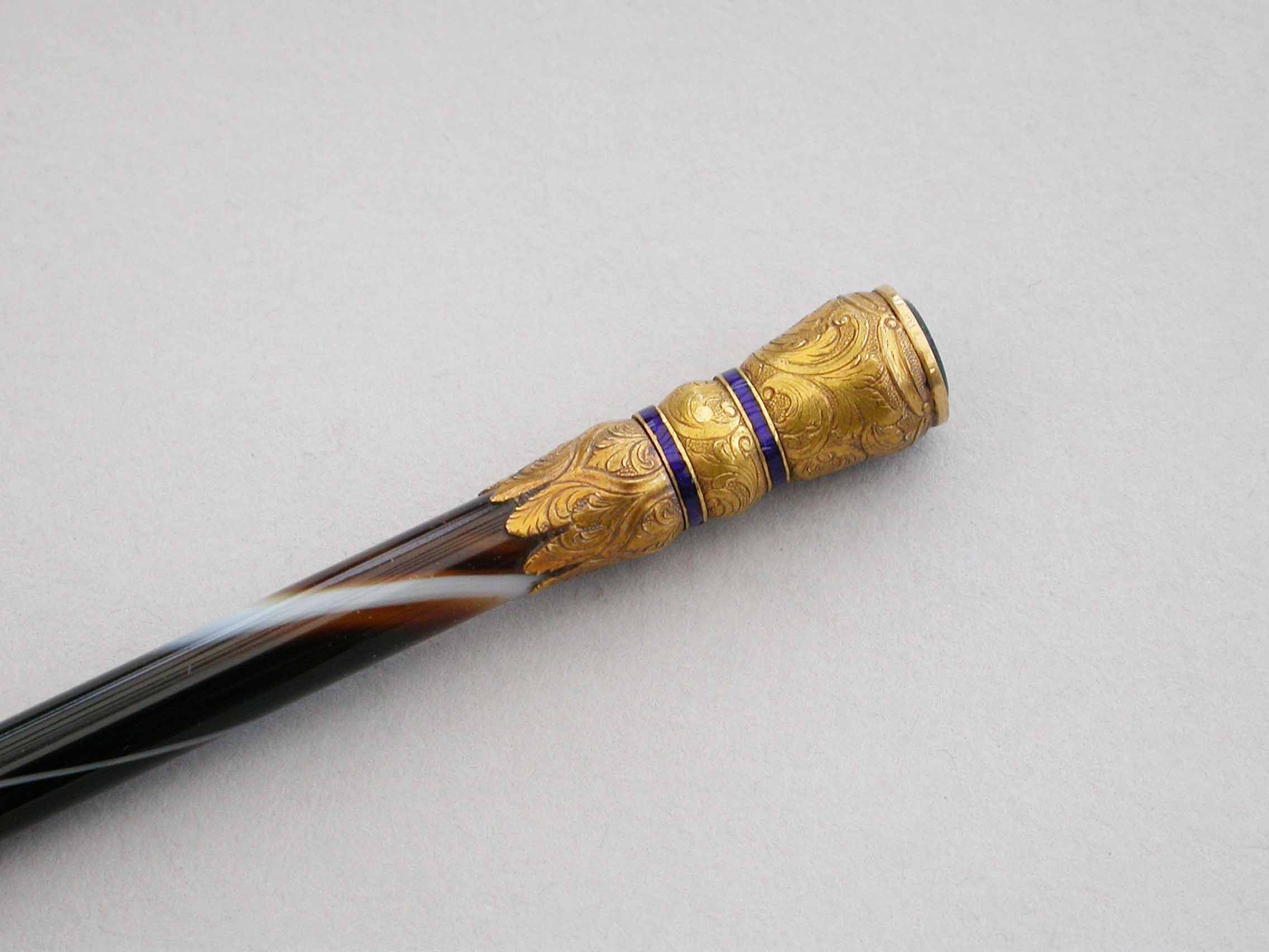A fine quality cased early 19th Century French gold mounted striated agate Dip Pen, the gold mounts with royal blue enamel bands and a 'Bramah' type nib holder, the terminal set with a bloodstone seal stone.