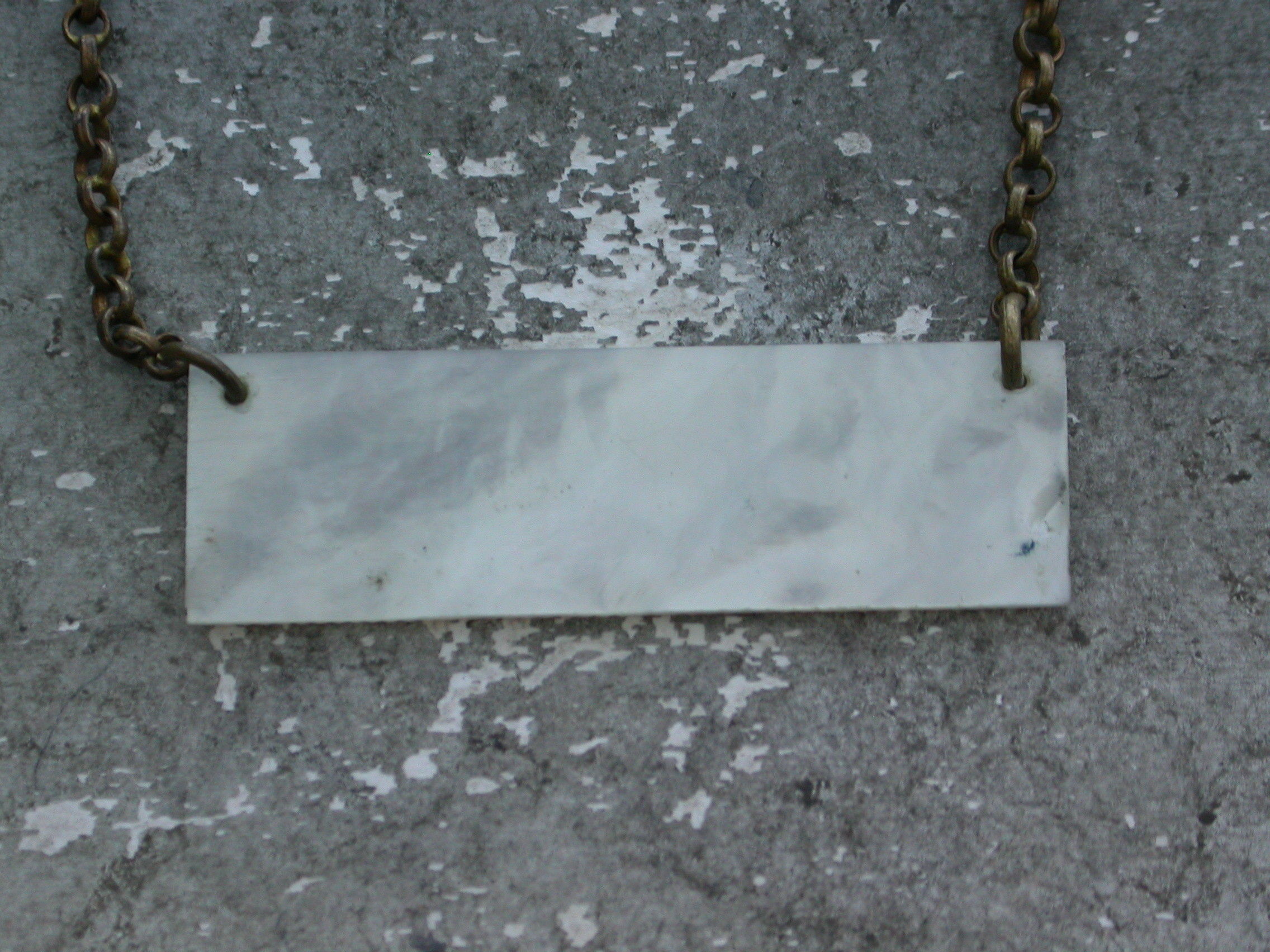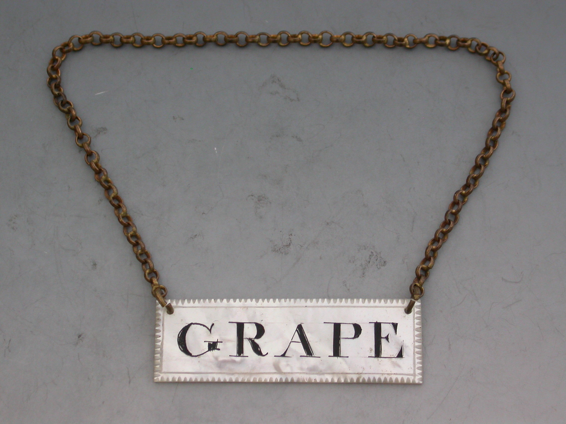 A rare early 19th century Mother of Pearl Wine Label of narrow rectangular form with engraved border, incised and niello filled for Grape. Gilt metal suspension chain.