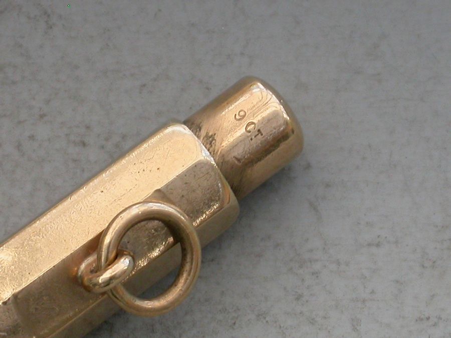 Unmarked, but stamped 9ct. Almost certainly by Sampson Mordan & Co, c1920