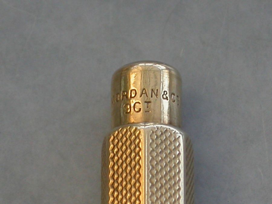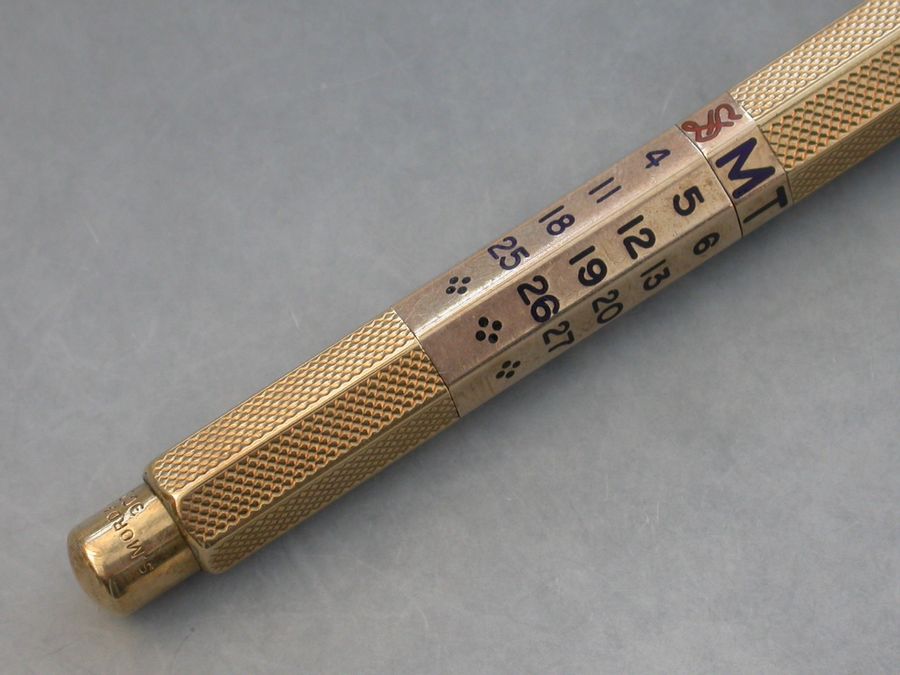 A good quality early 20th century 9 carat gold and enamel Propelling Pencil with push button ""Gravity Drop"" opening mechanism, the engine turned octagonal body with integral swivelling perpetual calender with enamelled numbers and letters for days of the week, Sunday in red.
